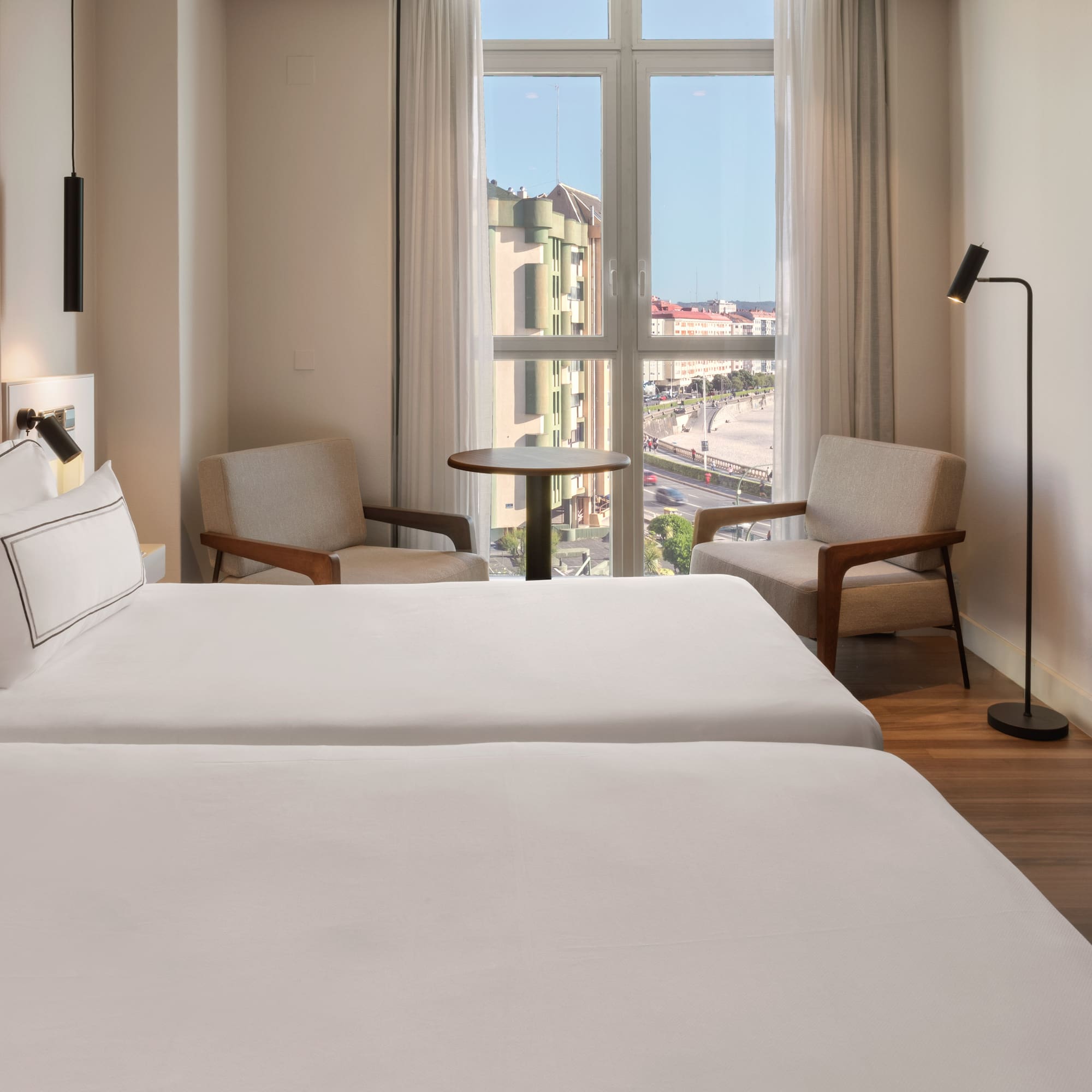 Elegance and brightness with sea views. An elegant room with a bedroom from which to admire Orzán Bay and the seafront promenade. Relax in a full bathroom with products by Rituals and enjoy unique experiences on the A Coruña coast.