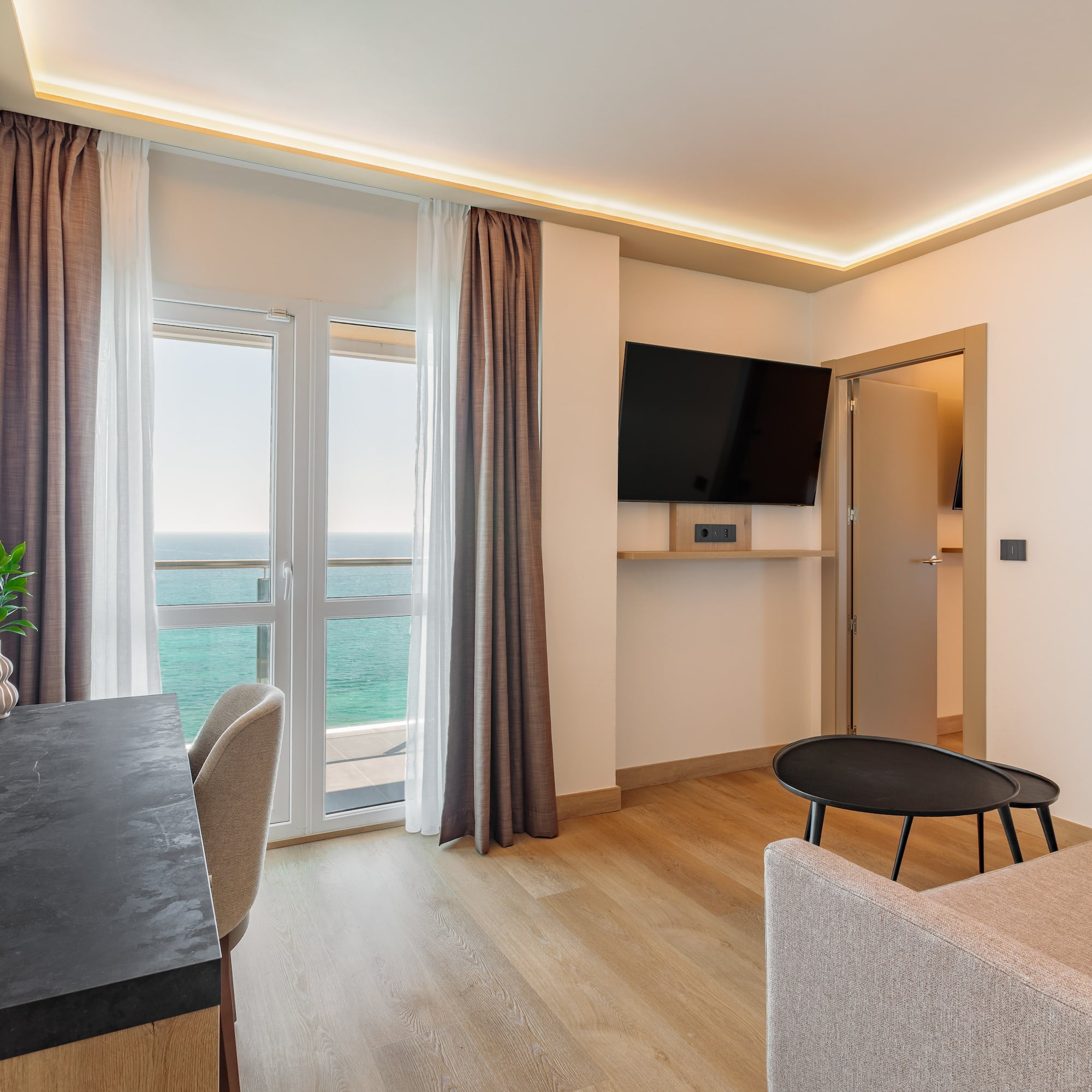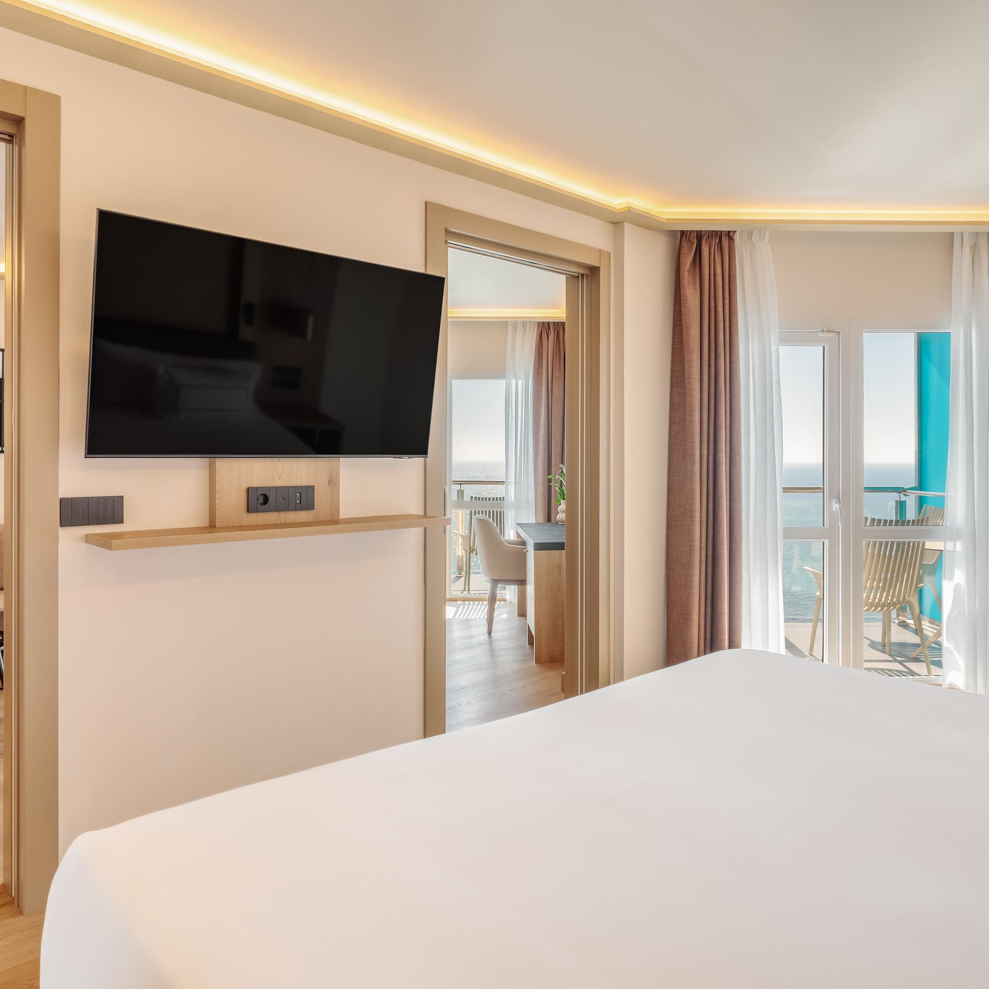 استمتع بالجوهر الكامل للبحر في هذا الجناح المطل على البحر. بتصميم أنيق ومتطور، يوفر غرفة نوم واسعة وصالة مع سرير أريكة. غرف مخصصة فقط للبالغين (بعمر 18 سنة أو أكثر).