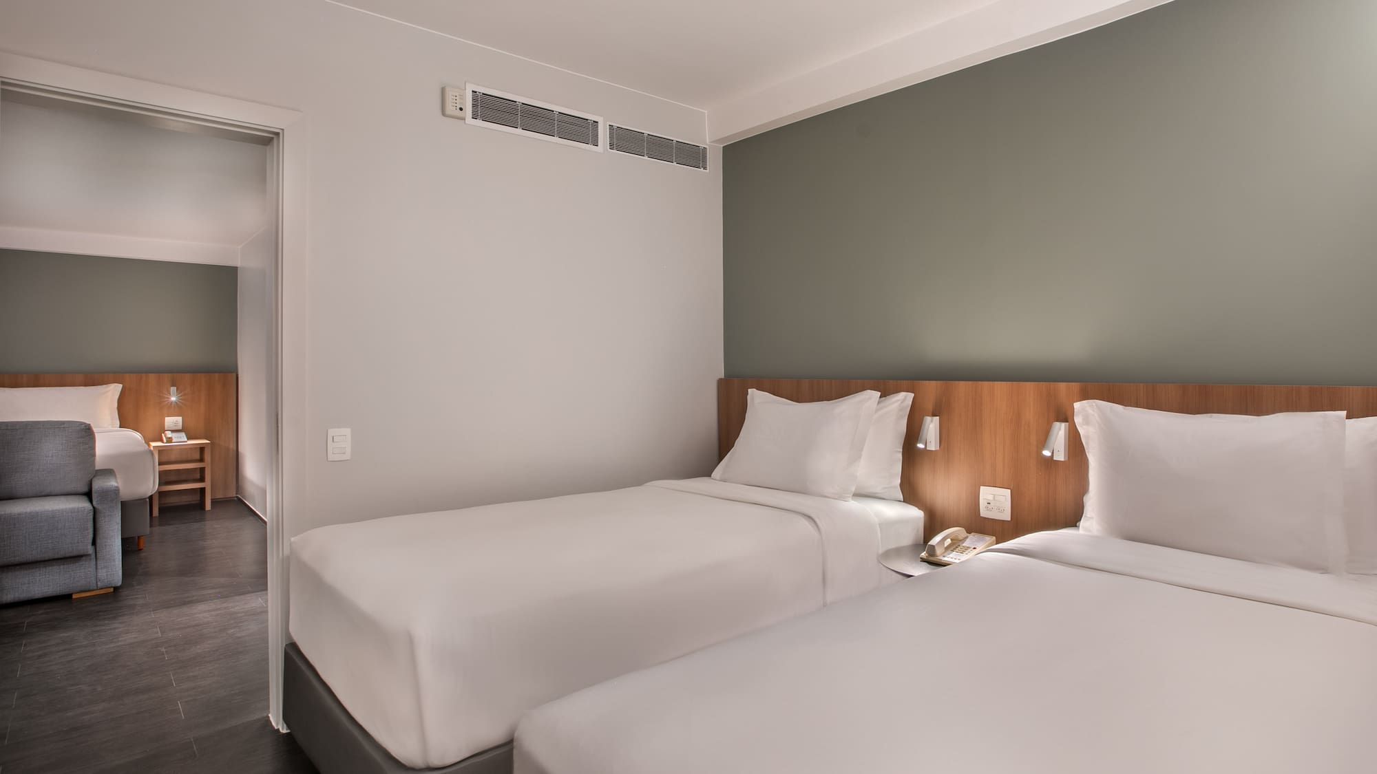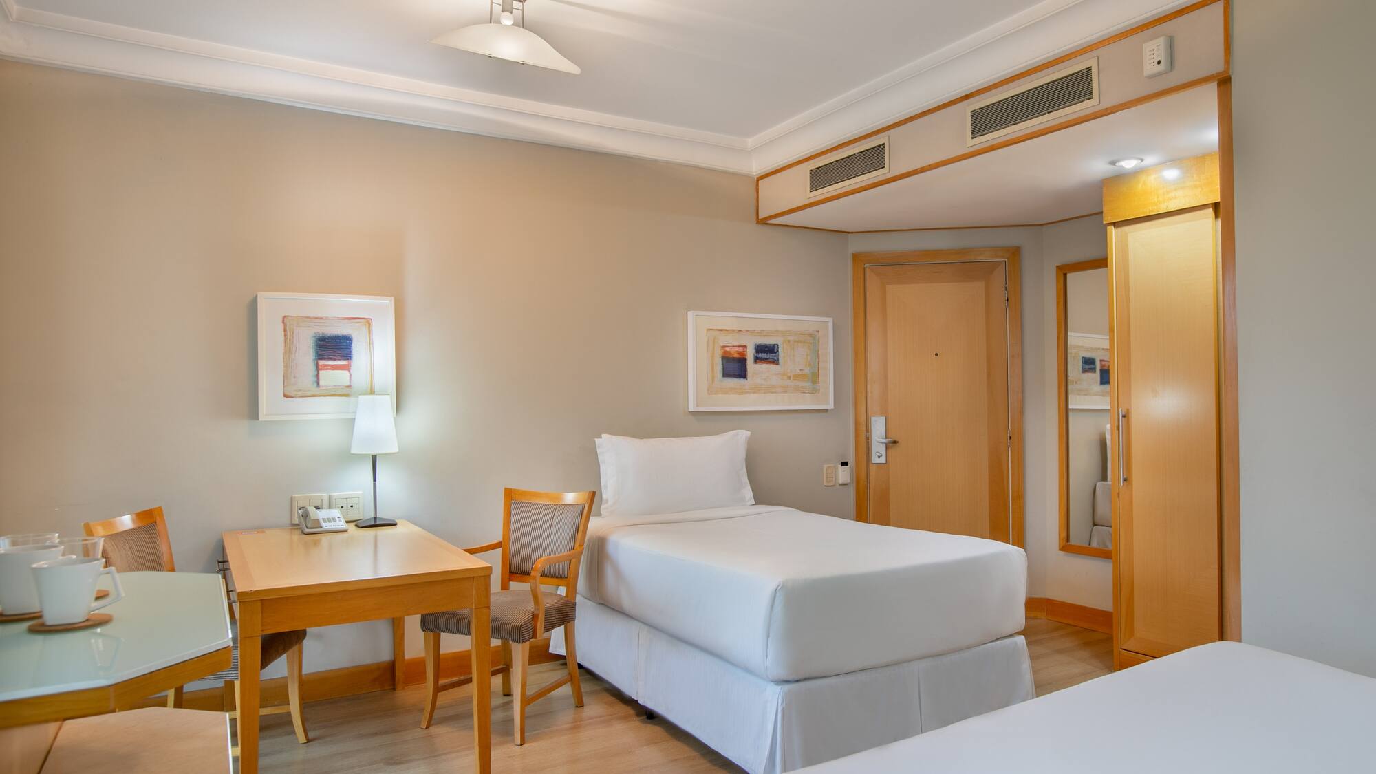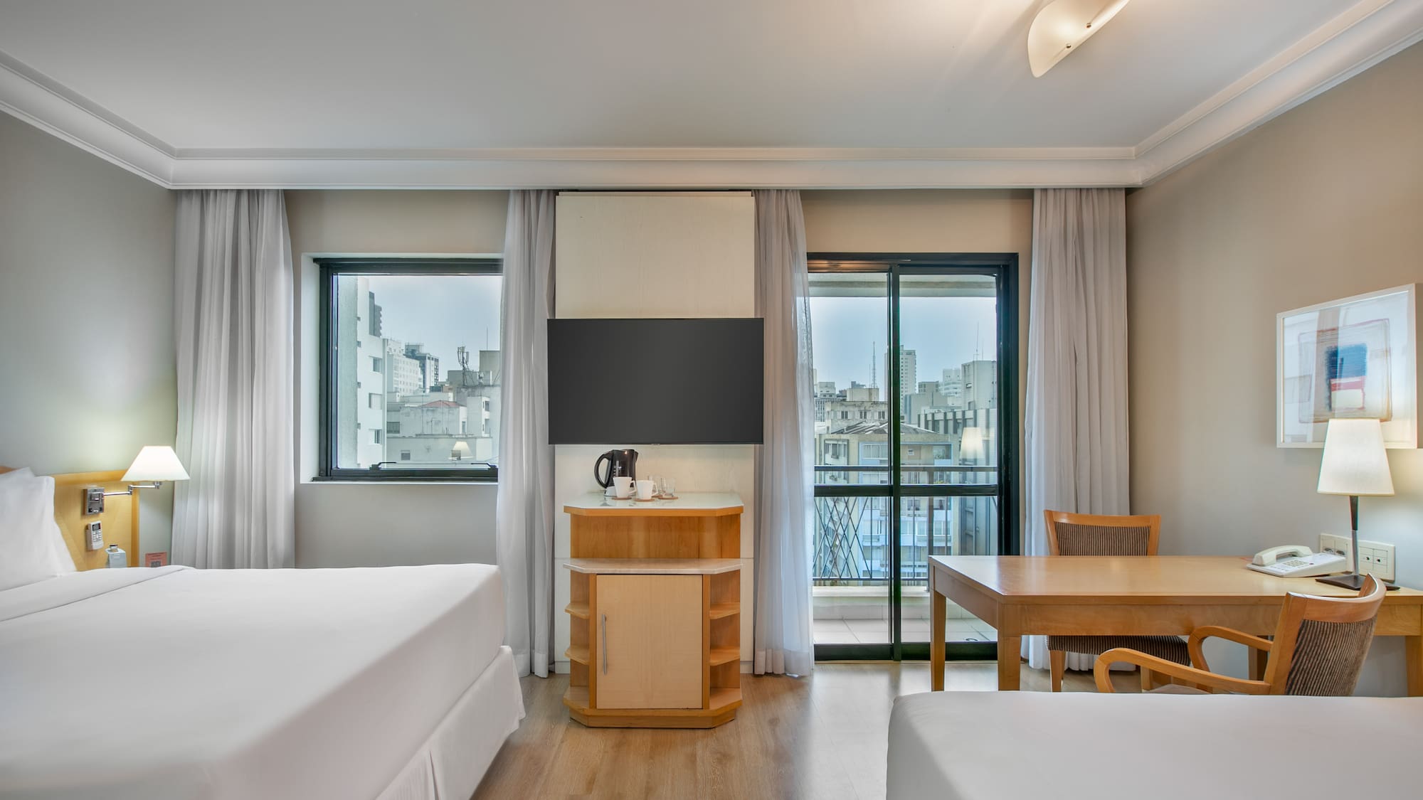 Po procházce ulicemi São Paula si zasloužíš odpočinek! Pokoj s balkonem a výhledem, který vybízí k odpočinku, plně vybavená koupelna s županem a pantoflemi, tři samostatná lůžka, televize a minibar. Můžeš si přát víc?