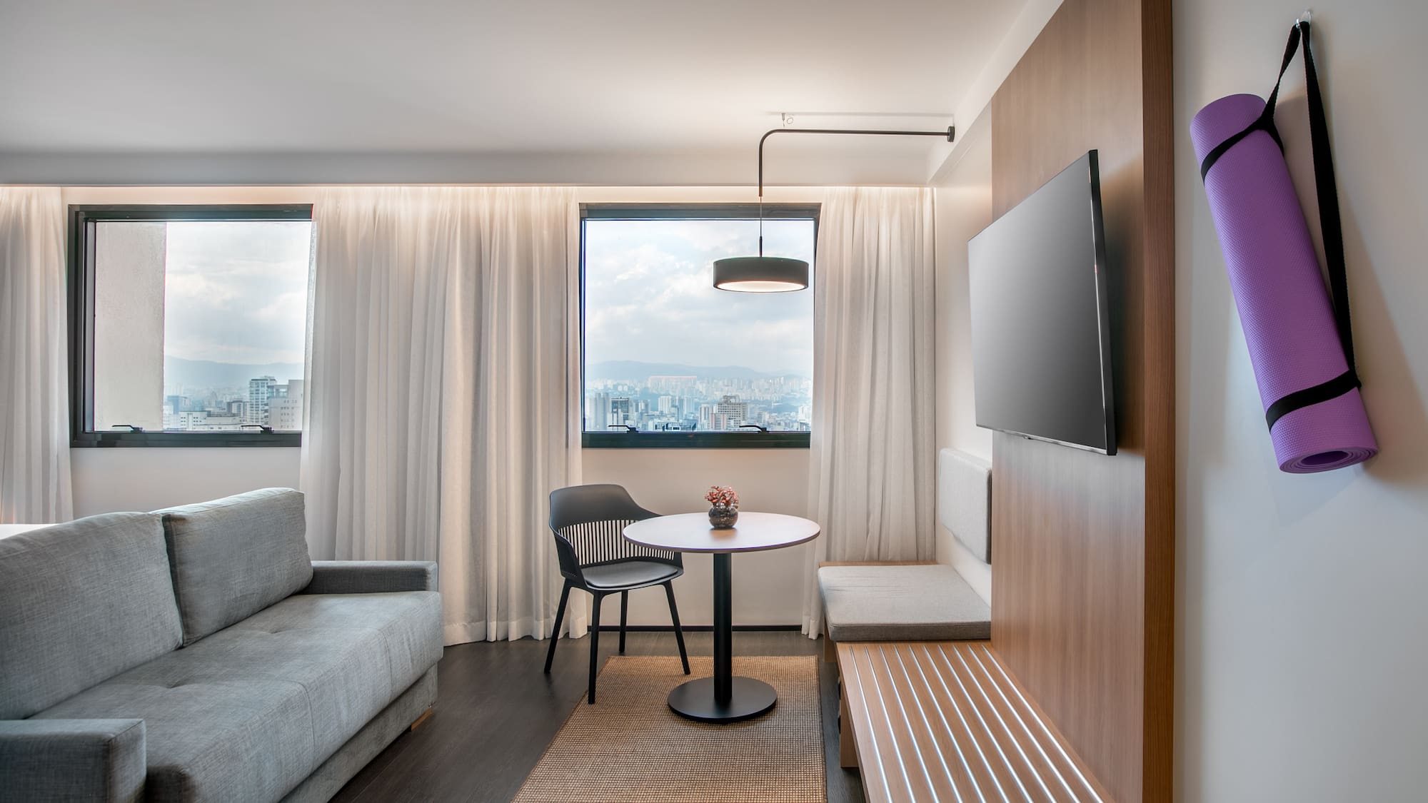 Některé výhledy si nechcete nechat ujít. Z tohoto pokoje můžete obdivovat São Paulo a Avenida Paulista a zároveň si užívat modernosti jeho zařízení. Smart TV, rozkládací pohovka, podložka na jógu a kávovar Nespresso. Sen!
