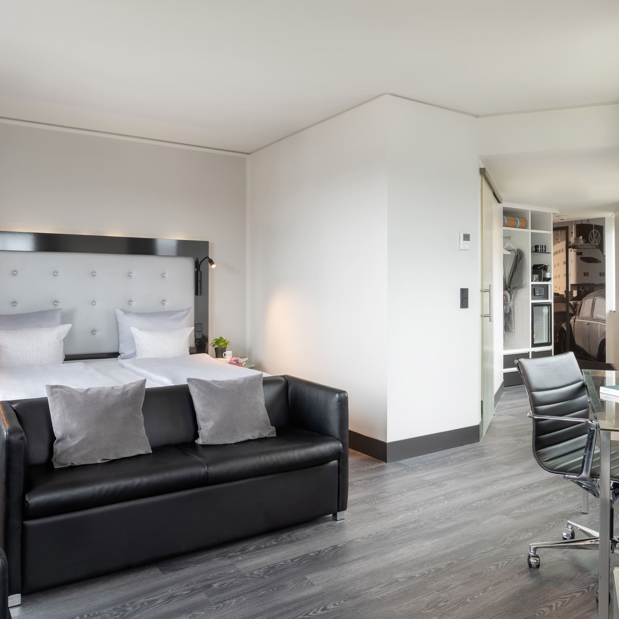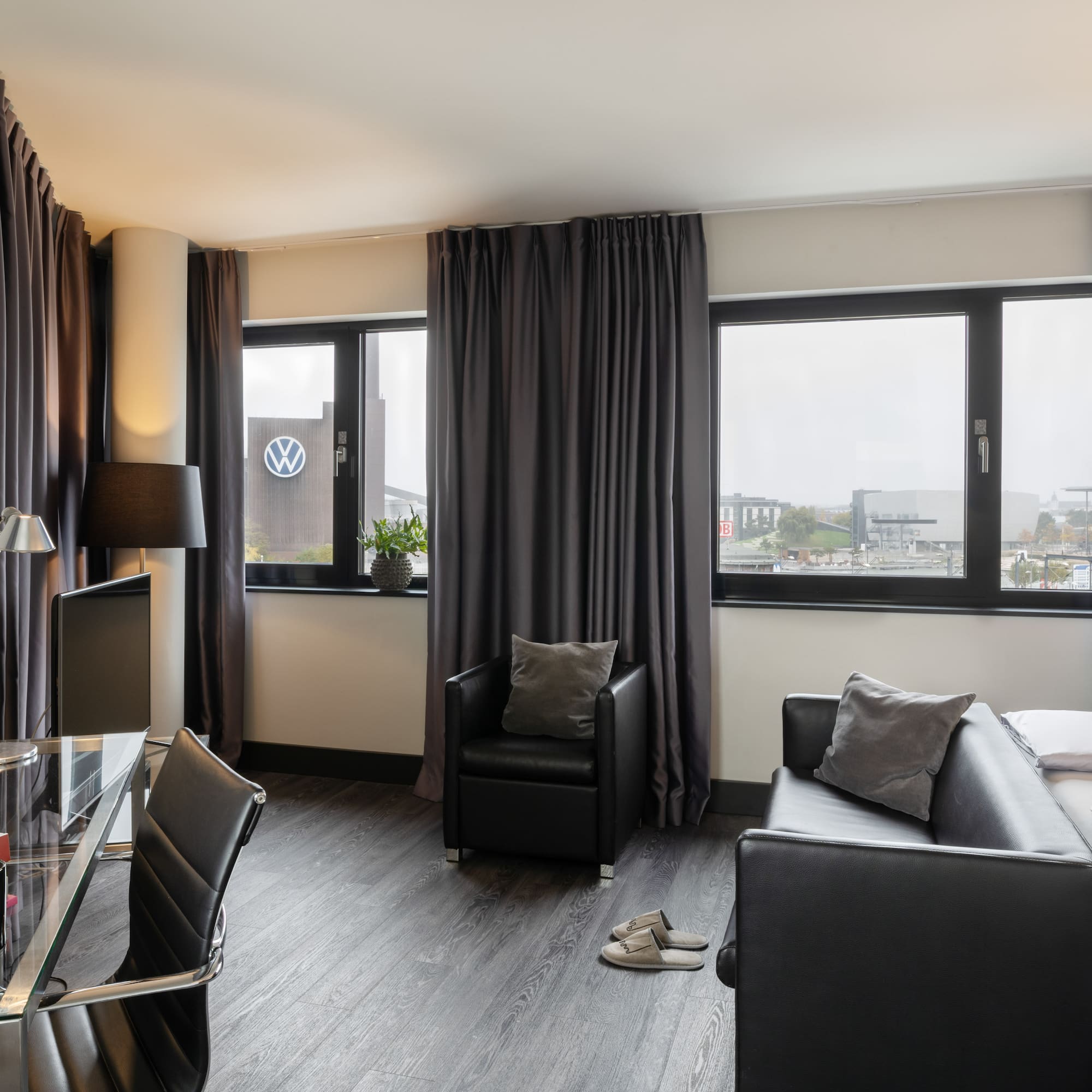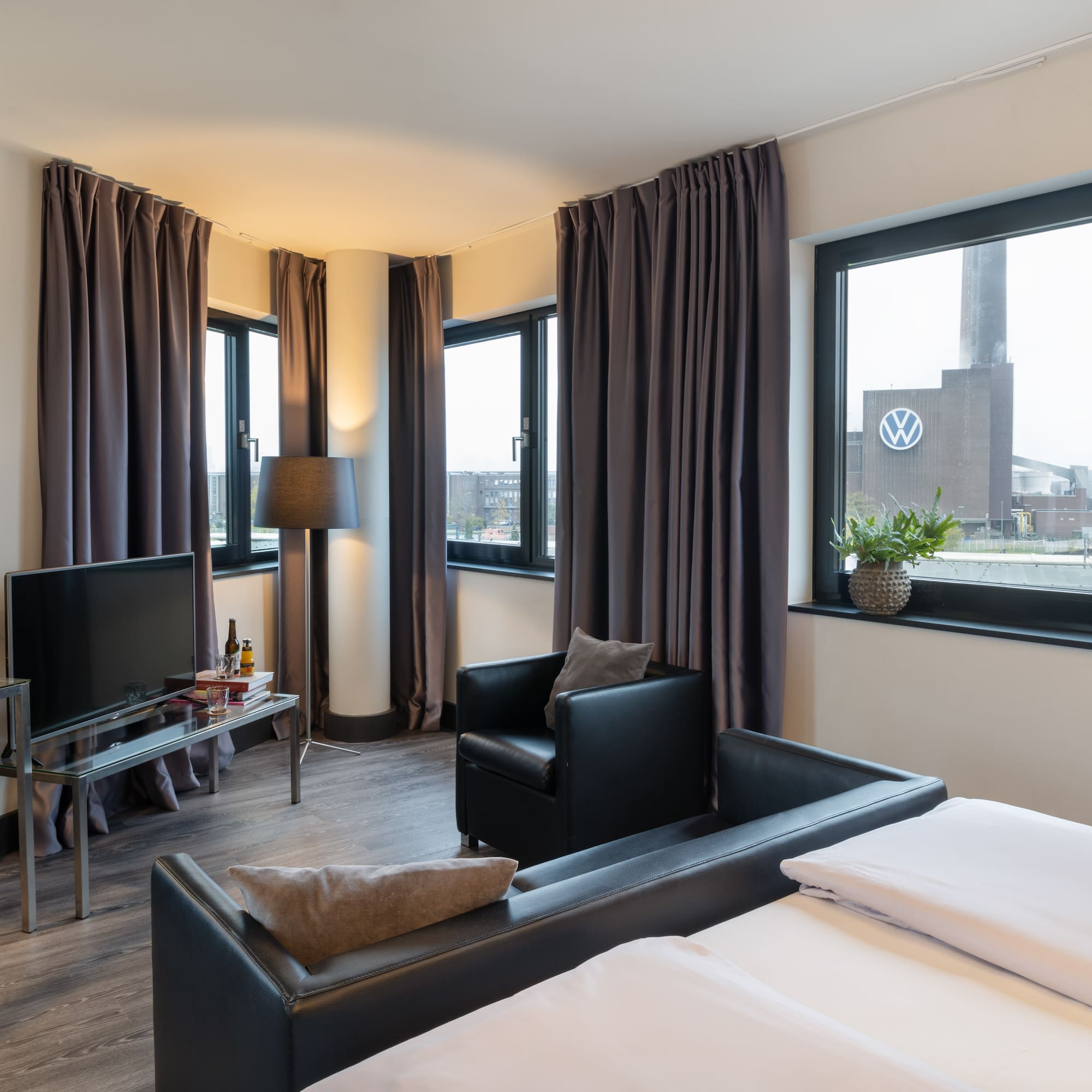 S neuvěřitelným výhledem na Autostadt objevte jiný způsob práce. Užijte si jedinečný pobyt s extra dlouhou postelí, psacím stolem a dešťovou sprchou nebo vanou. Dobře vybavený pokoj s vysokorychlostním Wi-Fi, TV a kávovarem Nespresso.