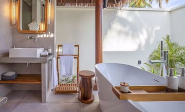 Z této plážové vily s přímým přístupem na břeh si můžete dopřát úchvatné západy slunce. Ponořte se do tropického prostředí Malediv a užijte si hravé chvíle na soukromé houpačce na terase nebo poklidnou relaxaci ve venkovní koupelně se sprchou a vanou.