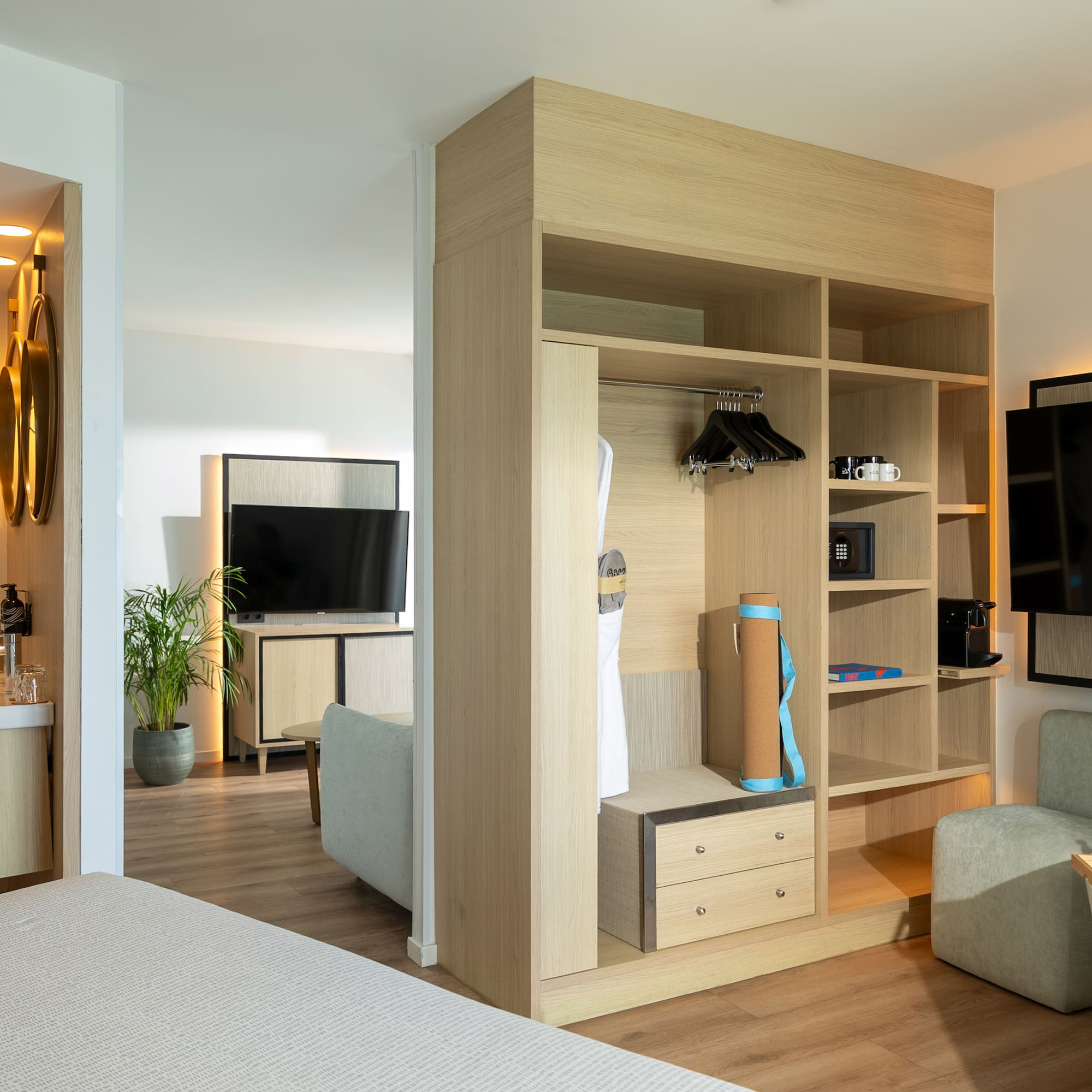 Ponořte se do klidu Středozemního moře v tomto rodinném pokoji s výhledem na moře a bazén. Je prakticky a světlý, má koupelnu, toaletu a rozkládací pohovku. Dokonalá harmonie mezi pohodlím a rodinnou zábavou. Chystáte se?