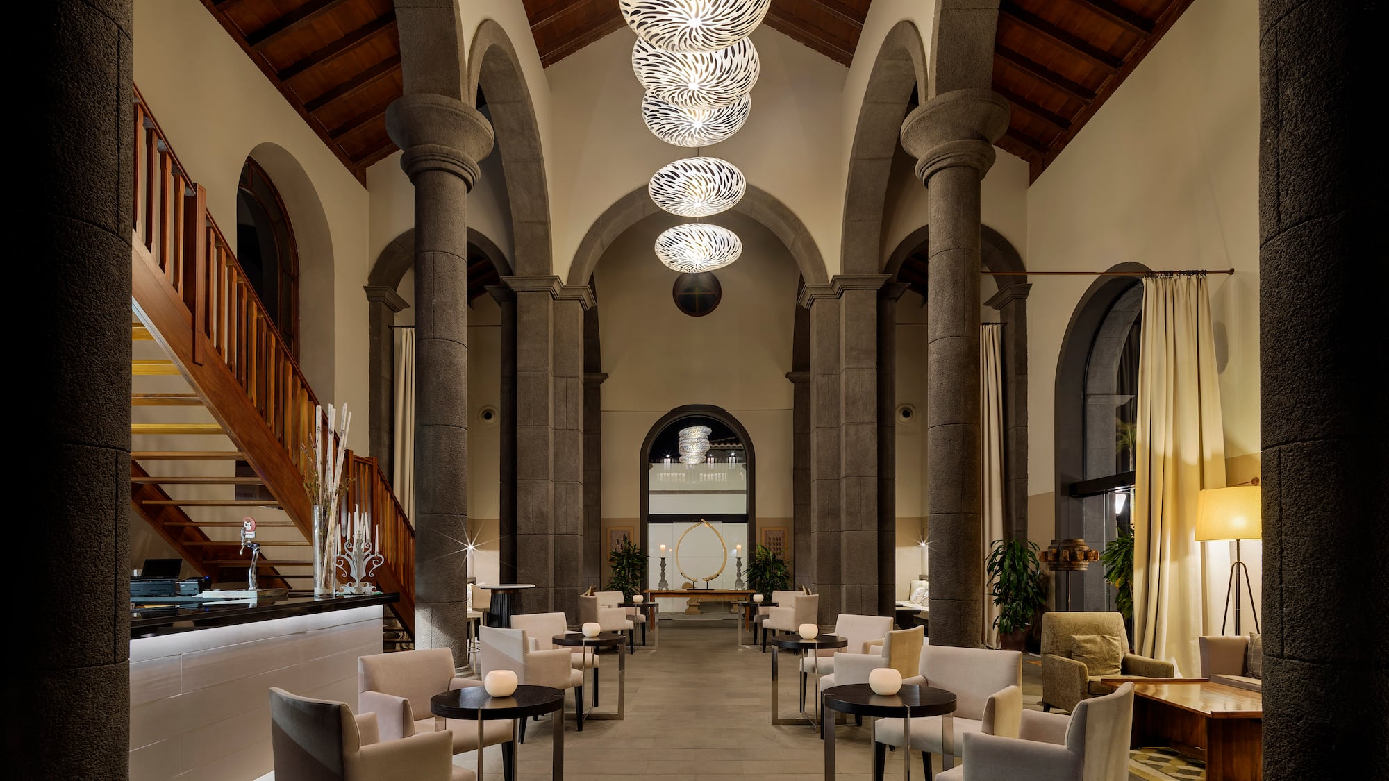 Vychutnejte si drinky a koktejly ve fascinujícím prostředí, kde architektura kostela se sloupy, půlkruhovými oblouky a moderní výzdobou vytváří magický zážitek.