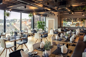 Entdecken Sie großartige Küche mit kreativen Gerichten und überraschenden Kombinationen regionaler und internationaler Aromen. Unsere 5. Etage bietet verschiedene Räume für Geschäftsessen, romantische Abendessen oder Drinks unterm Sternenhimmel. Der perfekte Ort für ein Treffen bei Live-Musik und herrlichem Panoramablick.