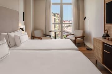 Ein ruhiges Zimmer, das die perfekte Atmosphäre für Erholung und Entspannung schafft. Genießen Sie ein gutes Buch in Ihrem Doppelbett oder Ihrem Sessel, während Sie den Ausblick auf die Stadt bewundern oder ein entspannendes Bad mit Pflegeprodukten von Rituals nehmen.