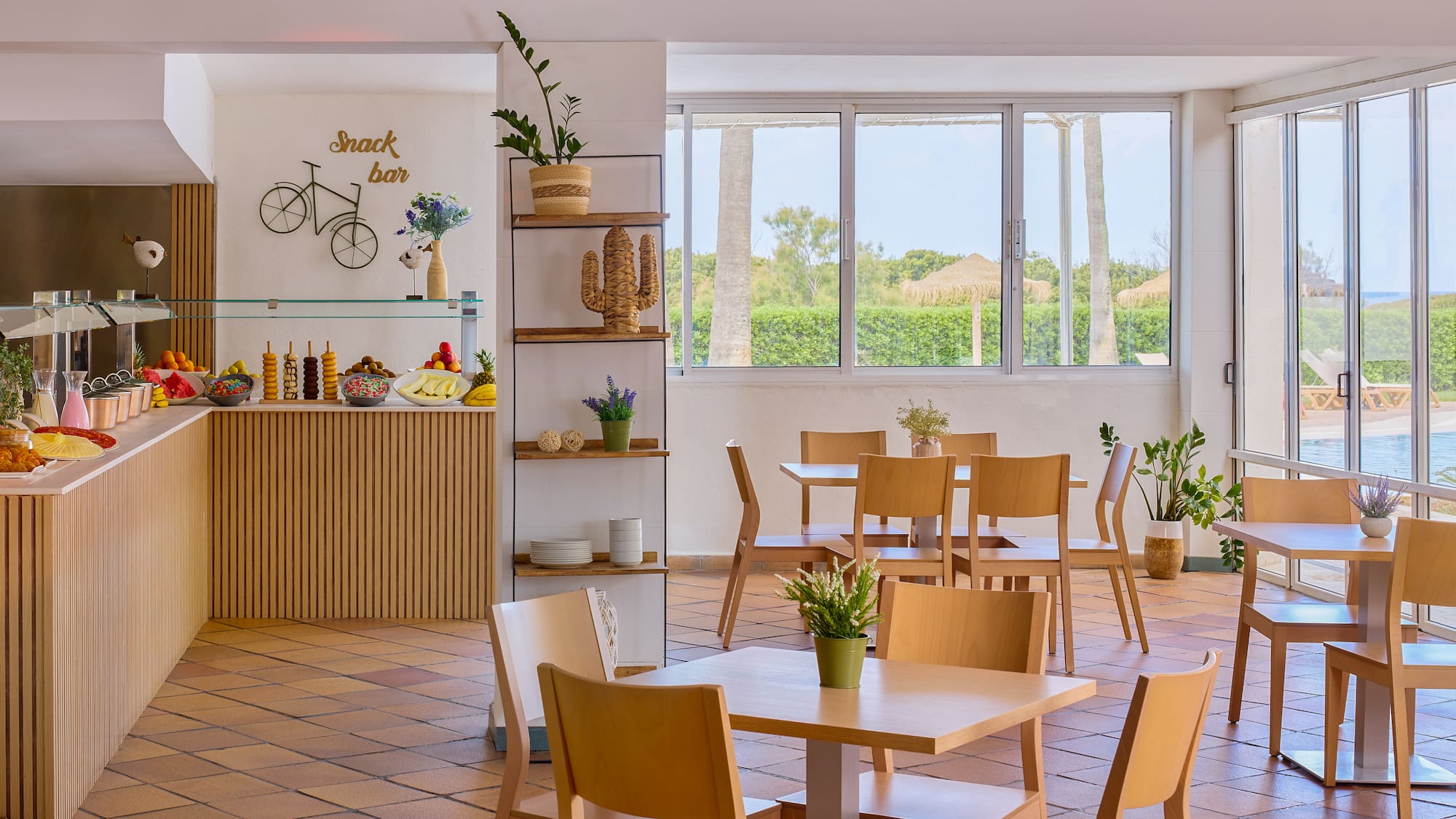 Ideale Bar für den Genuss einer kleinen Mahlzeit zwischendurch. Köstliche süße oder herzhafte Kleinigkeiten, große Auswahl an Getränken und Cocktail-Karte. Zwei Terrassen für ein Sonnenbad.