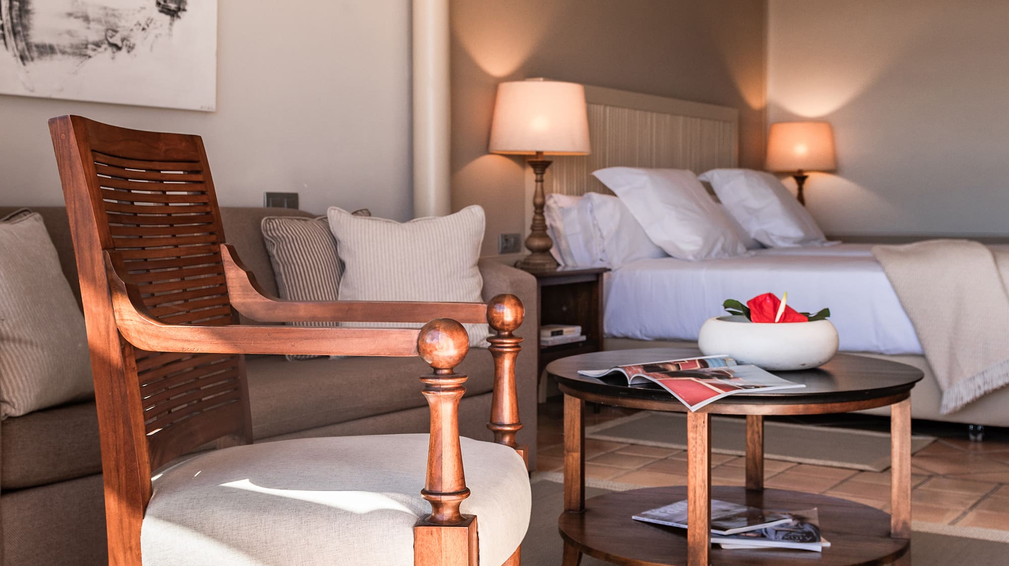 Teneriffas Seele spiegelt sich überall in diesem komfortablen Raum. Von der Landschaft der Kanaren inspirierte Suite für Ihre Rückkehr nach einem erlebnisreichen Tag auf der Insel. Träumen im Bett, Relaxen auf dem Sofa oder auf der Terrasse... Emotionen pur.