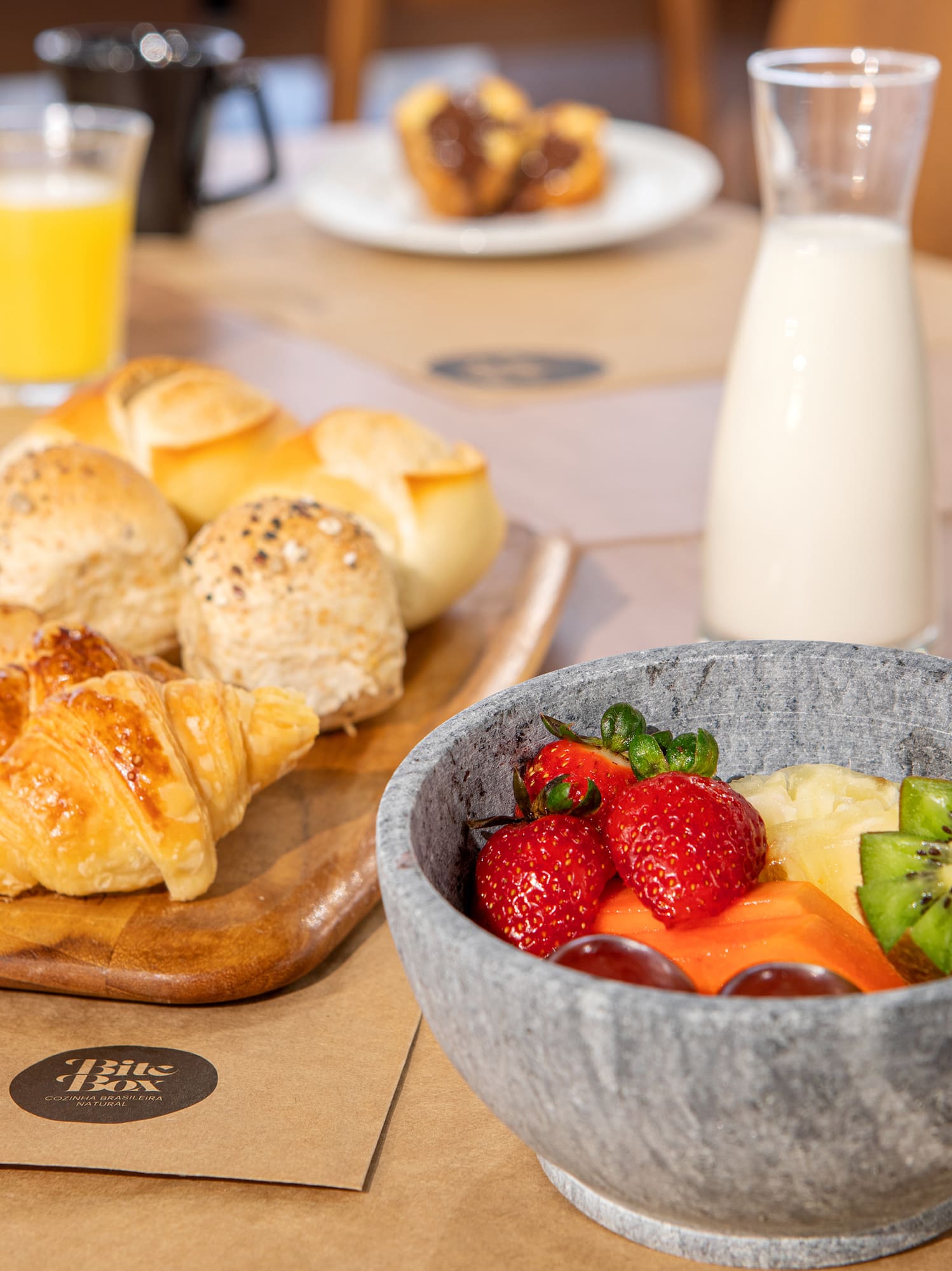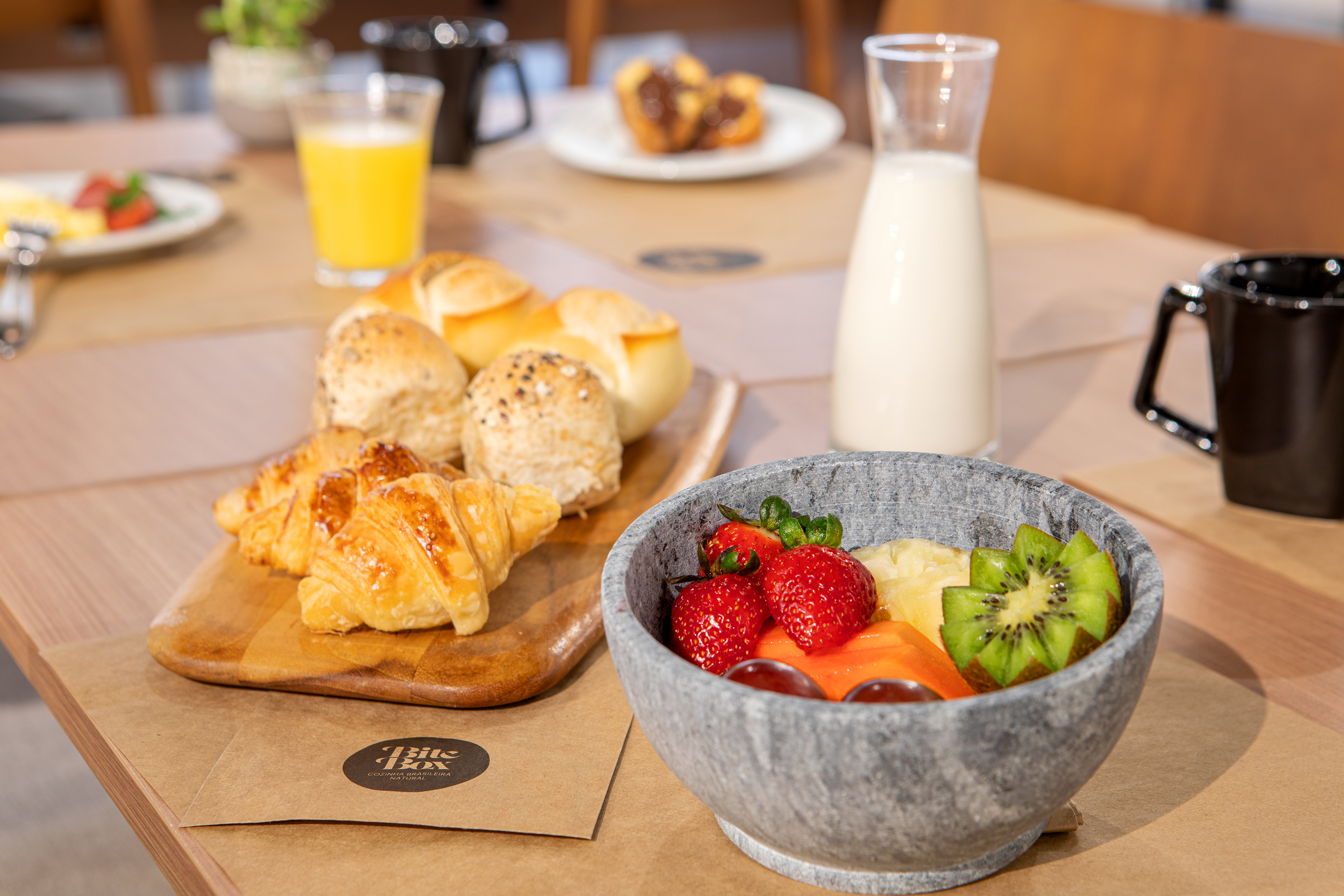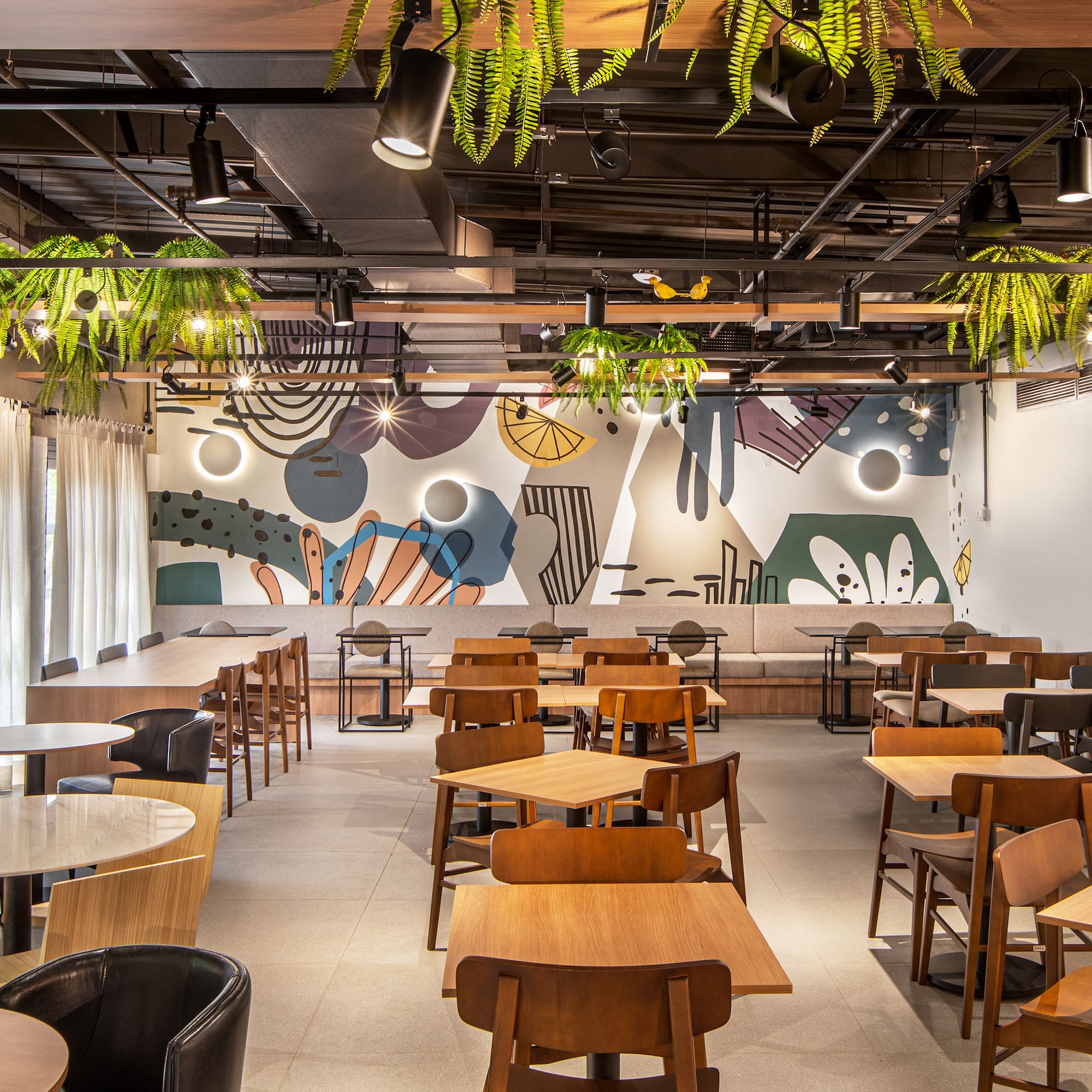 A modern interior full of energy, with warm wooden furniture, vibrant colors and details that invite you to relax and enjoy. Perfect for dining, sharing or working, this space reflects the urban and casual attitude of Bite Box, with all the personality and character of the most avant-garde district in São Paulo.