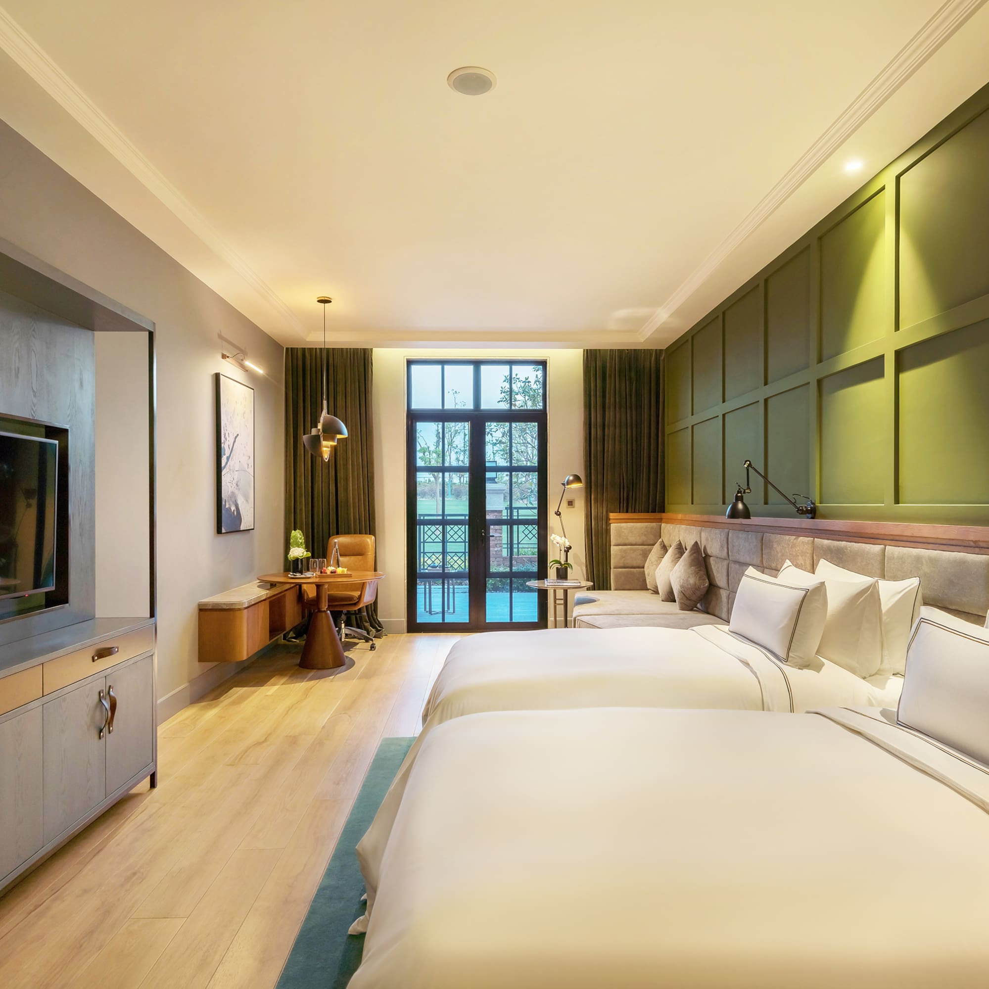 Inspired by Meliá’s Mediterranean origins and passion for nature, this serene room in soft olive tones offers two comfortable single beds and calming views over the patio—a wonderful retreat to relax and unwind.
