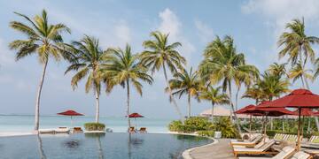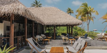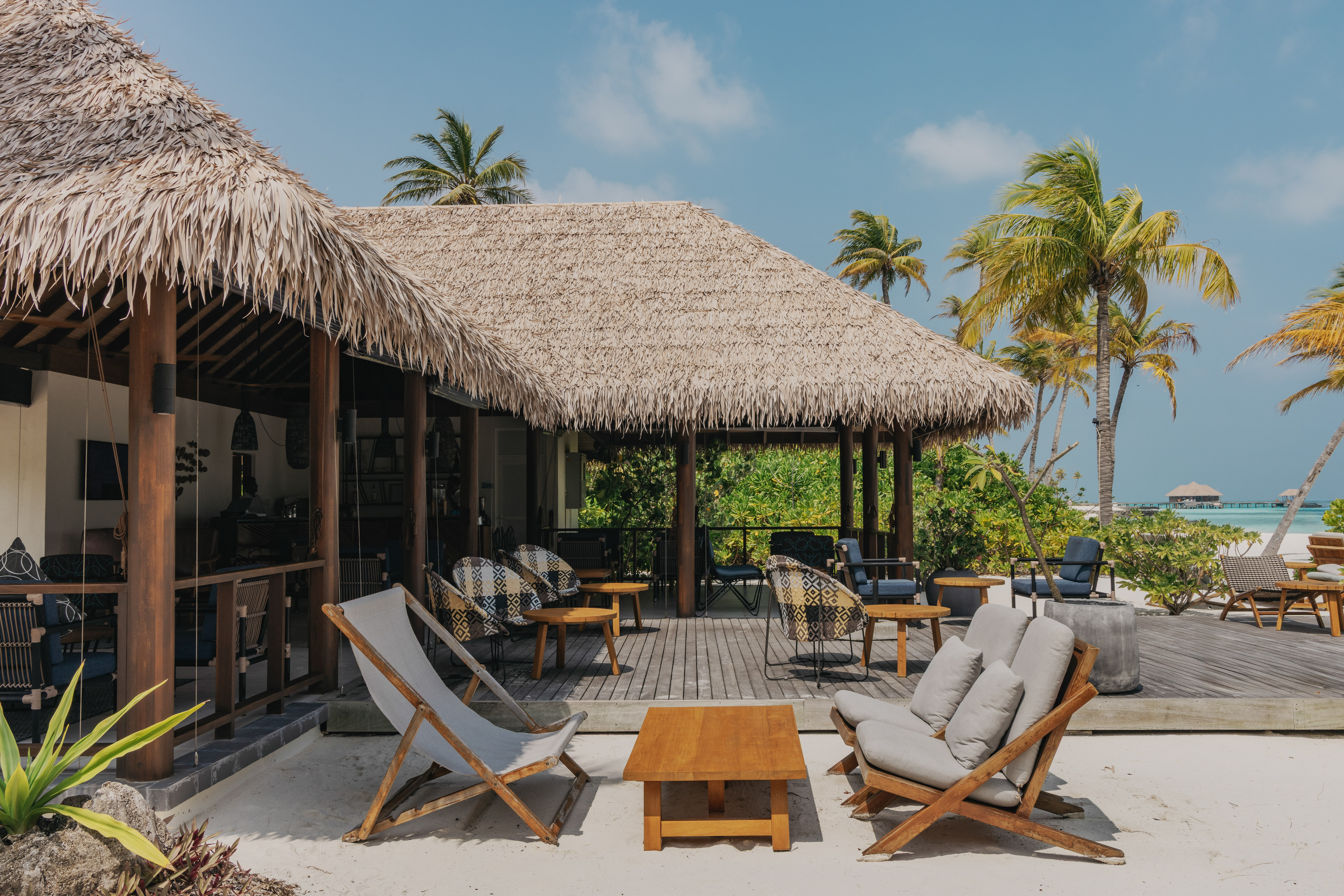 A magical moment during your holiday in the Maldives: enjoying refreshing drinks and light snacks in this beachfront bar while admiring the panoramic ocean views and the gentle waves.