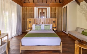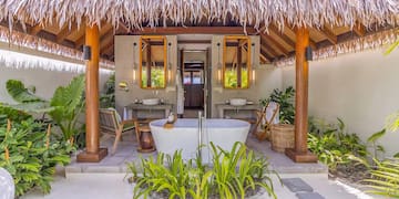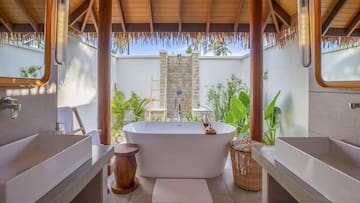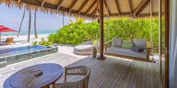 Find serenity in this Maldivian hideaway, where natural wooden interiors connect you to the island and an open-air bathroom with bathtub, indoor and outdoor showers and lush vegetation enhances the sense of escape. The spacious terrace—complete with sun loungers, private pool and direct beach access—elevates this villa with thoughtful details and generous spaces for those seeking comfort and privacy.