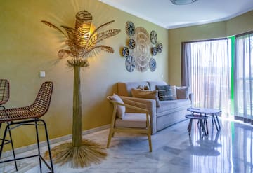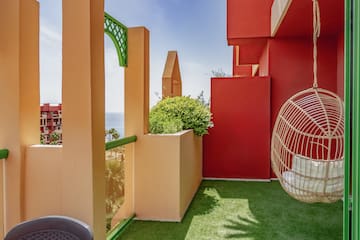 The suite offers a large terrace with sunbeds and a swing, perfect for relaxing and enjoying the sea views. It includes bathrobes and slippers, a Smart TV and other details designed to make your stay comfortable, private and enjoyable.