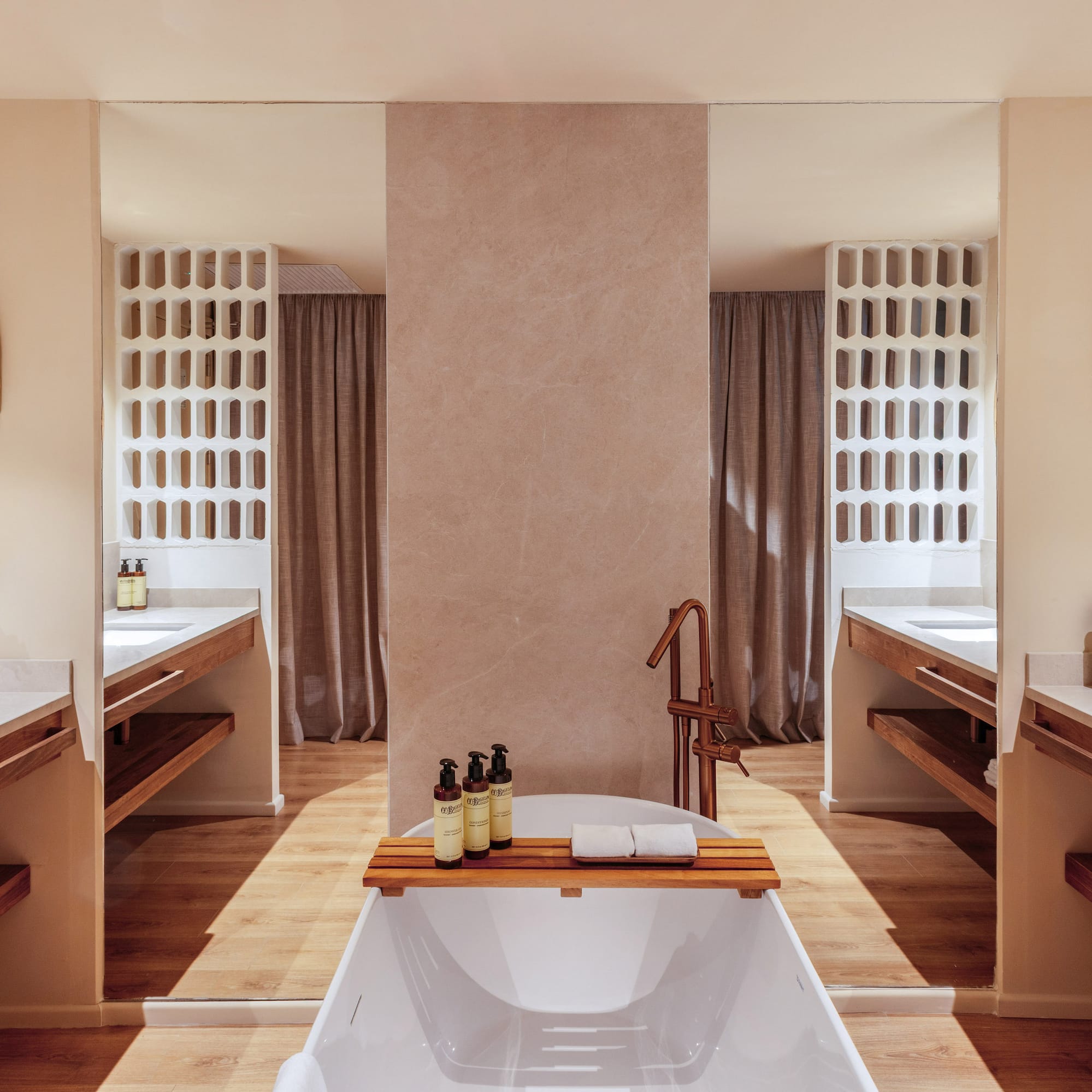 The décor and details of these interconnected suites have been curated to evoke an unmistakable Mediterranean style. Generously sized, each features an open-plan layout with a king-size bed and a relaxing area with a freestanding bathtub.