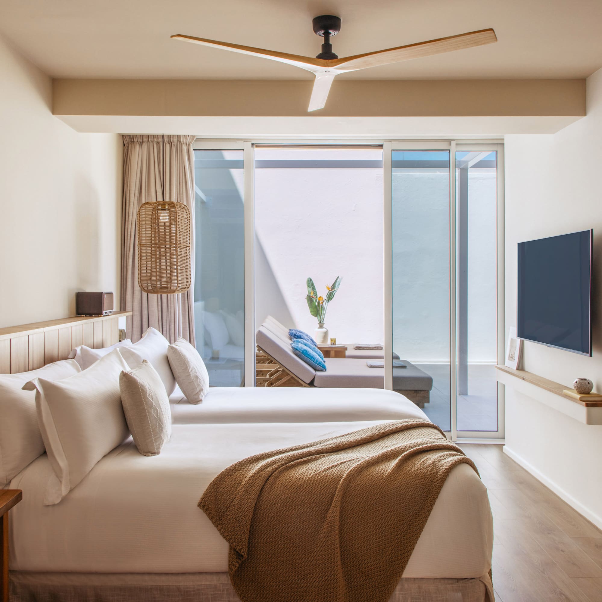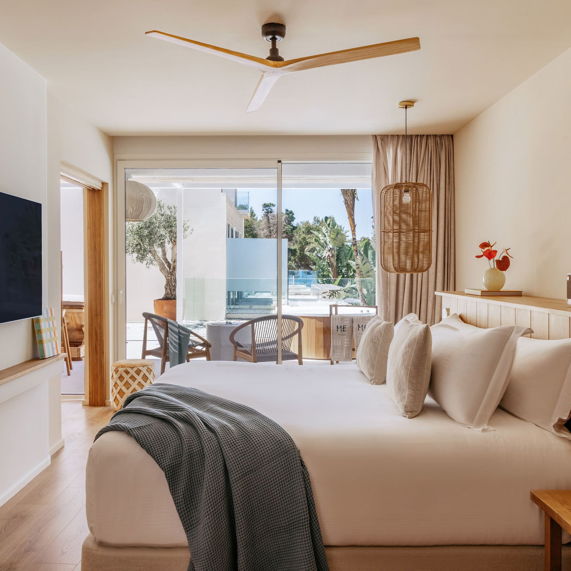 A suite where sophistication merges with modernity. Mesmerized by the sea views from your private terrace and relaxed in comfort with all the details. The perfect balance for your stay in Ibiza.