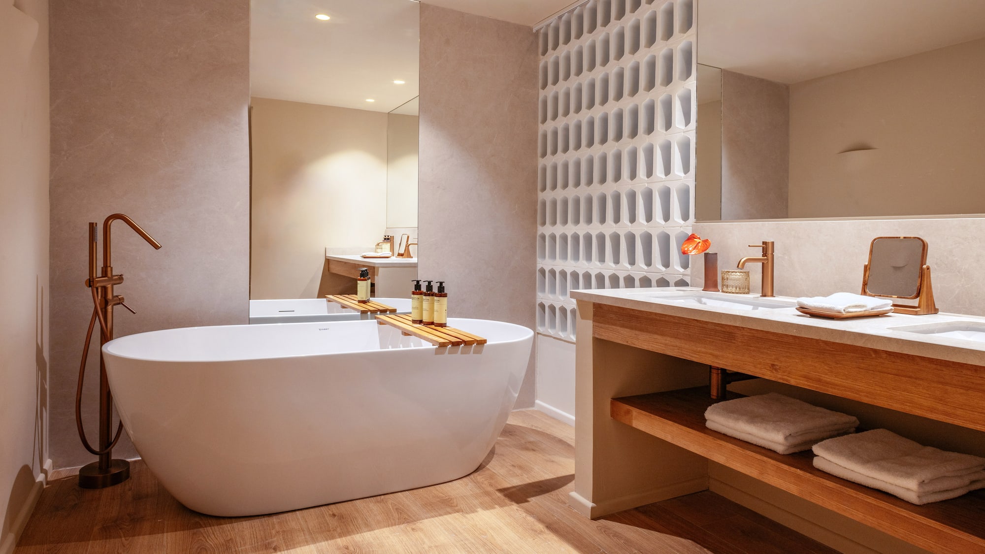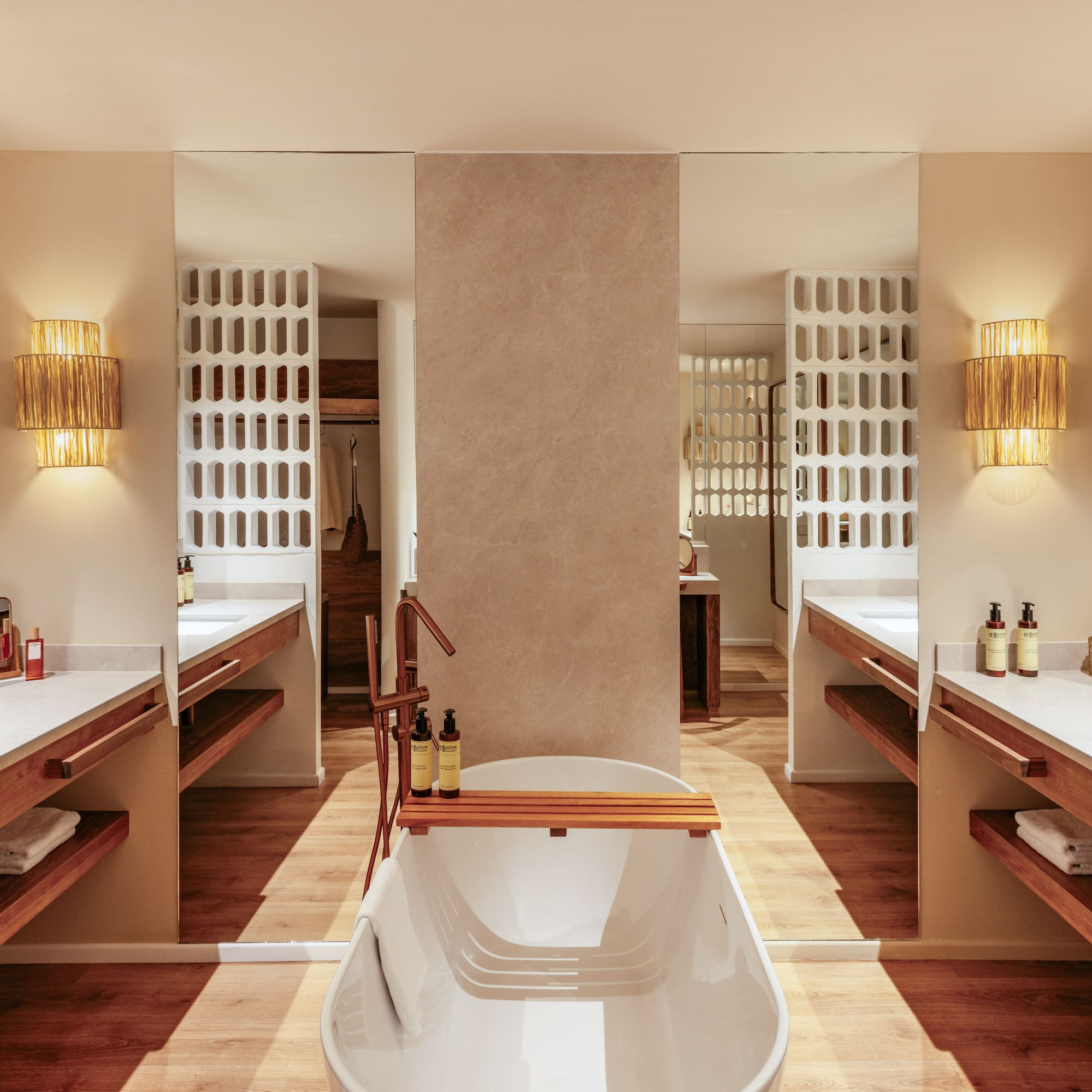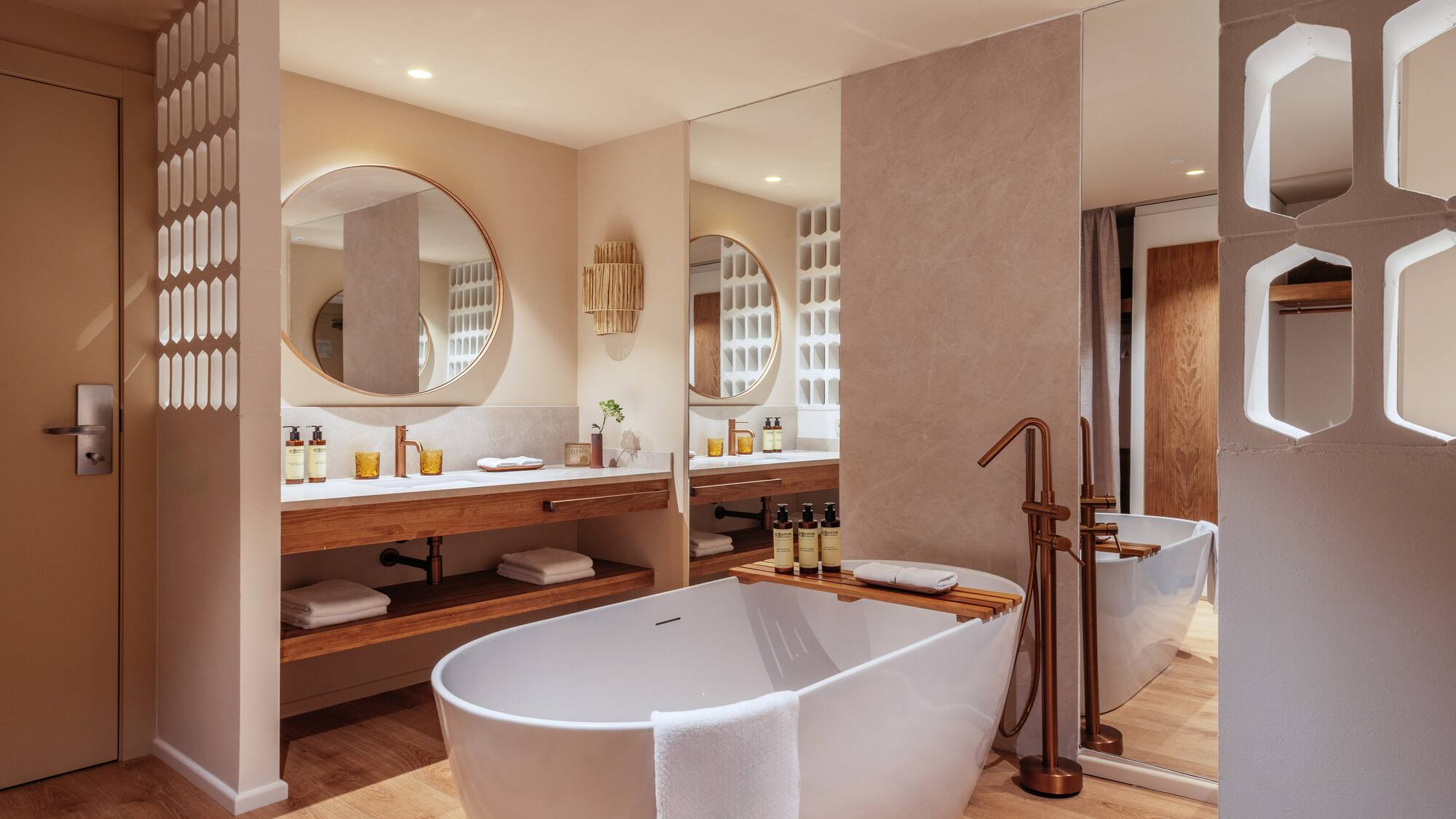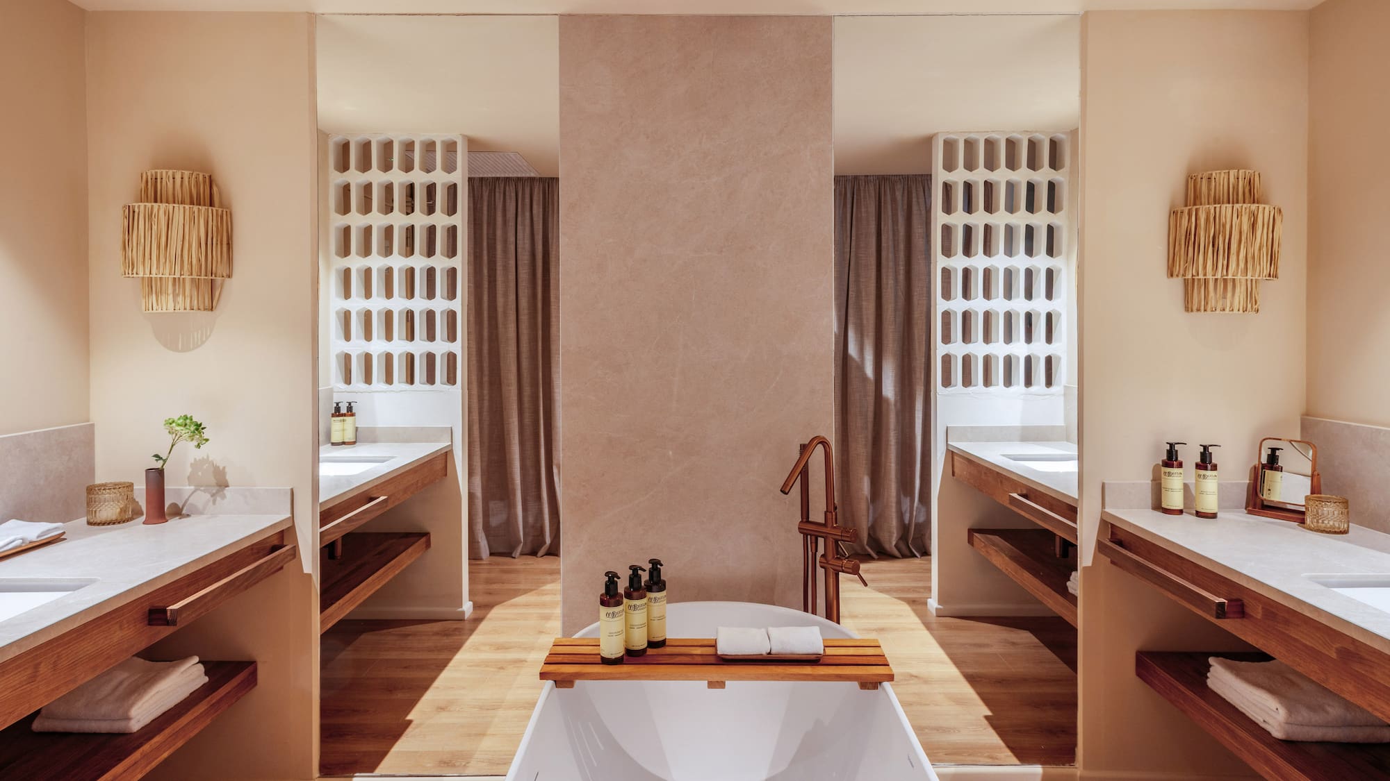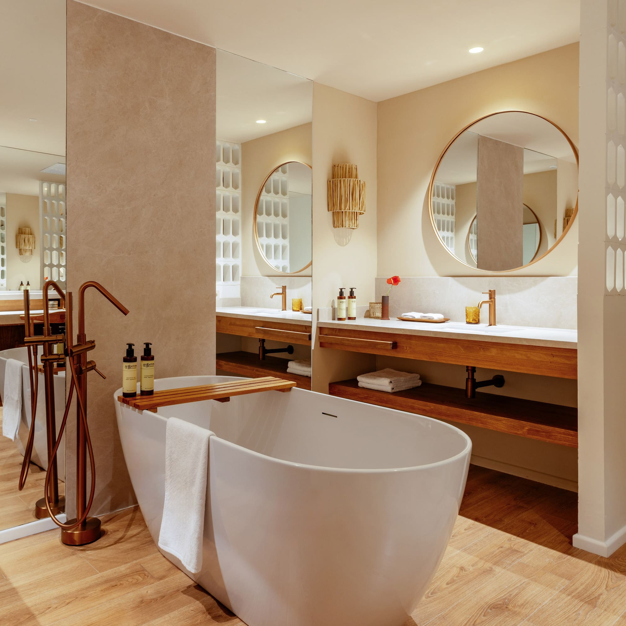 The décor and details of these interconnected suites have been curated to evoke an unmistakable Mediterranean style. Generously sized, each features an open-plan layout with a king-size bed and a relaxing area with a freestanding bathtub.