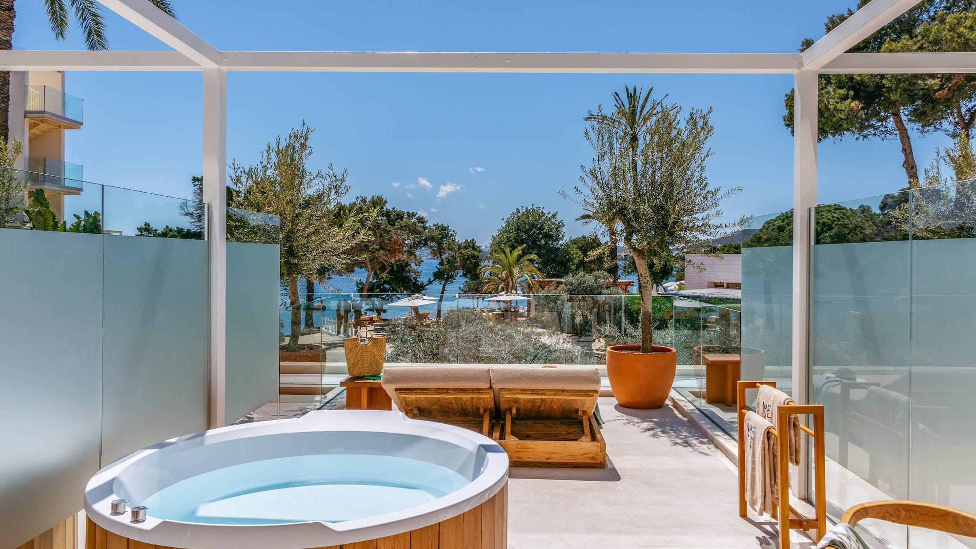 A suite brimming with passion with a large, fully furnished, private terrace with sea views and a discreet whirlpool bathtub. It also features a king-size bed, a free-standing bathtub, a lounge area and a bathroom with a rain shower.