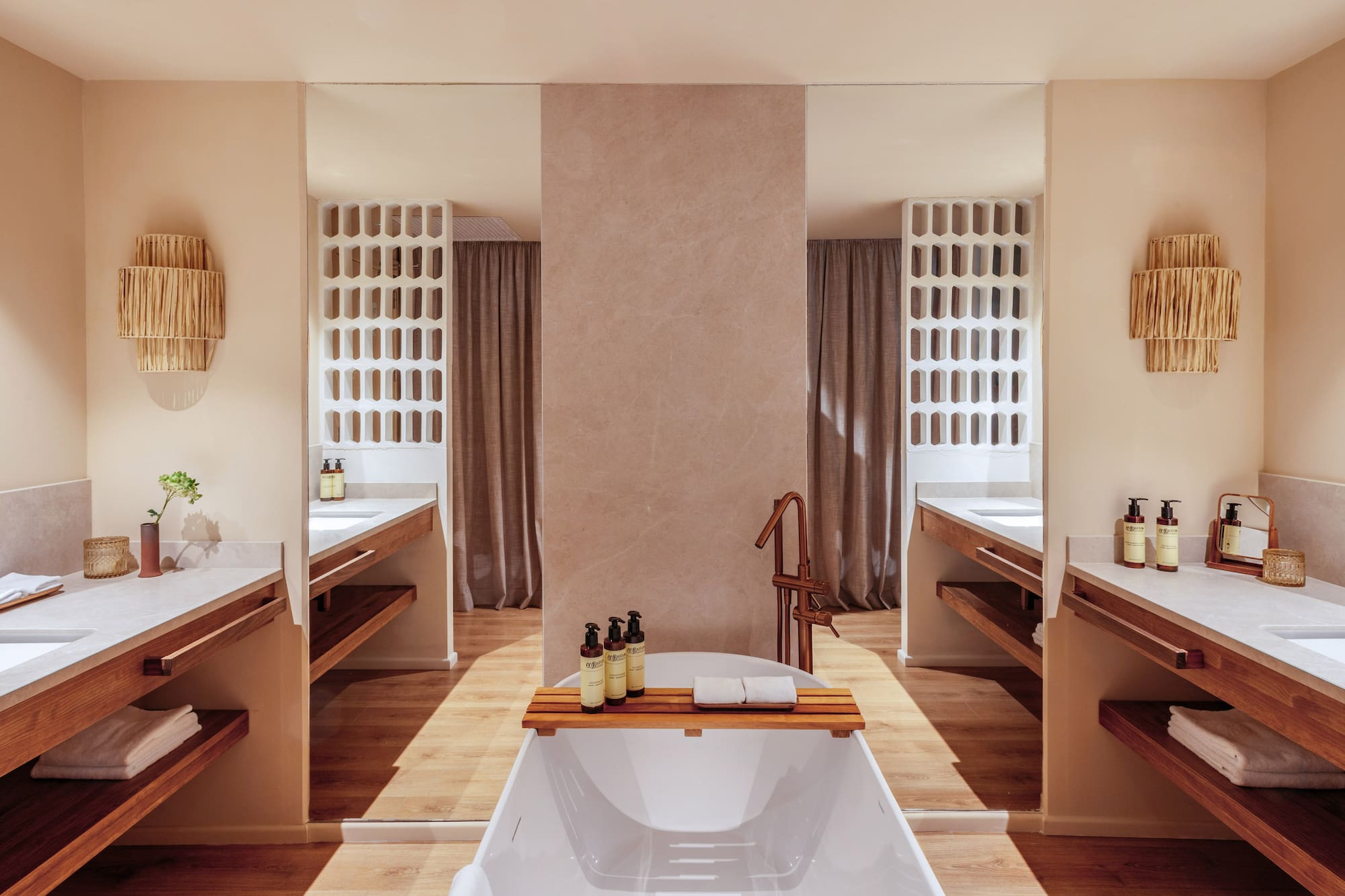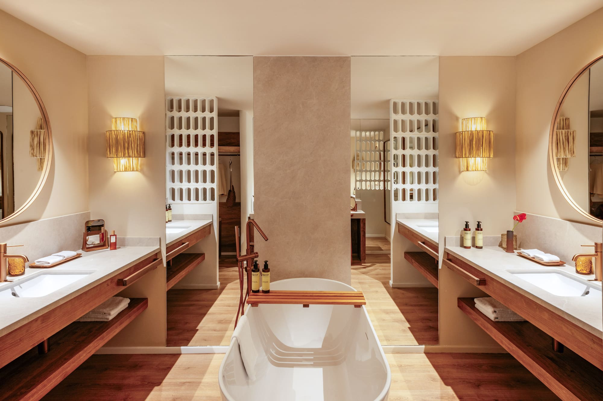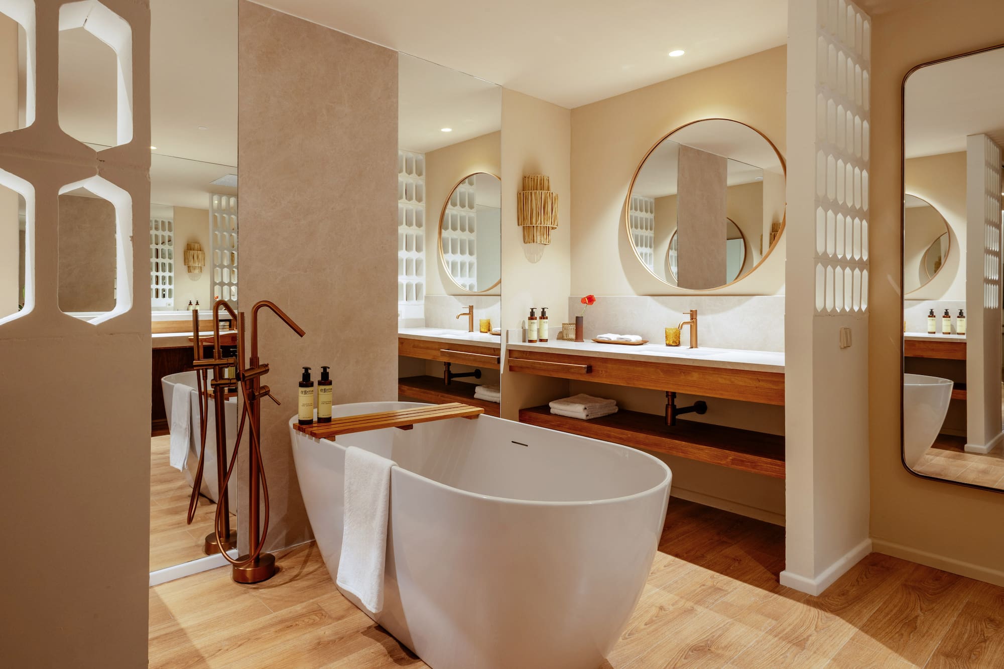 The décor and details of these interconnected suites have been curated to evoke an unmistakable Mediterranean style. Generously sized, each features an open-plan layout with a king-size bed and a relaxing area with a freestanding bathtub.
