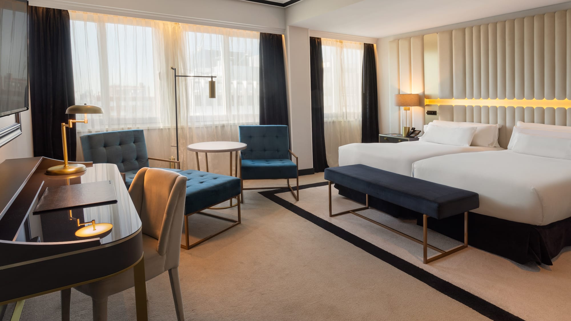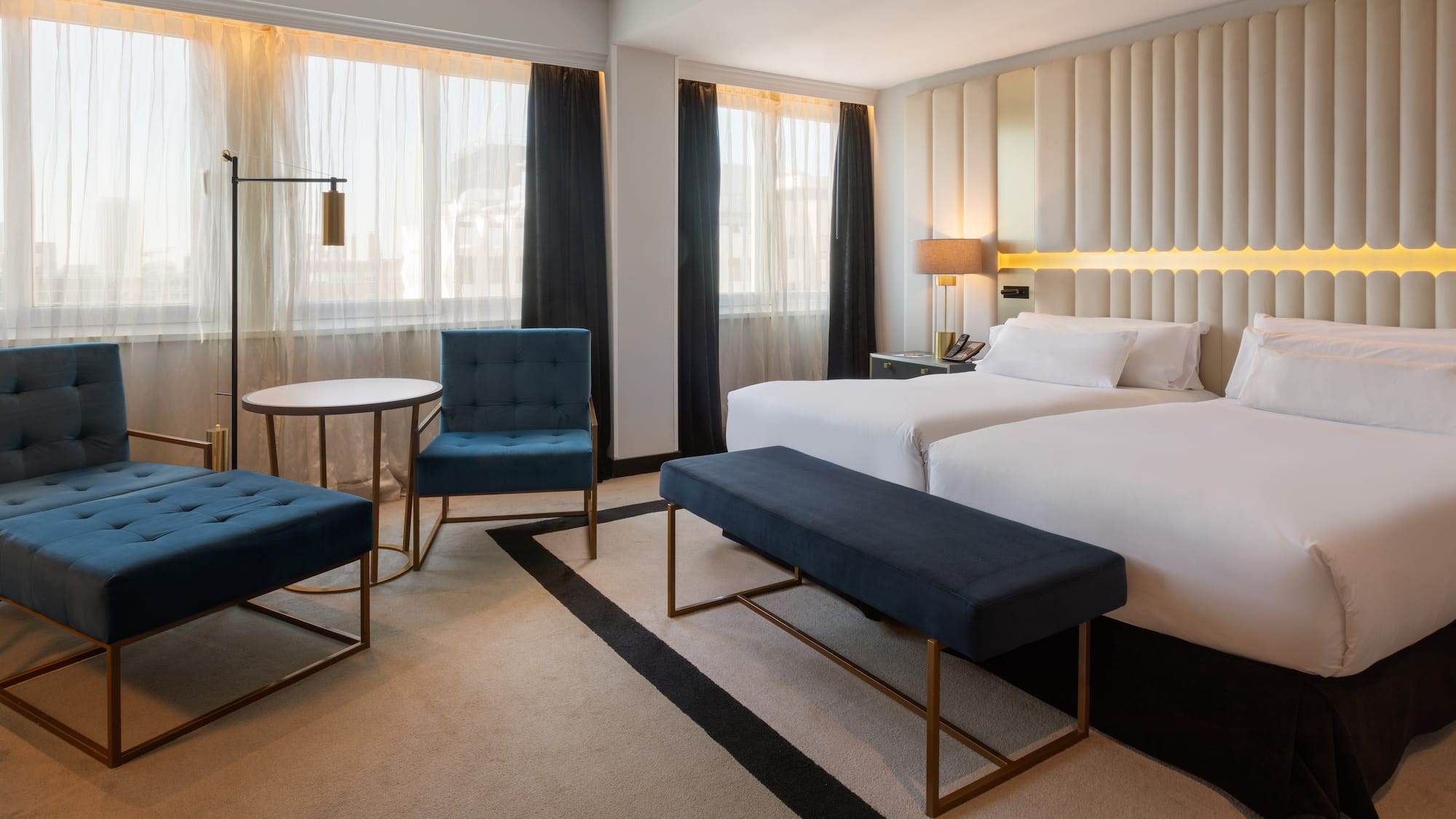 Two connected rooms will help you enjoy an unforgettable holiday in Madrid. One bedroom with a king-size bed (or two single beds, subject to availability), and another room with two single beds, both with double-glazed windows, a 49-inch LCD TV and its own bathroom. You will also have a work area with a desk and a lounge area with an armchair for reading or resting. Enjoy all The Level services you need and deserve.