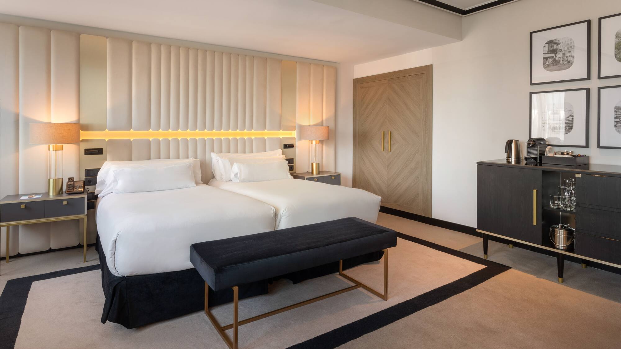 Start your stay in Madrid by admiring the city skyline from this spacious and elegant suite. A perfect room with an open-plan bedroom, two bathrooms and a separate lounge with a work area.