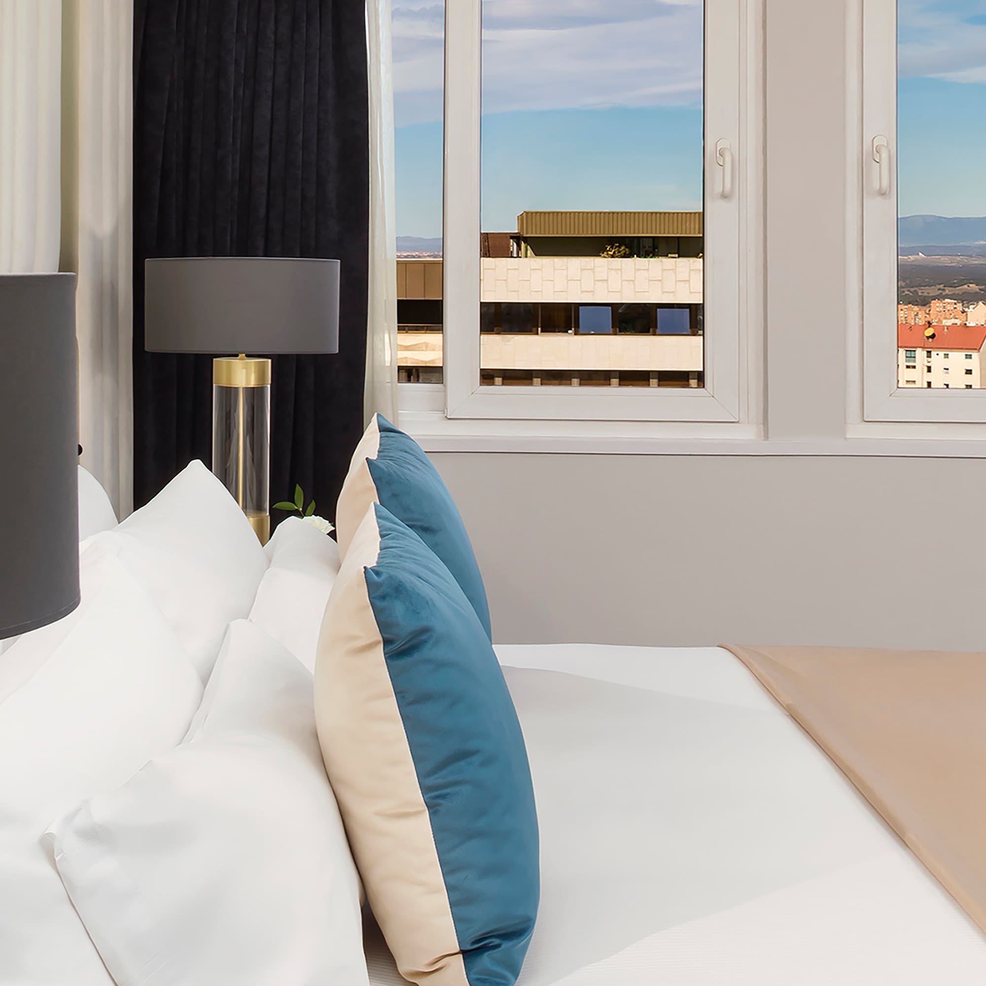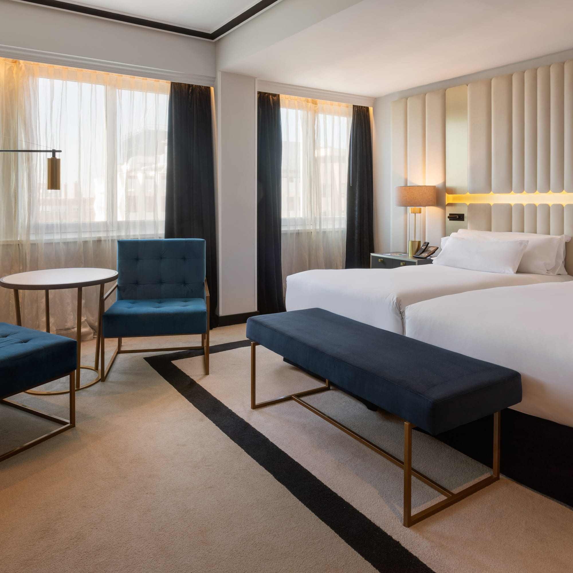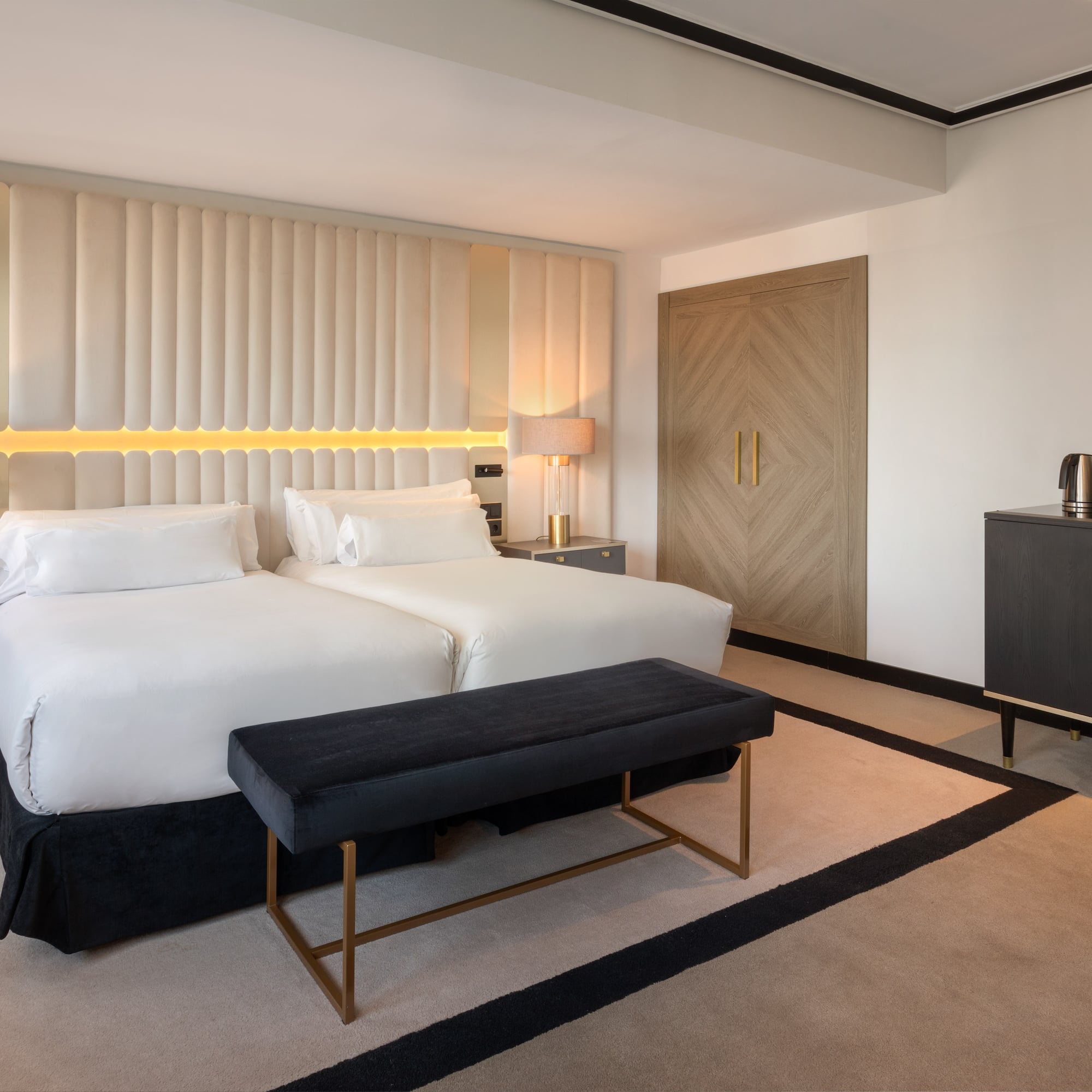 An exceptional room where refinement, design and superior comfort go hand in hand. A room full of light that offers great views of the city and has a bedroom with a queen-size bed or two single beds and a full bathroom.