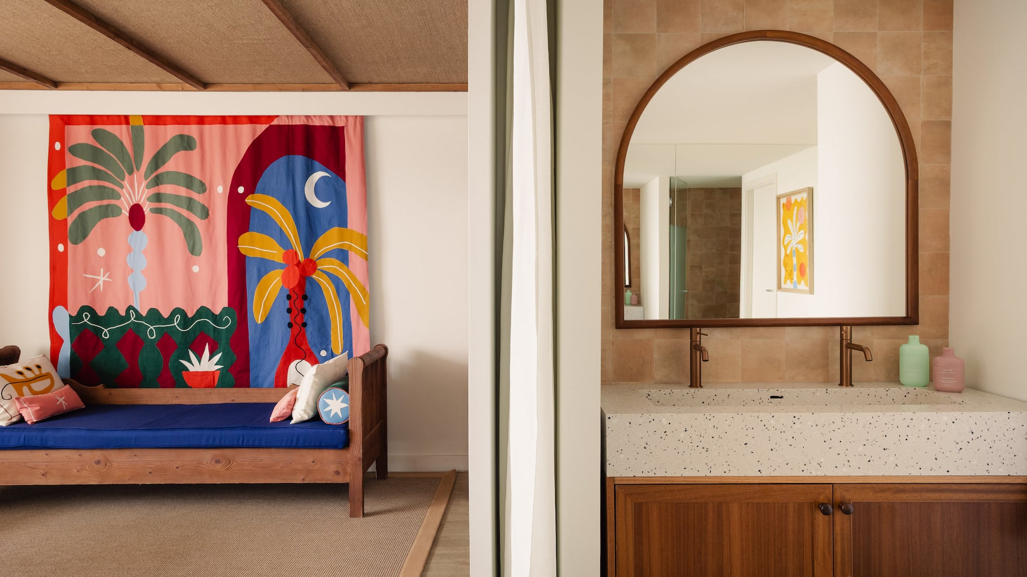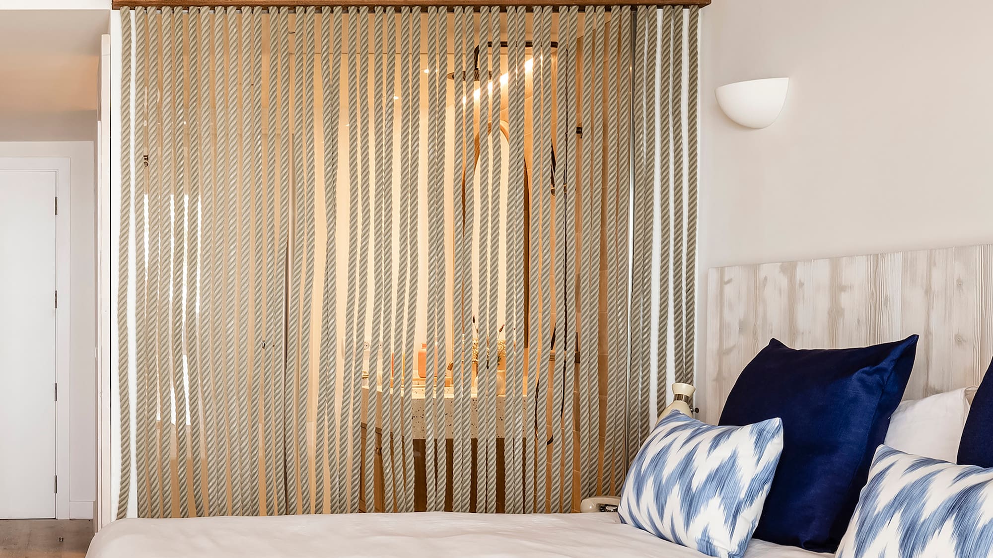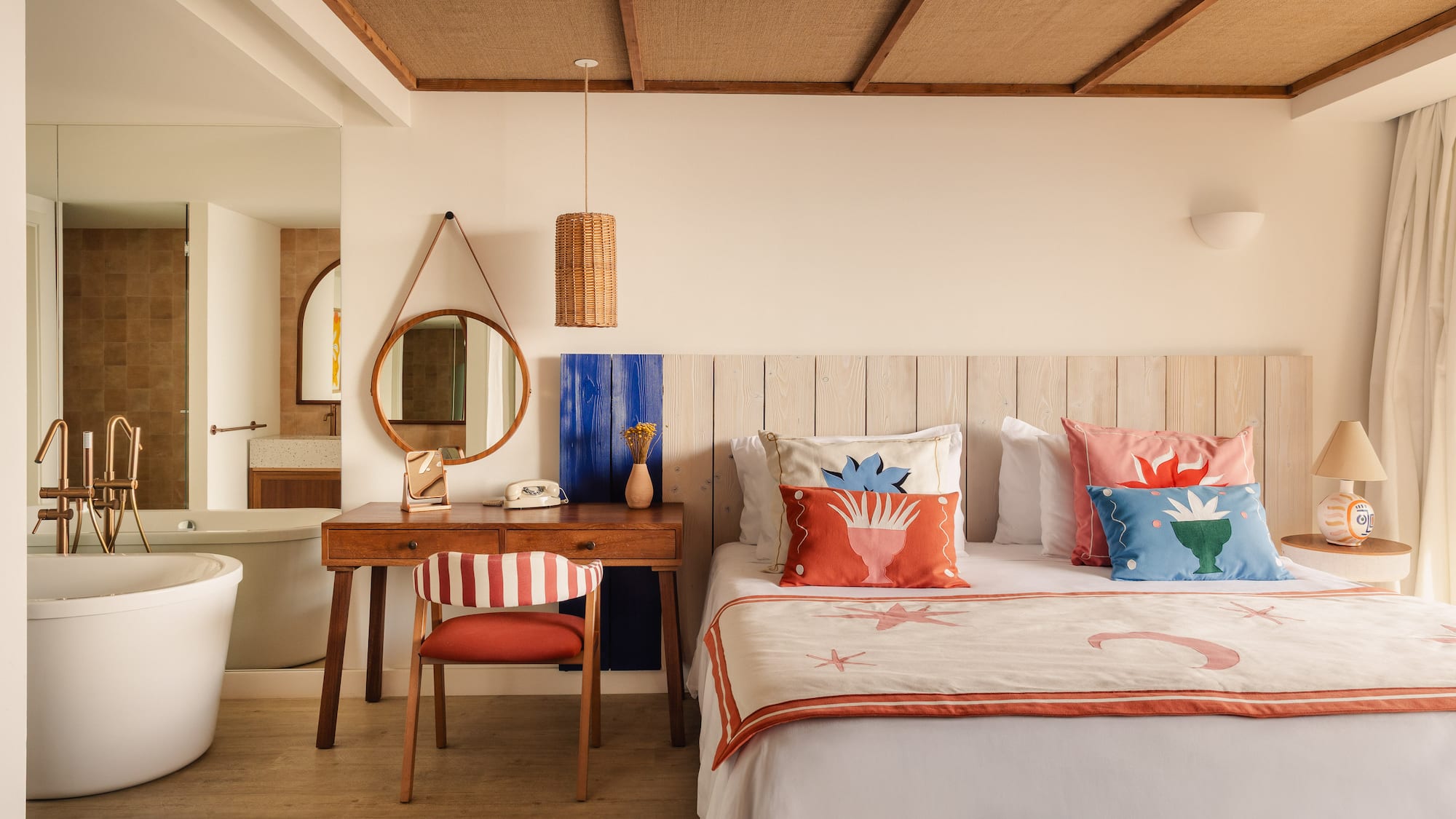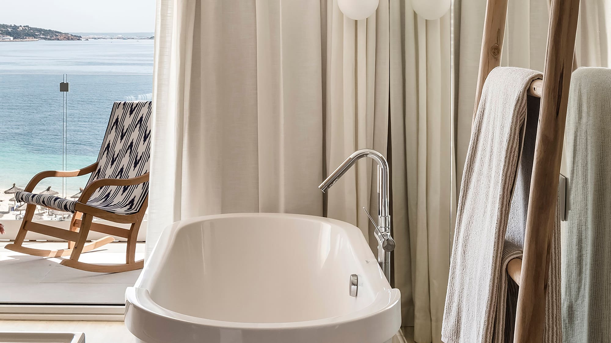 Zel Mallorca inspires PANGEA Studio to create unique pieces and textiles with a Mediterranean soul, bringing personality to this room. From the bathtub overlooking the sea to the Bluetooth speaker or the bathrobe, every detail is designed to offer an inspiring, relaxing stay.