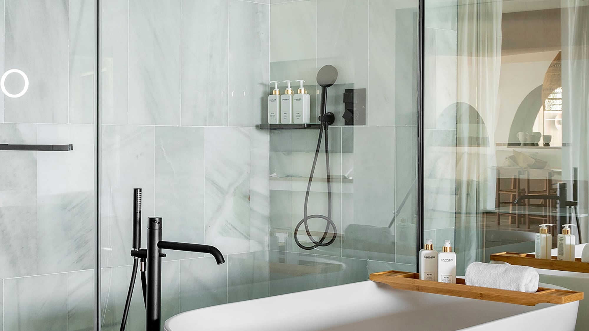 Suite with views of the Mediterranean, perfect for families and groups of friends thanks to its great spaciousness. The result of the connection of a Master Suite and a Supreme room through a fantastic terrace equipped with a bathtub, maximising space and comfort.