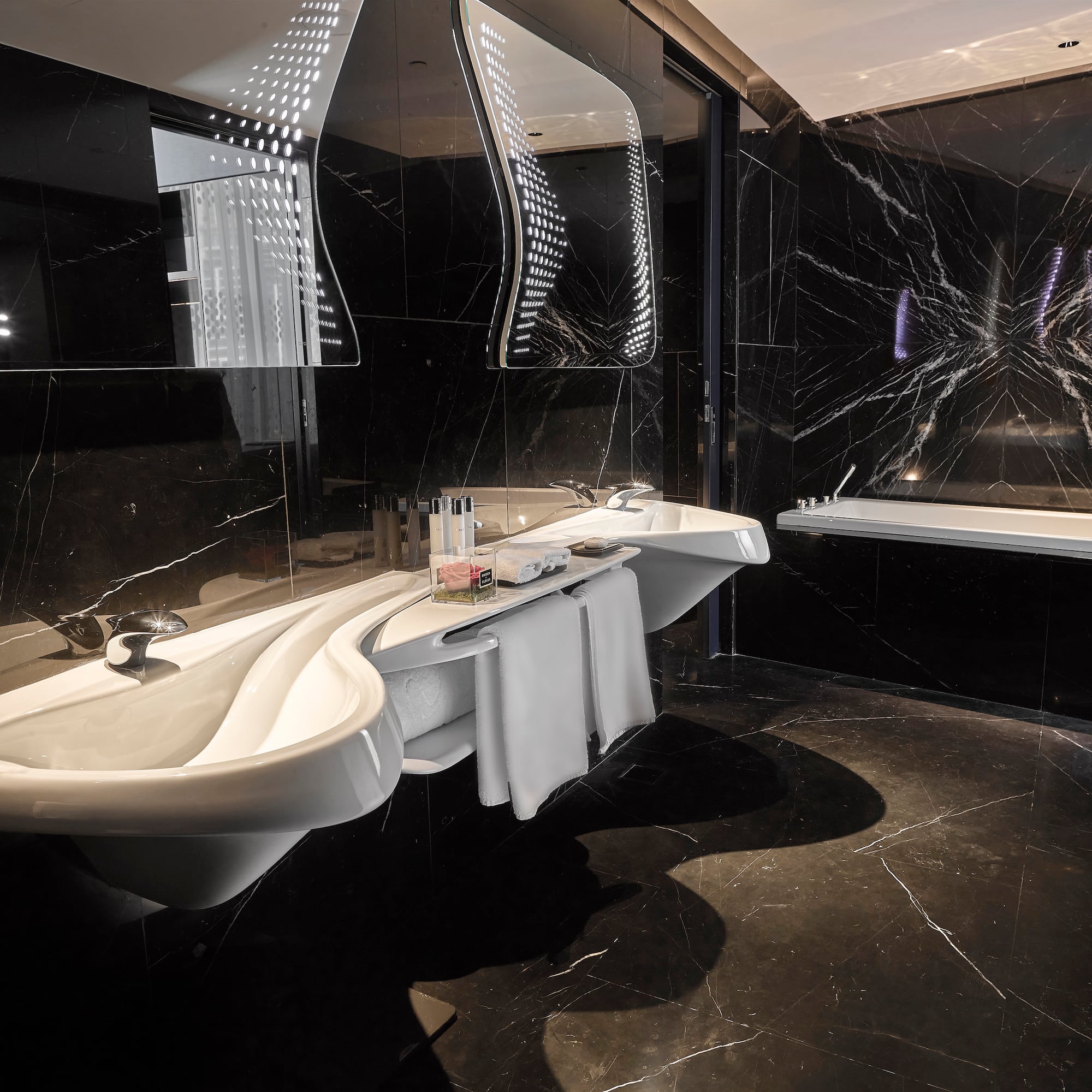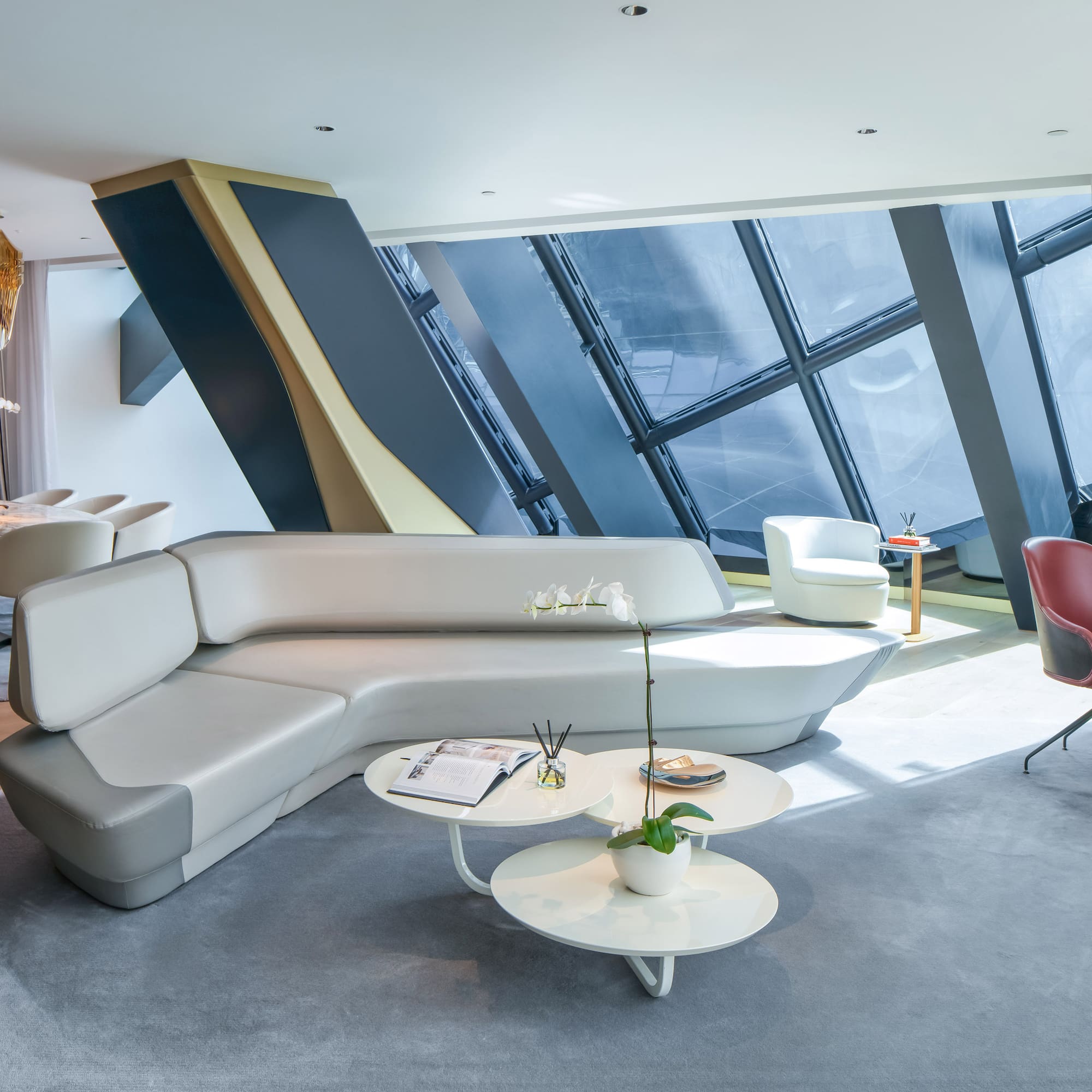 With views of the Waterfront and The Opus, this three-bedroom suite has been designed to reflect an urban lifestyle and contemporary culture. The ambient lighting and avant-garde furniture complement spaces which are ideal for leisure and relaxation.