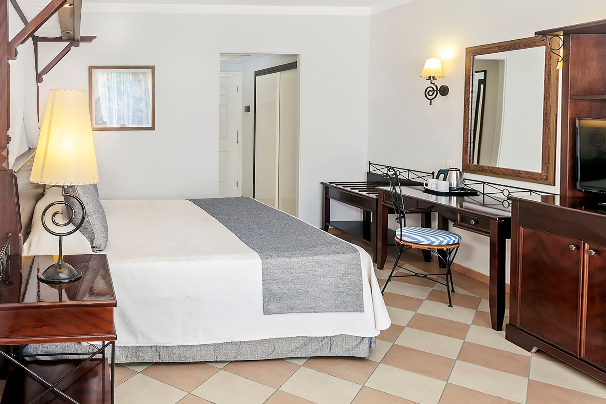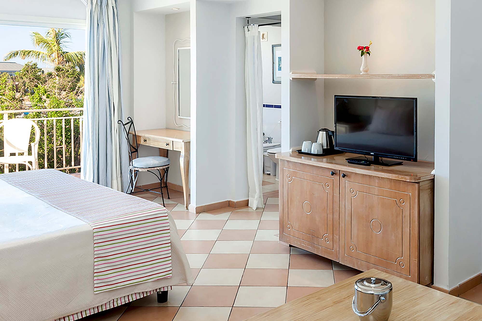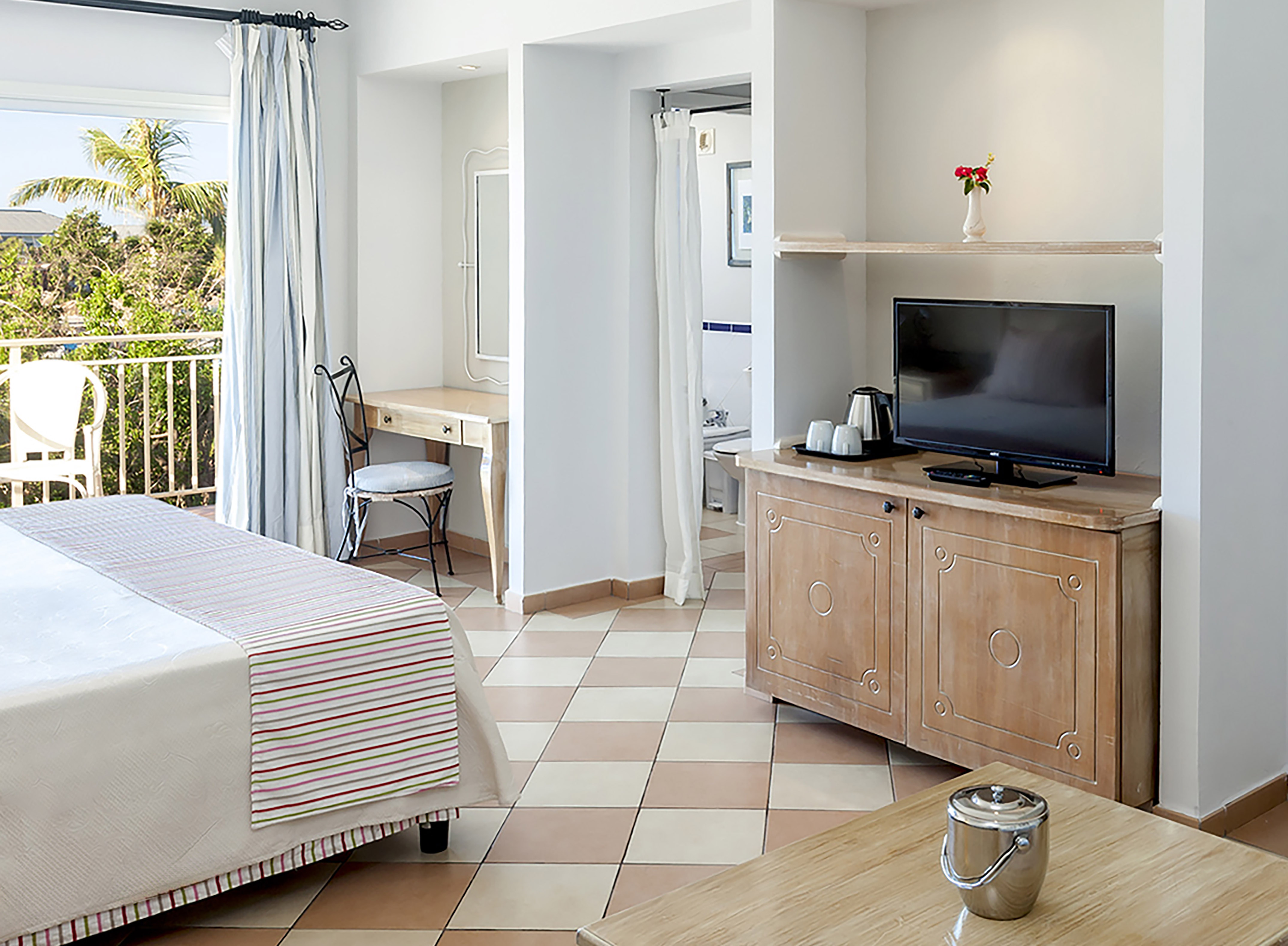 Confortable habitación compuesta por recibidor, dormitorio, baño y balcón o terraza. El cómodo mobiliario y la decoración en tonos pastel se unen a los amplios cristales que potencian el efecto de luz natural. Admite camas king-size o dobles a solicitud y según disponibilidad.