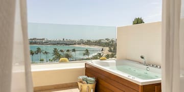 Deléitate durante tu estancia en esta suite con las magníficas vistas al mar desde sus terrazas, el complemento perfecto para tus vacaciones en Lanzarote. Relájate bajo el sol en las tumbonas y acompaña el momento con una bebida del minibar.