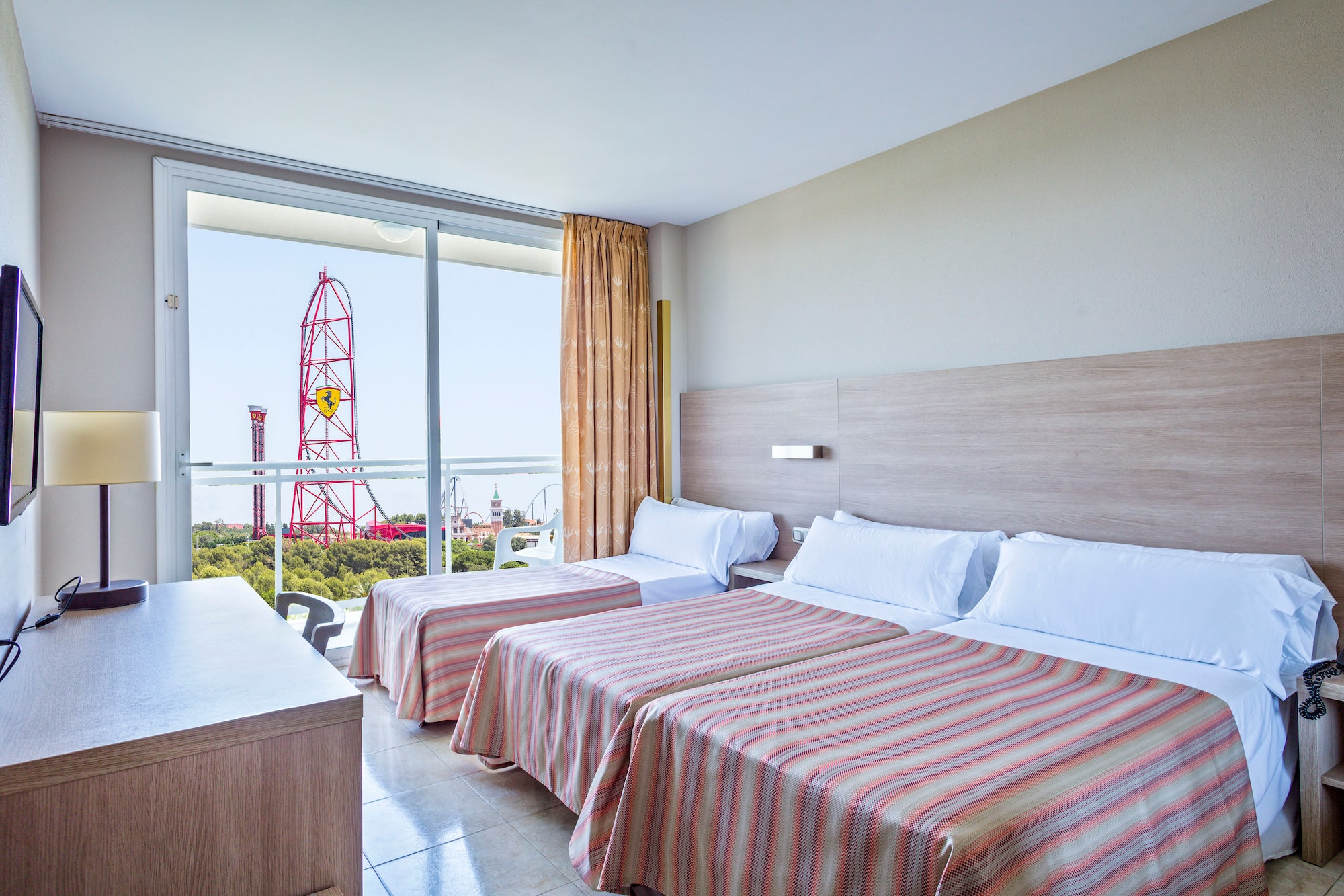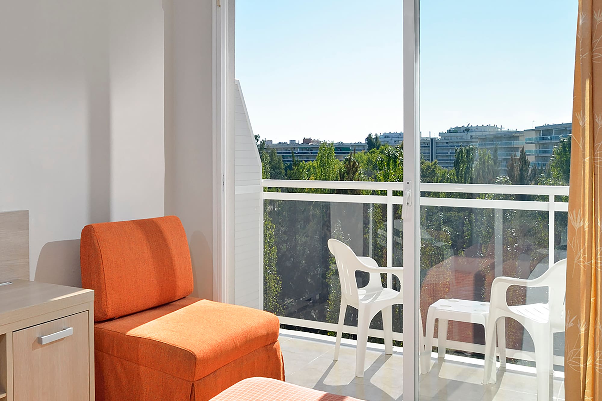 Vivid las mejores vacaciones en Salou en esta habitación con terraza y vistas a la animada piscina y a los jardines del hotel. Está equipada con una cama doble (o dos individuales), mesa de trabajo y un baño completo con bañera.
