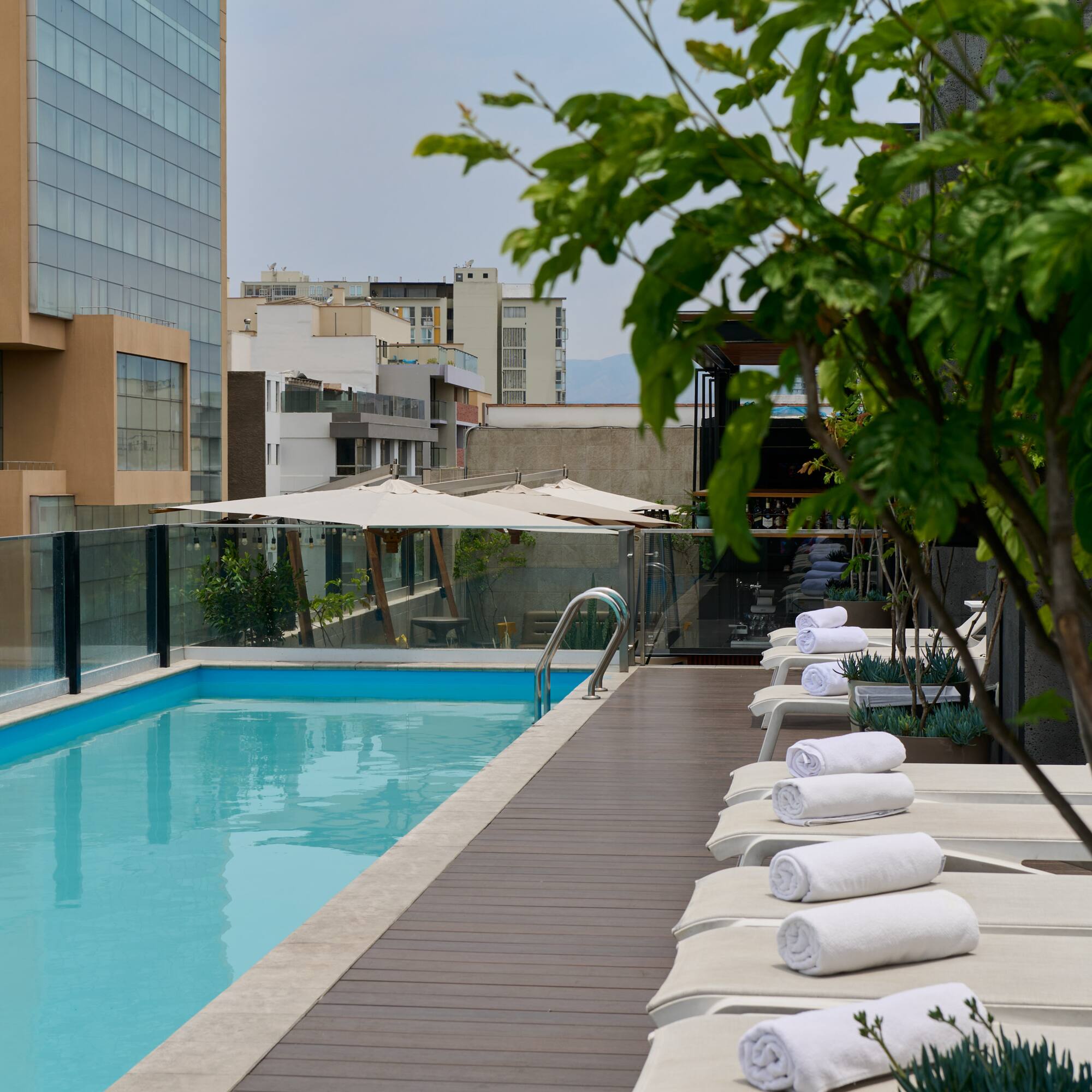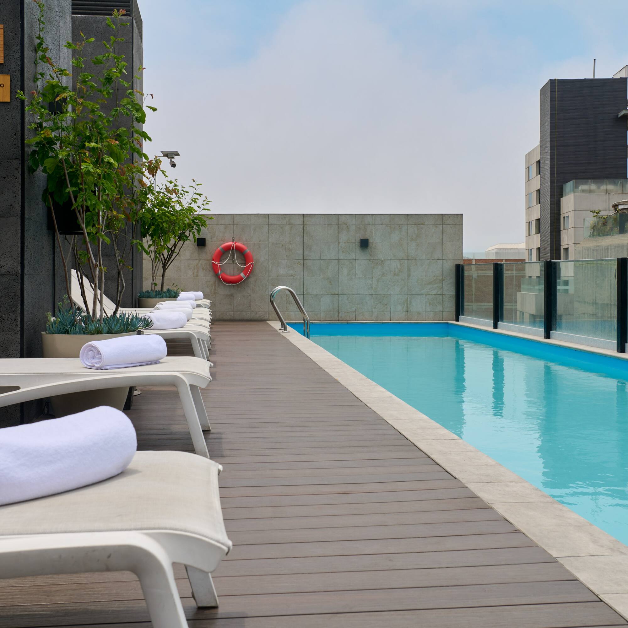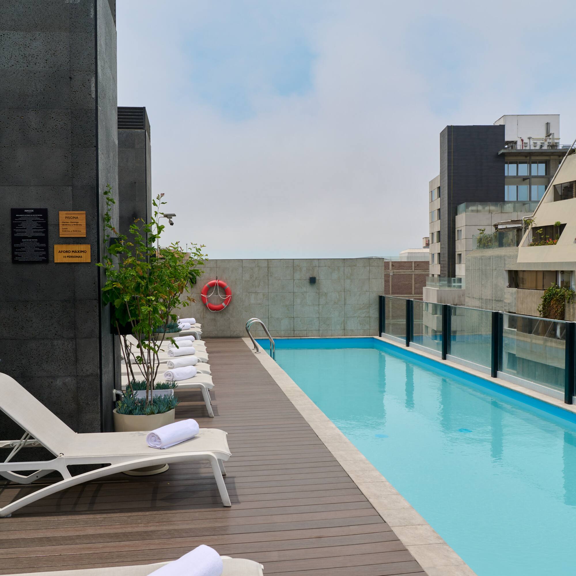 Sube a nuestra piscina de la terraza en INNSiDE Lima Miraflores. Una piscina climatizada perfecta para darte un chapuzón y sentirte como nuevo. Con servicio de toallas y acceso directo a nuestro Cataleya Rooftop Bar, para que combines tu momento relax con suculentos aperitivos, exquisitas bebidas y cócteles.