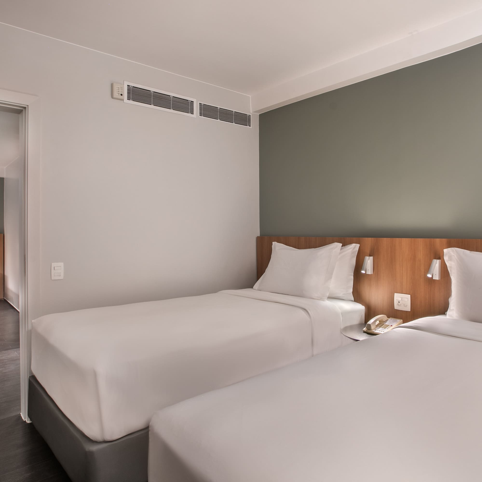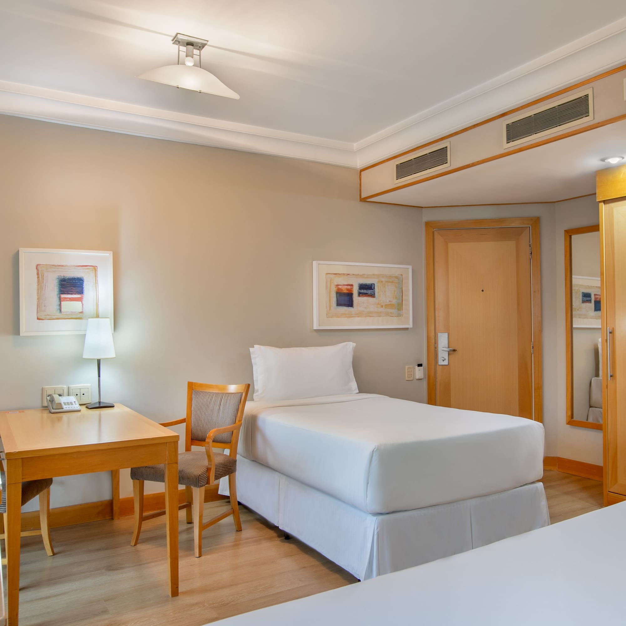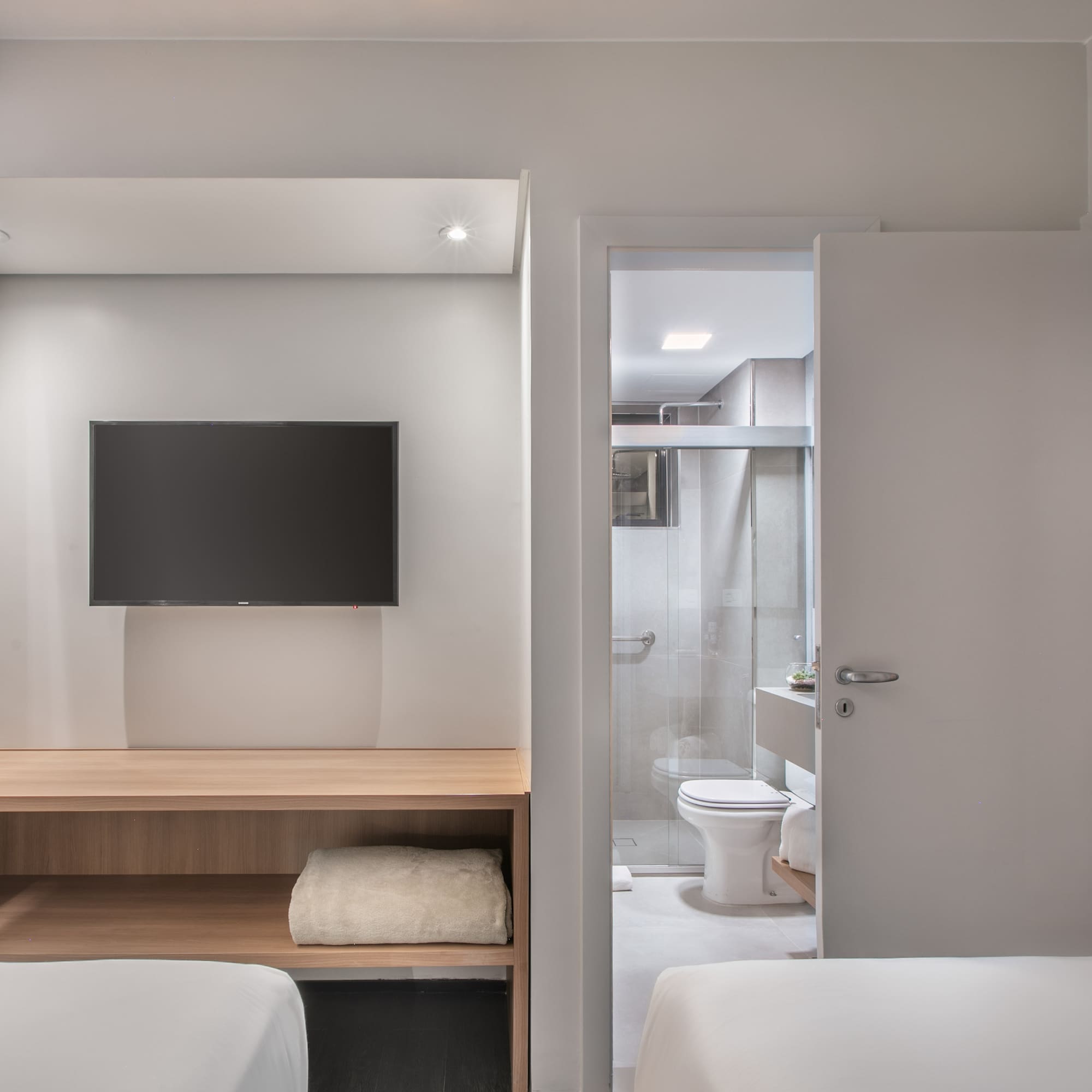 Après avoir parcouru les rues de São Paulo, il est temps de se reposer comme il se doit ! Une chambre avec balcon et une vue qui invite à rester, une salle de bains complète avec peignoir et chaussons, trois lits simples, une TV et un minibar. Que demander de plus ?