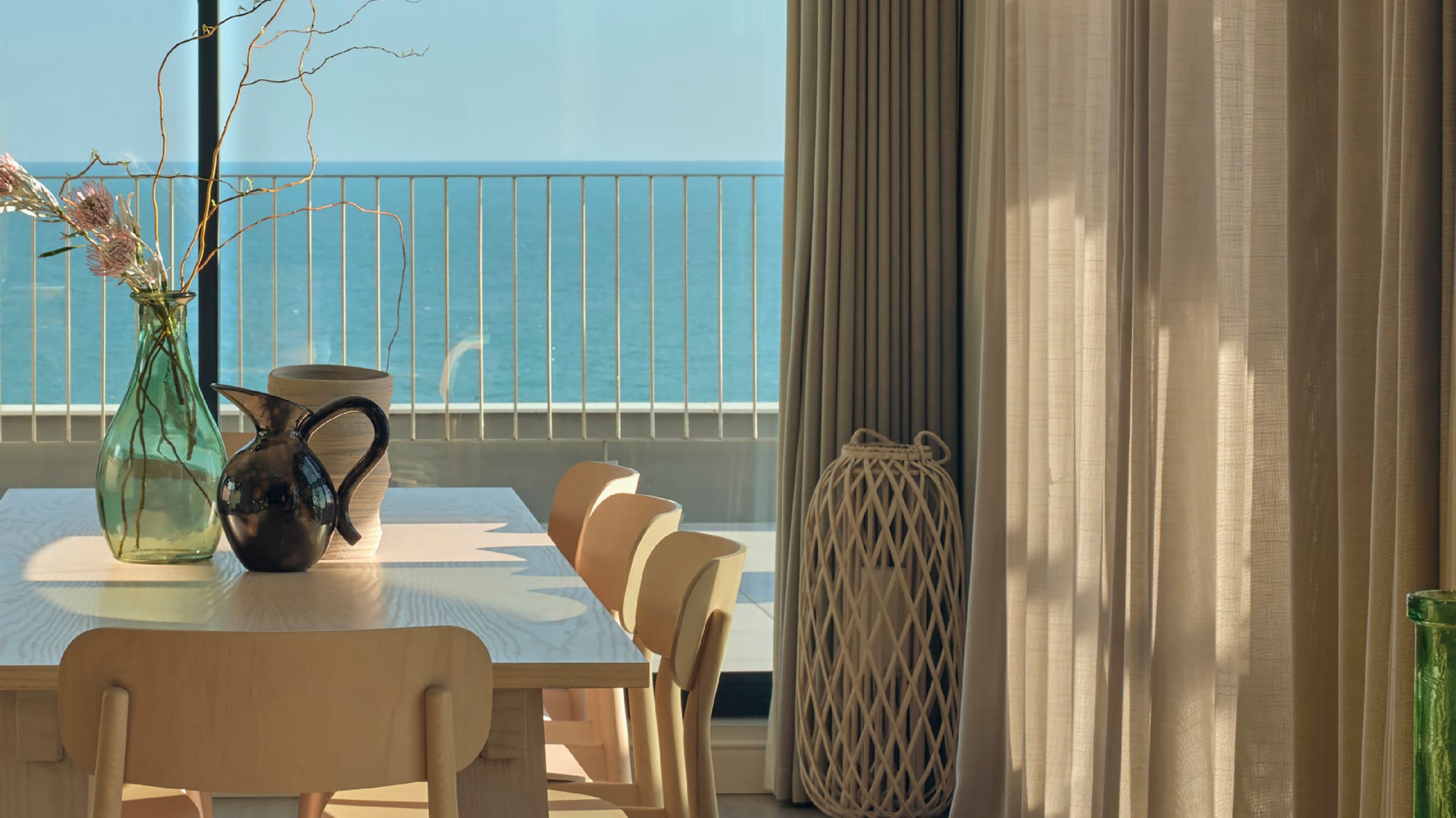 Une suite moderne décorée dans des couleurs neutres, accentuée par la lumière chaude qui entre par les grandes fenêtres dans deux espaces séparés avec la mer en toile de fond.