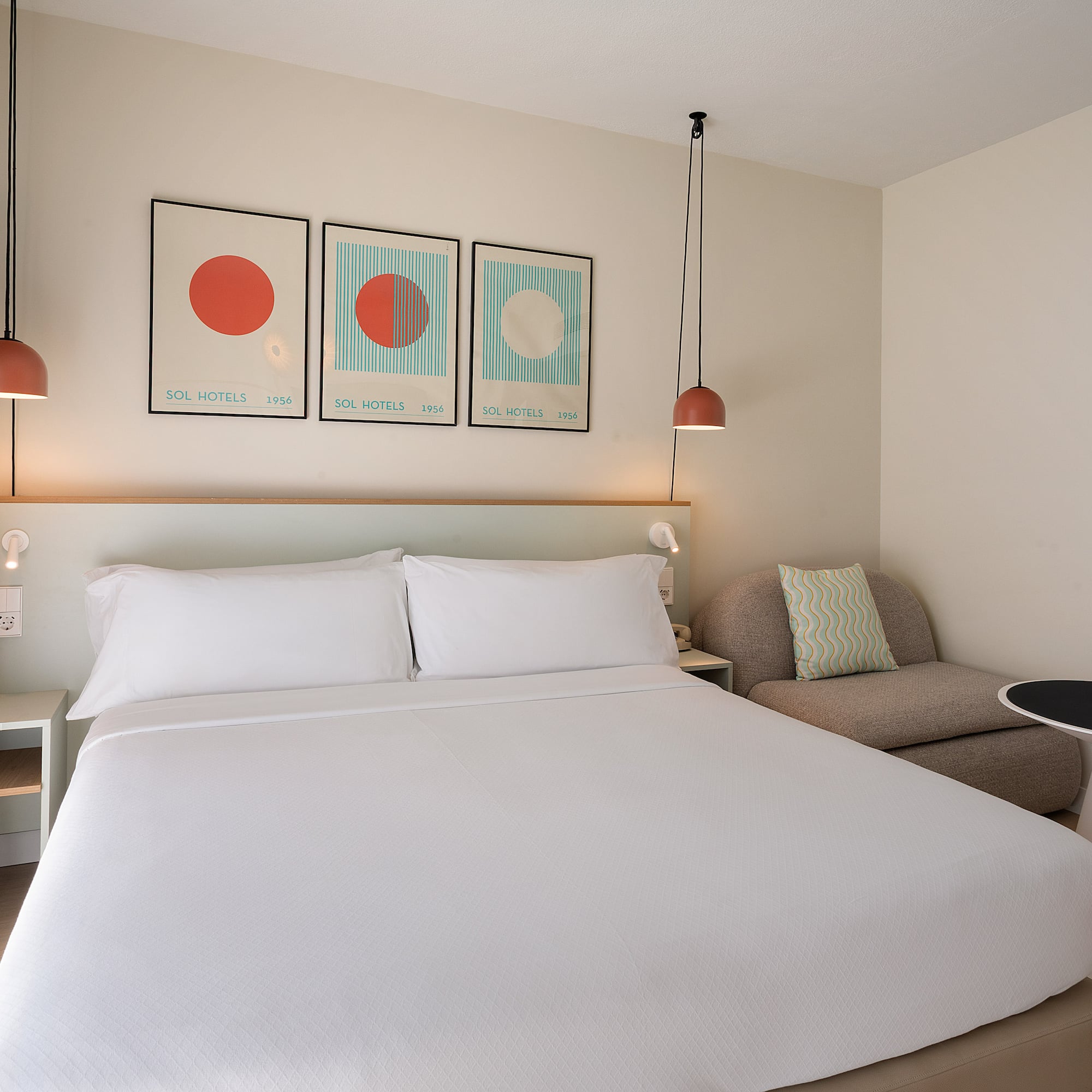 Une chambre spacieuse et lumineuse avec la meilleure vue sur la piscine en forme de lagon. Un choix fantastique pour profiter pleinement des services et du confort offerts par SOL Príncipe.