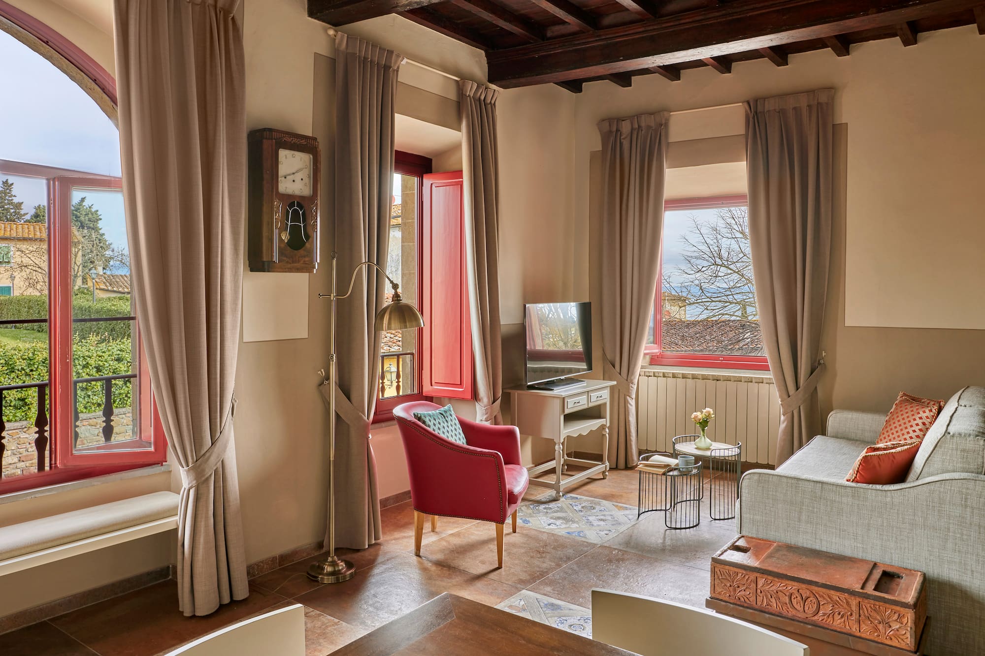 Votre voyage de rêve en Italie commence dans cette suite exclusive offrant une vue imprenable sur la campagne toscane. Située dans la ville idyllique d’Artimino (à 400 mètres de l’hôtel), elle comprend une chambre double, un salon, une kitchenette et un espace extérieur privé.