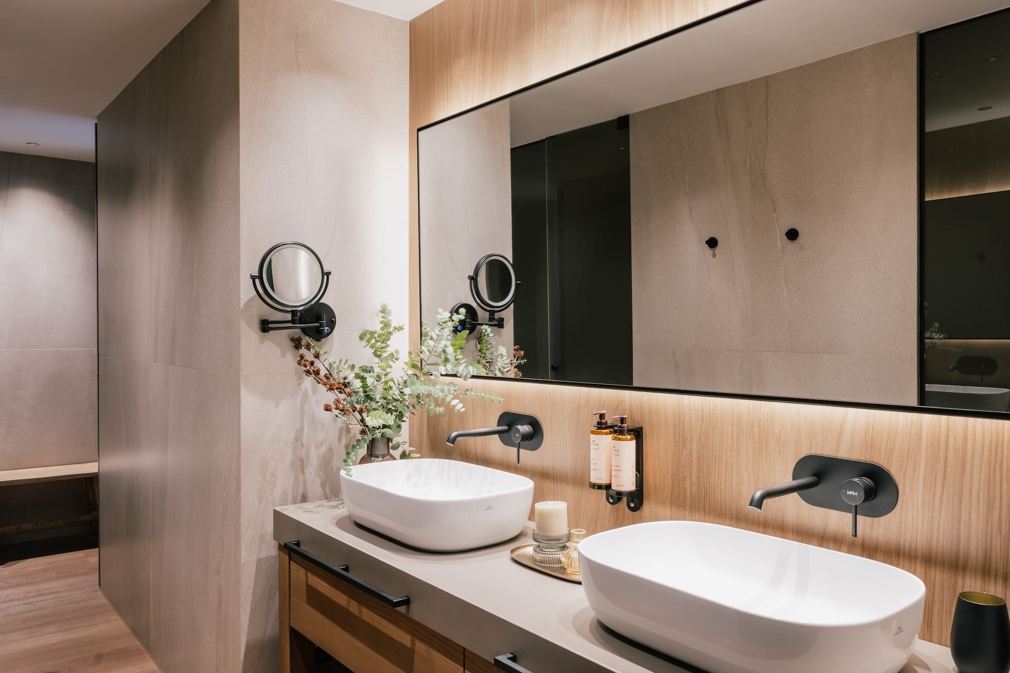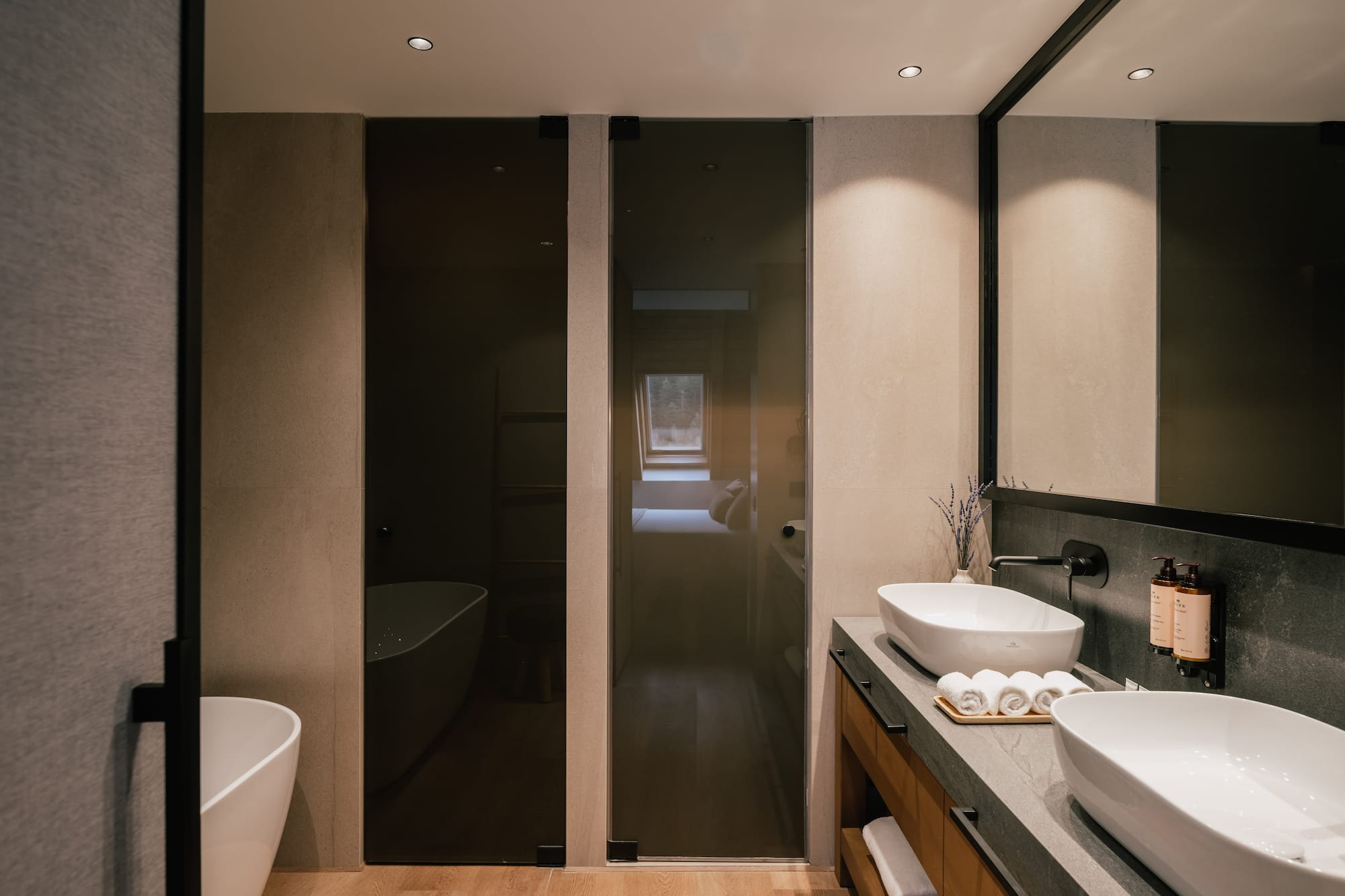 Rilassati in uno spazio in cui l'autenticità dell'ambiente si riflette nel design. Un'esperienza esclusiva a Baqueira Beret in una camera duplex a due piani con due camere da letto, due bagni, una cabina armadio, una zona soggiorno con divano letto e un minibar premium.