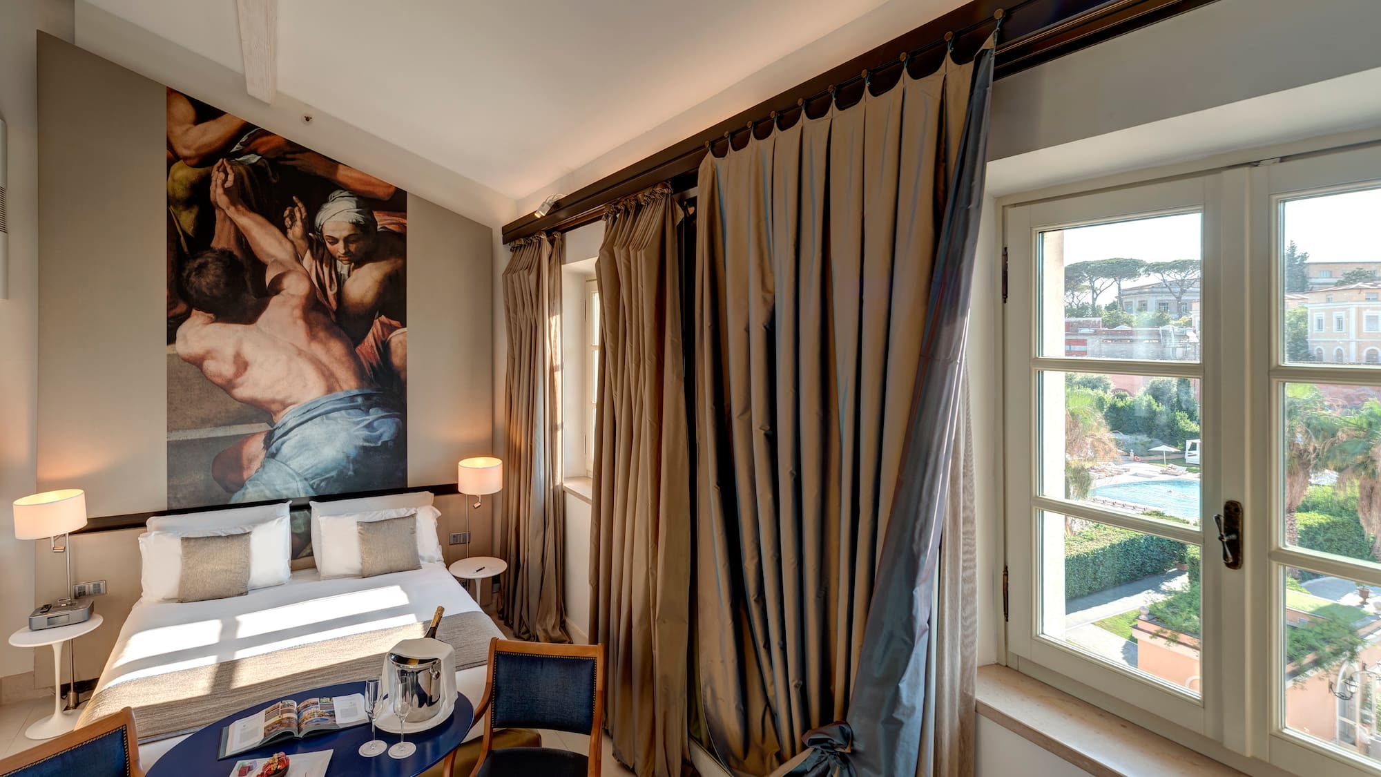 Heb je ruimte nodig? Dit is de plek voor jou! Reserveer deze luxueuze kamer met uitzicht op de stad of onze vredige tuinen en het zwembad, en geniet van designinrichting waaronder een romantisch bad, perfect om te ontspannen op een dag vol avonturen in de Eeuwige Stad.