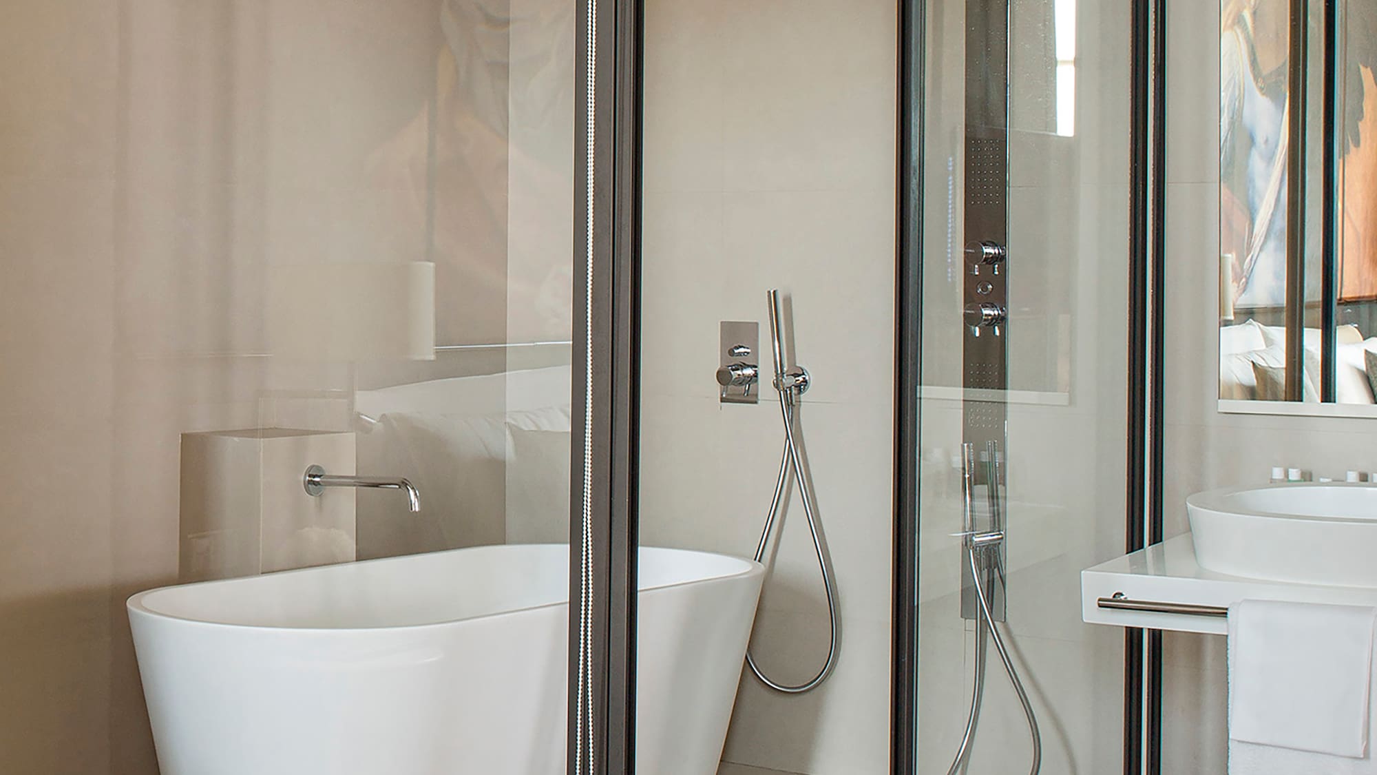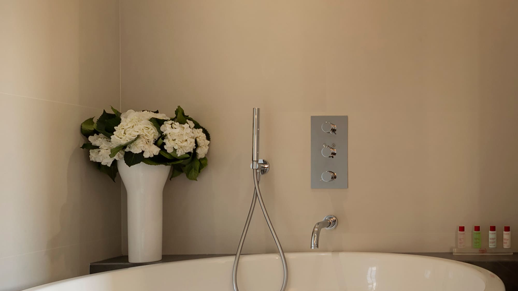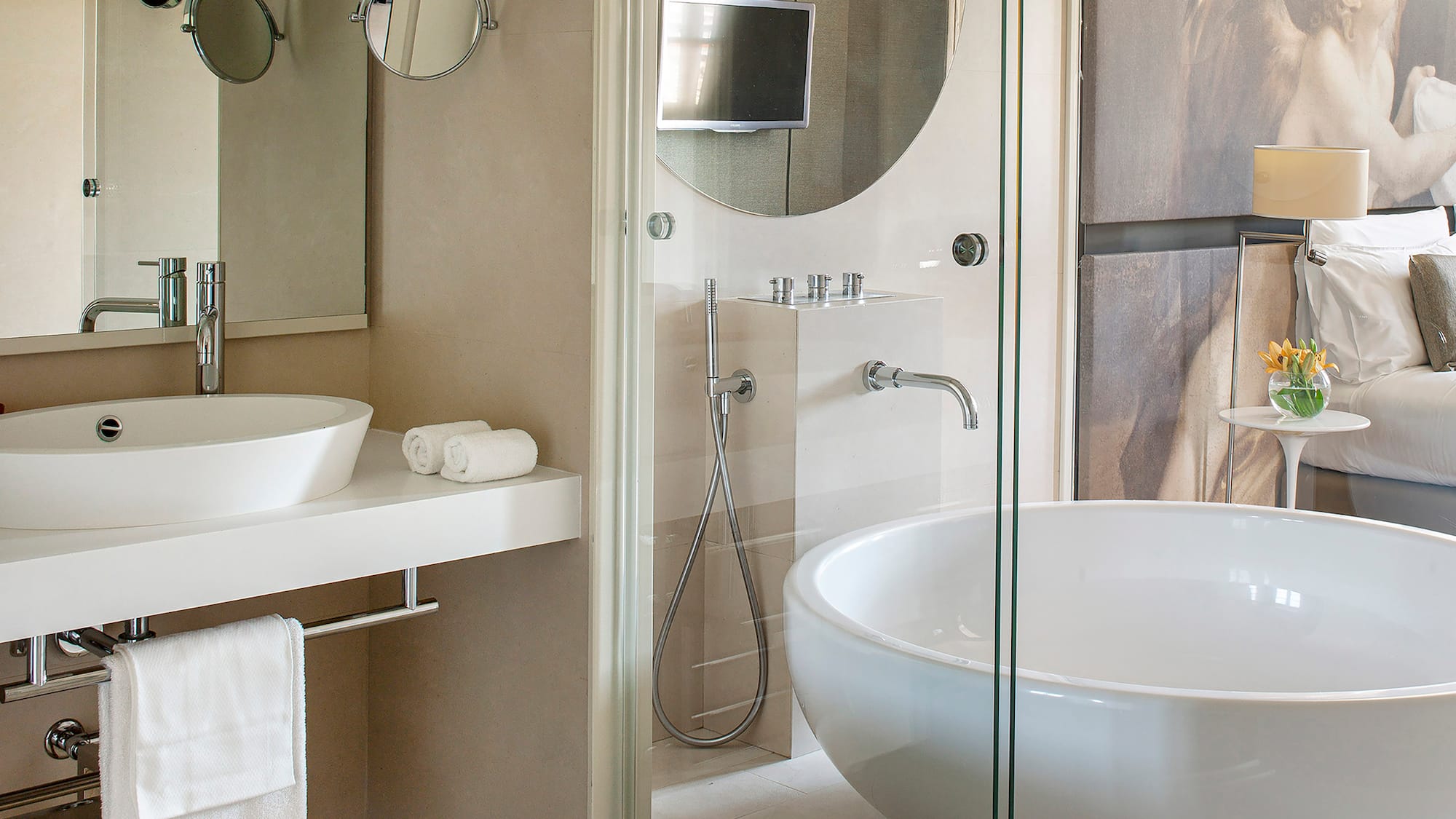 Hier komen klassiek design en moderne trends samen en vullen ze elkaar tot in de perfectie aan. Maak u klaar voor de dag in een badkamer ingericht in Italiaanse kalksteen, met een regendouche of badkuip, en bekijk de tuinen van het hotel en de straten van de stad.