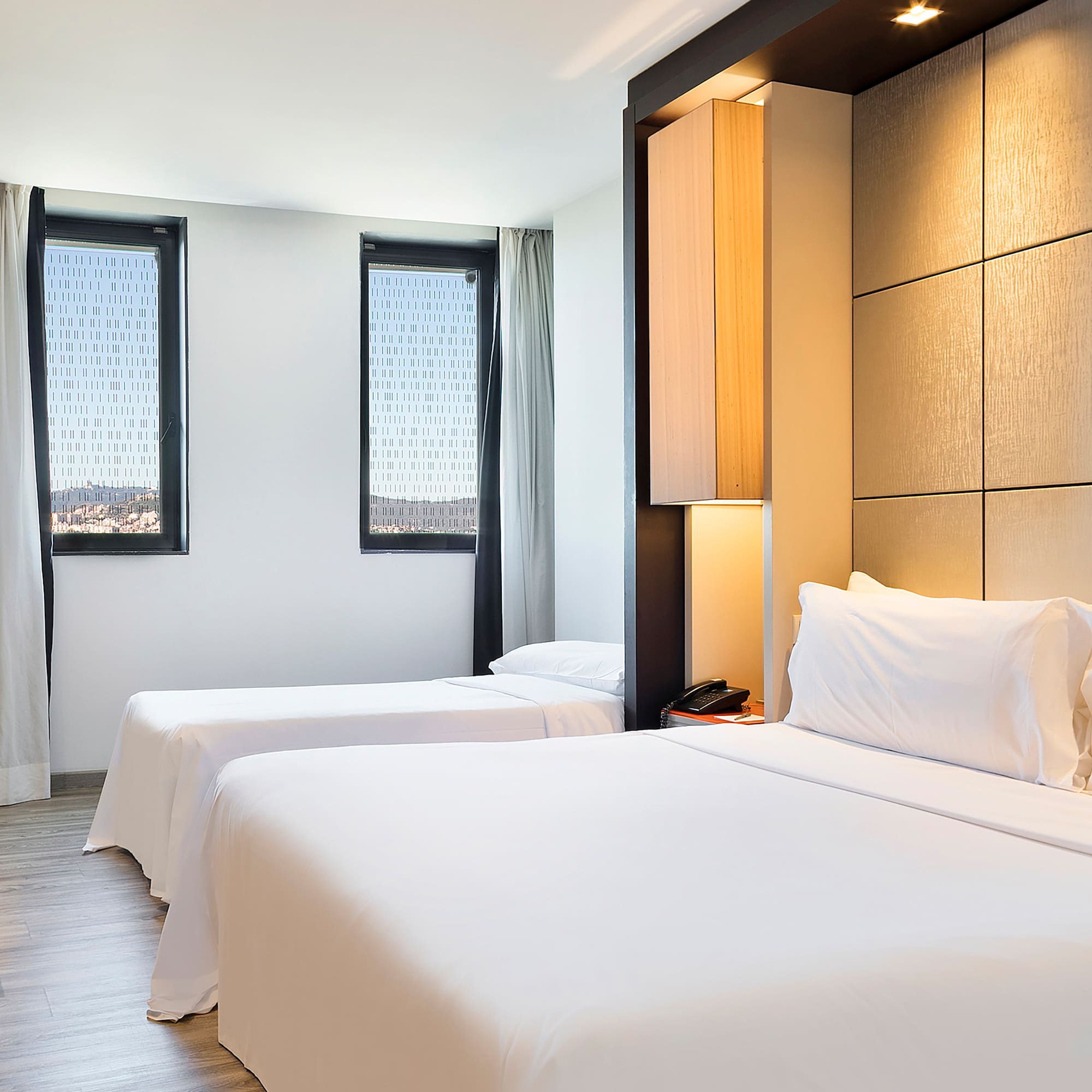 Verken Barcelona vanuit deze kamer. Met twee spaties: een lounge waar u kunt werken of ontspannen met een bank, tafel en tv, en een slaapkamer met twee bedden of een kingsizebed. Naast strijk- en koffie- en theefaciliteiten, geluidstoren, badjas, slippers en voorzieningen