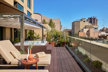 Geniet van uw gemeubileerde terras van 128 m² met een jacuzzi en uitzicht op de skyline van Barcelona. Een kamer met een aparte zitkamer met boeken en tijdschriften, waterkoker, koffiezetapparaat en maxibar (tegen betaling), en een slaapkamer met een kingsizebed. Naast een open badkamer met een vrijstaand bad en een regendouche, plus een selectie toiletartikelen van het prestigieuze Amerikaanse bedrijf Co-Bigelow.