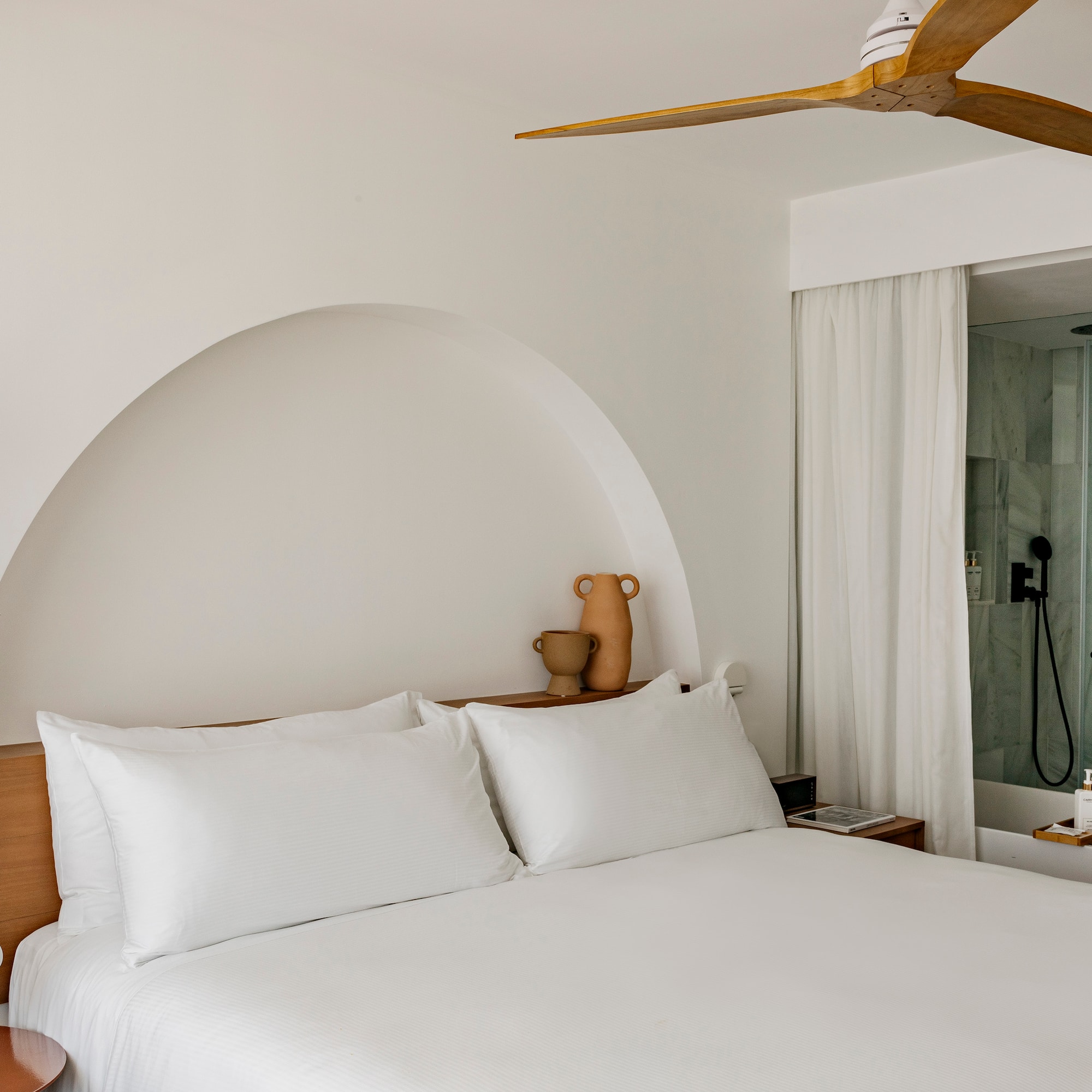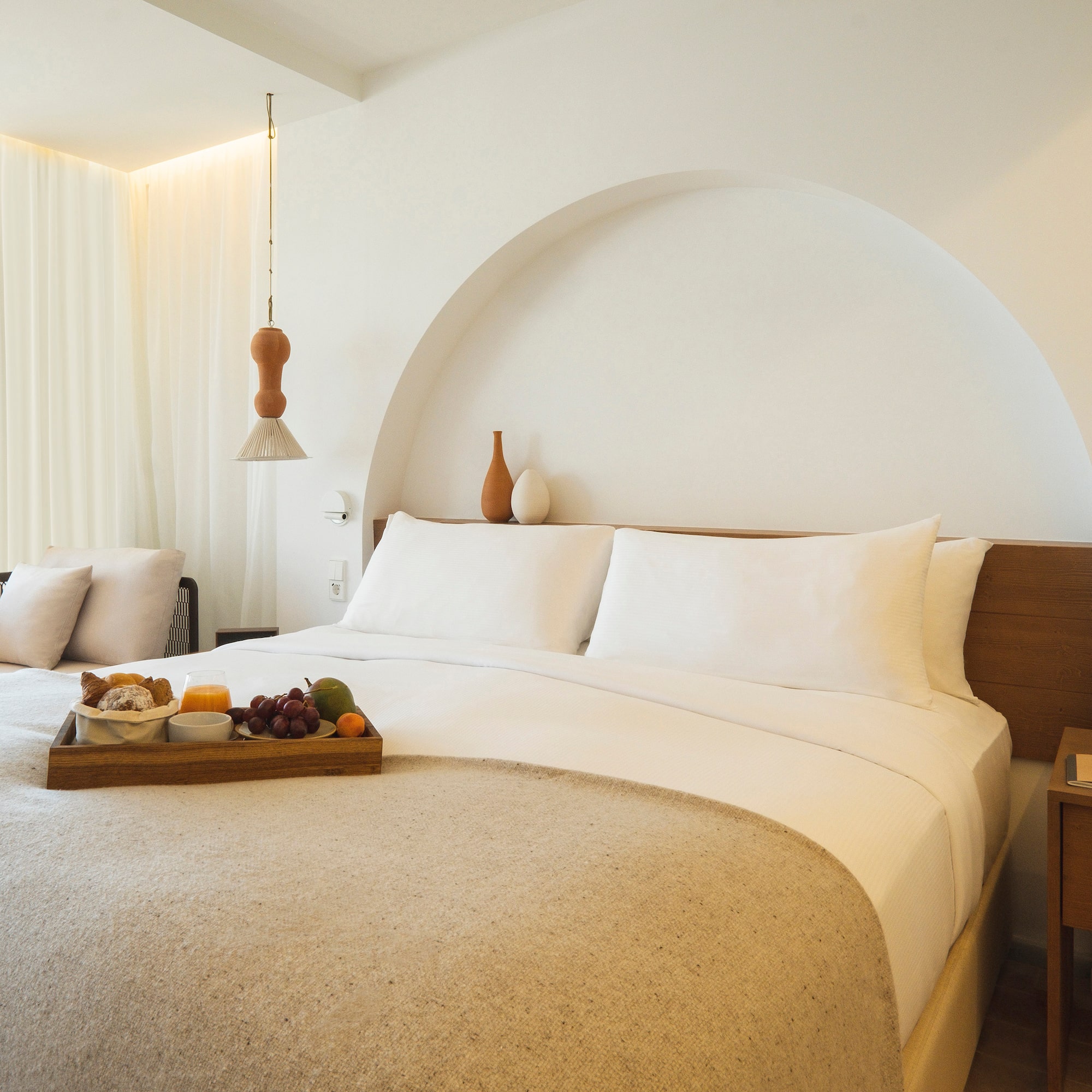 Een eerbetoon aan de elegantie en ontspanning van de Middellandse Zee in een kamer met een privéterras die uw ervaring op Menorca compleet maakt met nog meer ruimte en comfort. Geniet van een droomverblijf in deze idyllische enclave van het eiland.