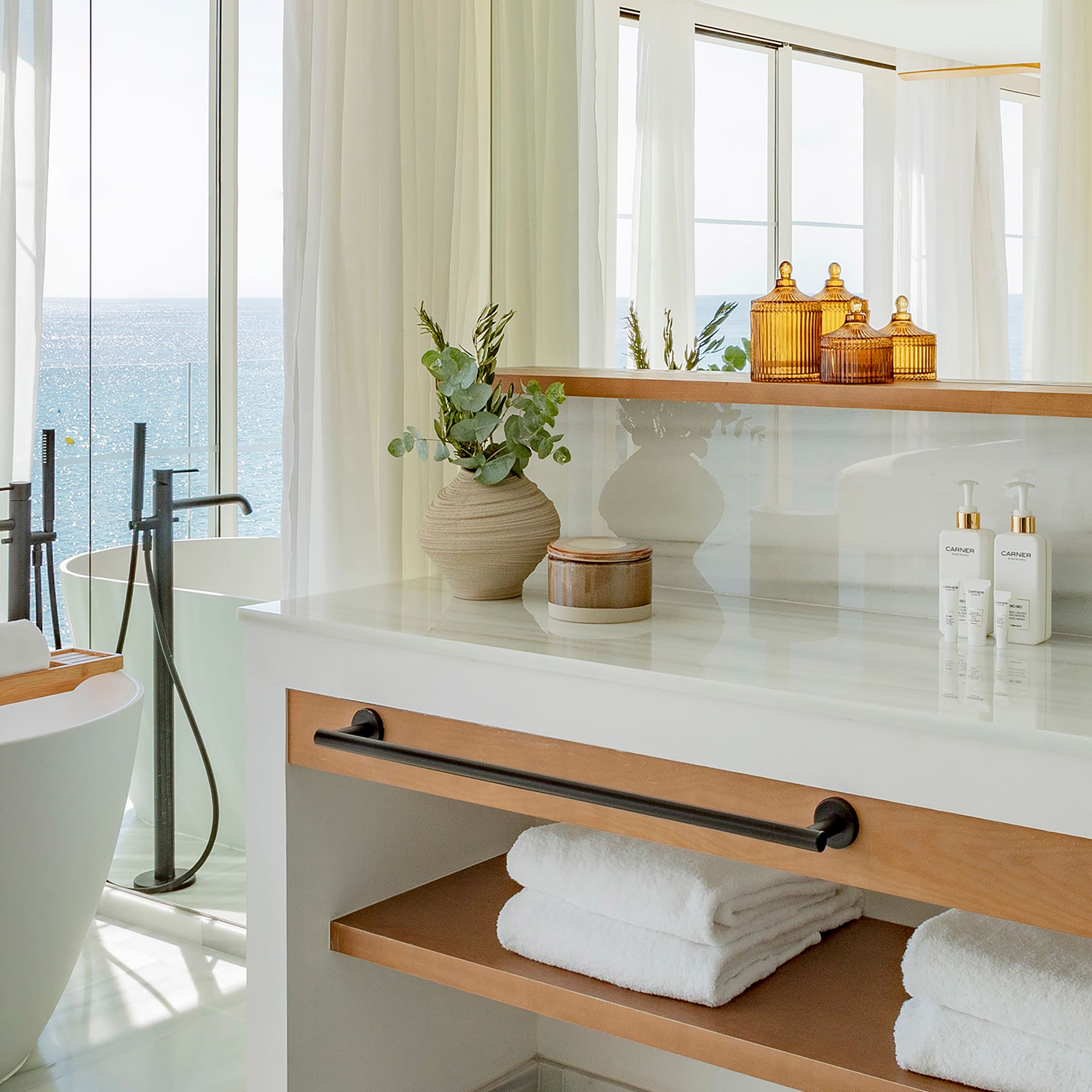 Stelt u zich eens voor dat u wakker wordt met het beste uitzicht op zee in een ruimte waar licht en mediterraan hedonisme opvallen. Deze suite stelt alle exclusiviteit van Villa Le Blanc tot uw dienst, in een kamer met een terras uitgerust met ligbad waar sereniteit en ontspanning de boventoon voeren.