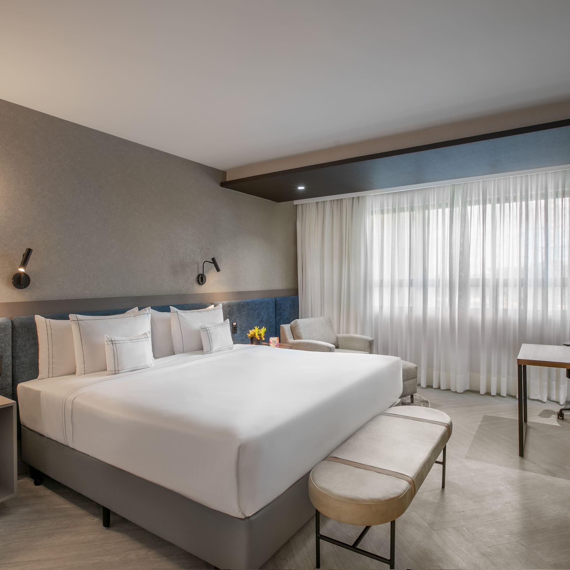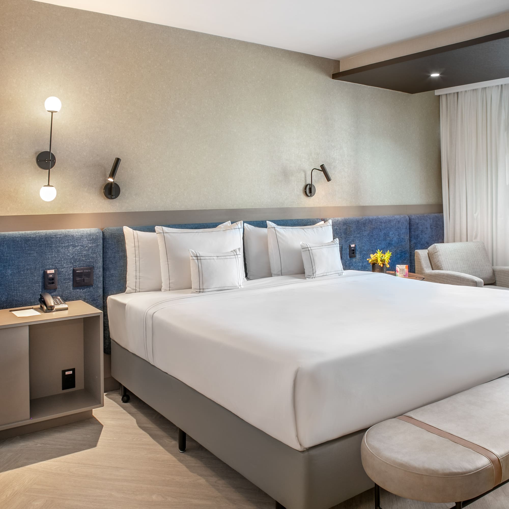 Design, elegância e modernidade se somam em um espaço onde você pode relaxar, se desconectar ou trabalhar. Cama King Size superconfortável, TV Smart de 50 polegadas e escrivaninha espaçosa. Tudo o que você precisa para sua viagem a Brasília.