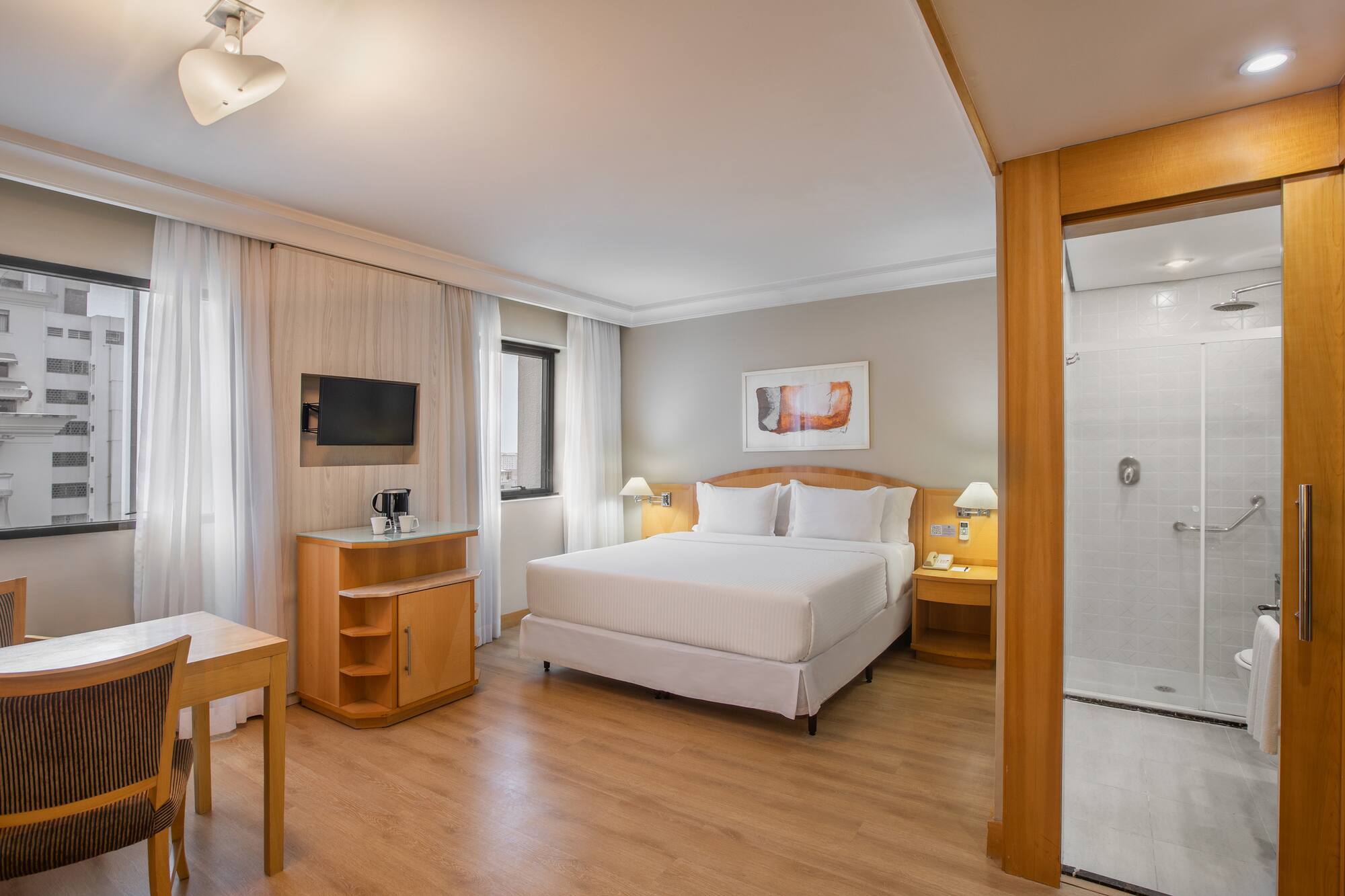 Quer acordar com Higienópolis aos seus pés? Aqui você desfrutará de uma vista encantadora a partir da varanda privativa, da cama, da poltrona ou da escrivaninha. Além disso, você contará com frigobar, roupão, chinelos e um banheiro completo para o seu conforto.