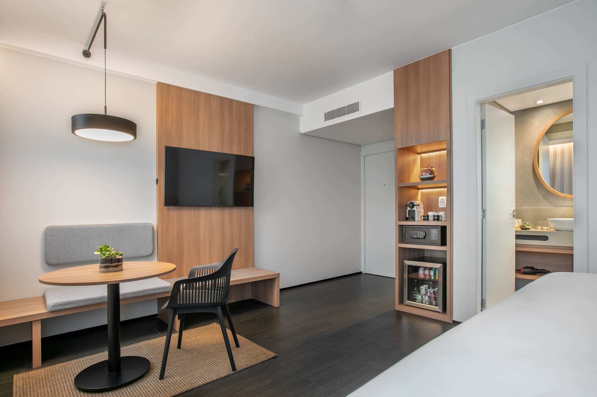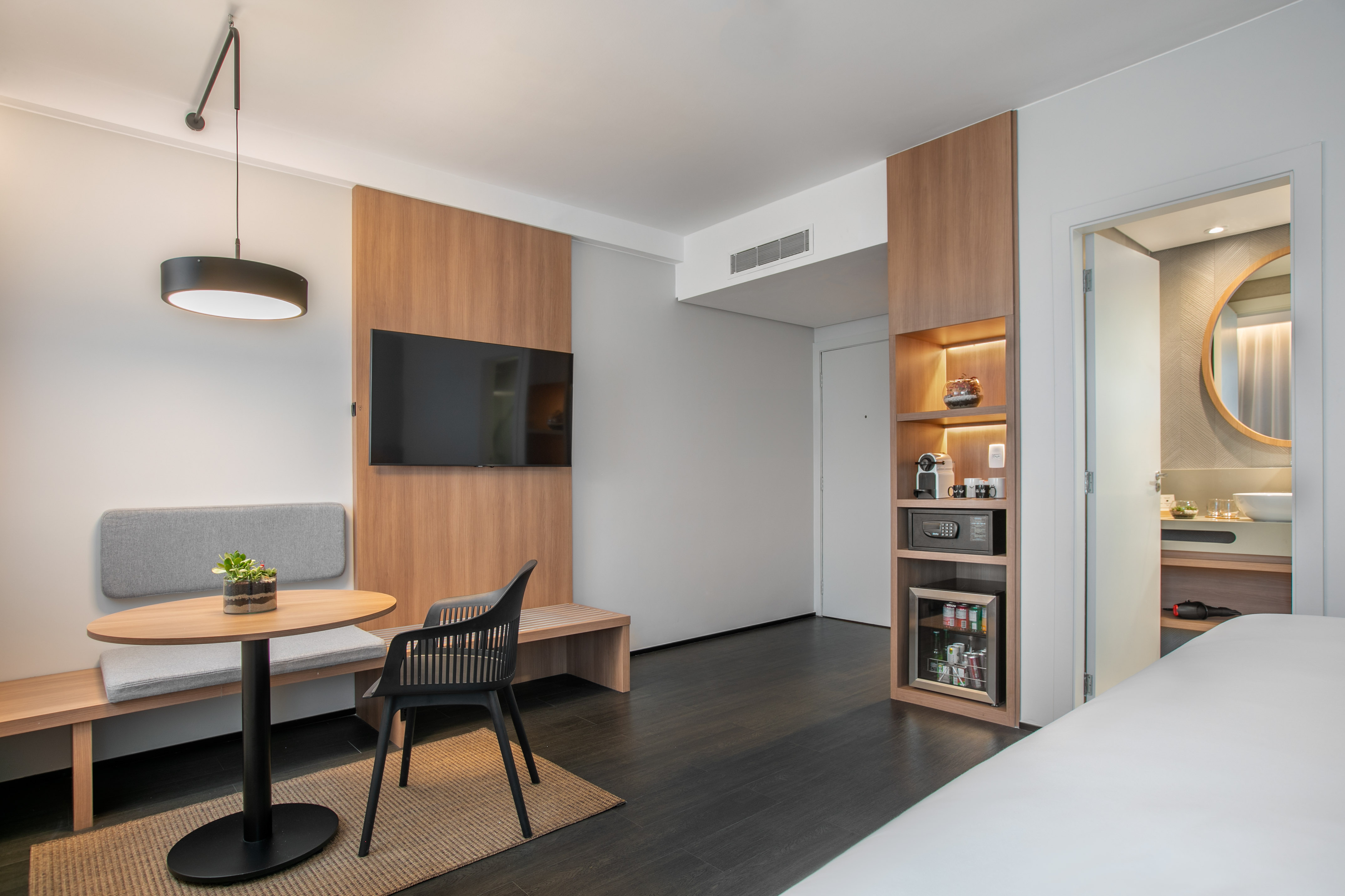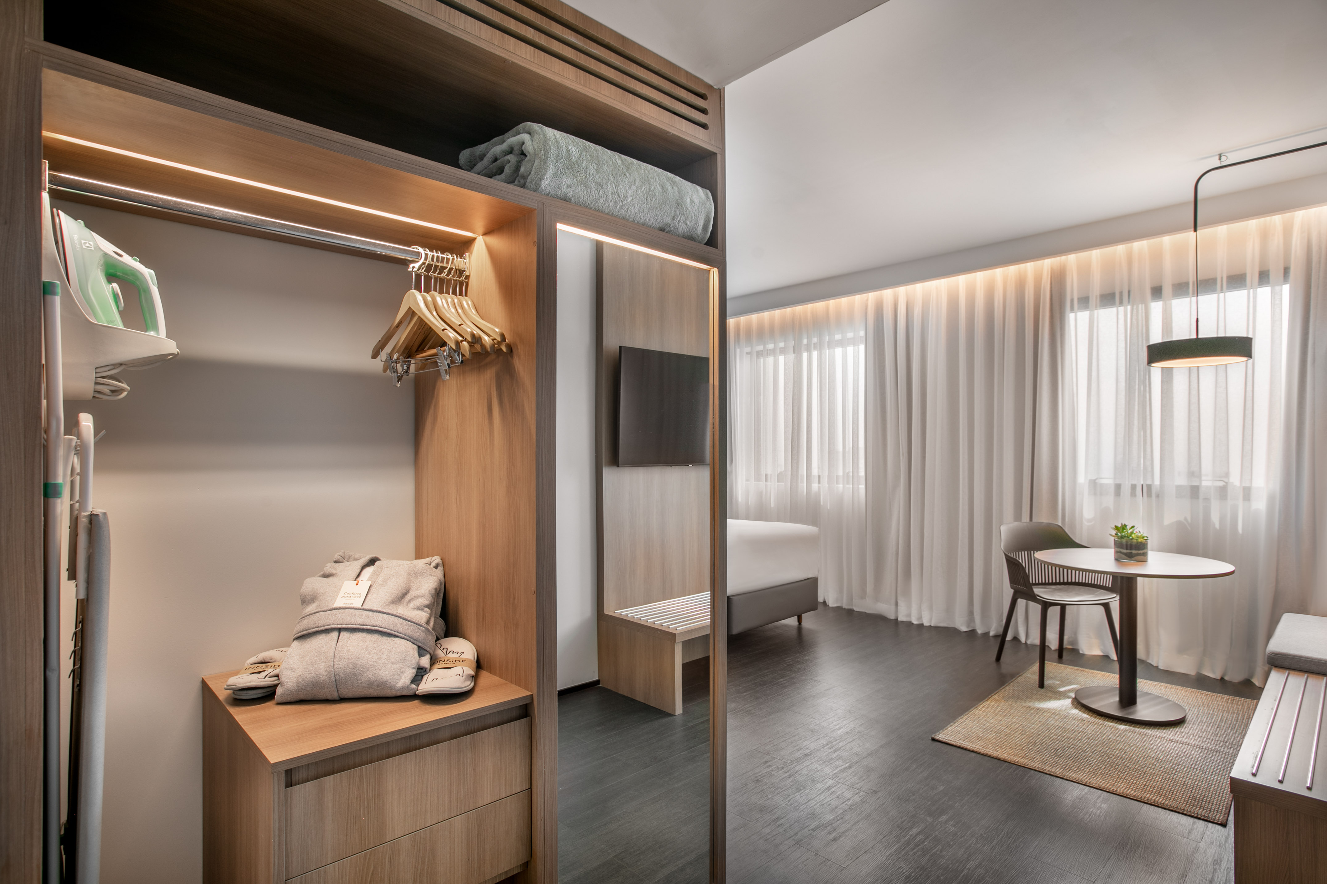 Uma cama de casal envolvente, minibar para os desejos, e chaleira com chás e cafés para noites longas ou manhãs preguiçosas. Roupão, chinelos, artigos de higiene e TV para ficar no modo "não incomodar". E se decidir se arrumar... também há ferro de passar.