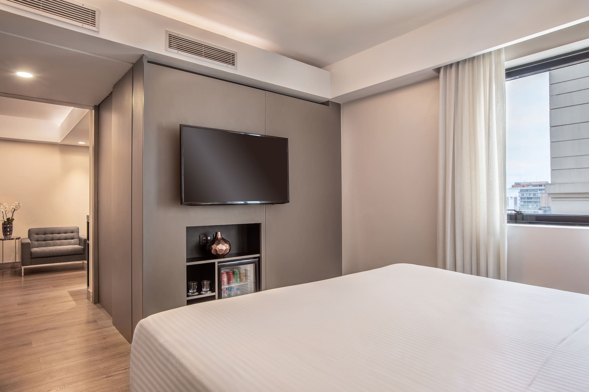 O equilíbrio perfeito entre exclusividade, conforto e espaço. Uma suíte supermoderna com duas áreas independentes separadas por portas de correr, pensada para tornar sua estadia em São Paulo inesquecível. Que quarto!