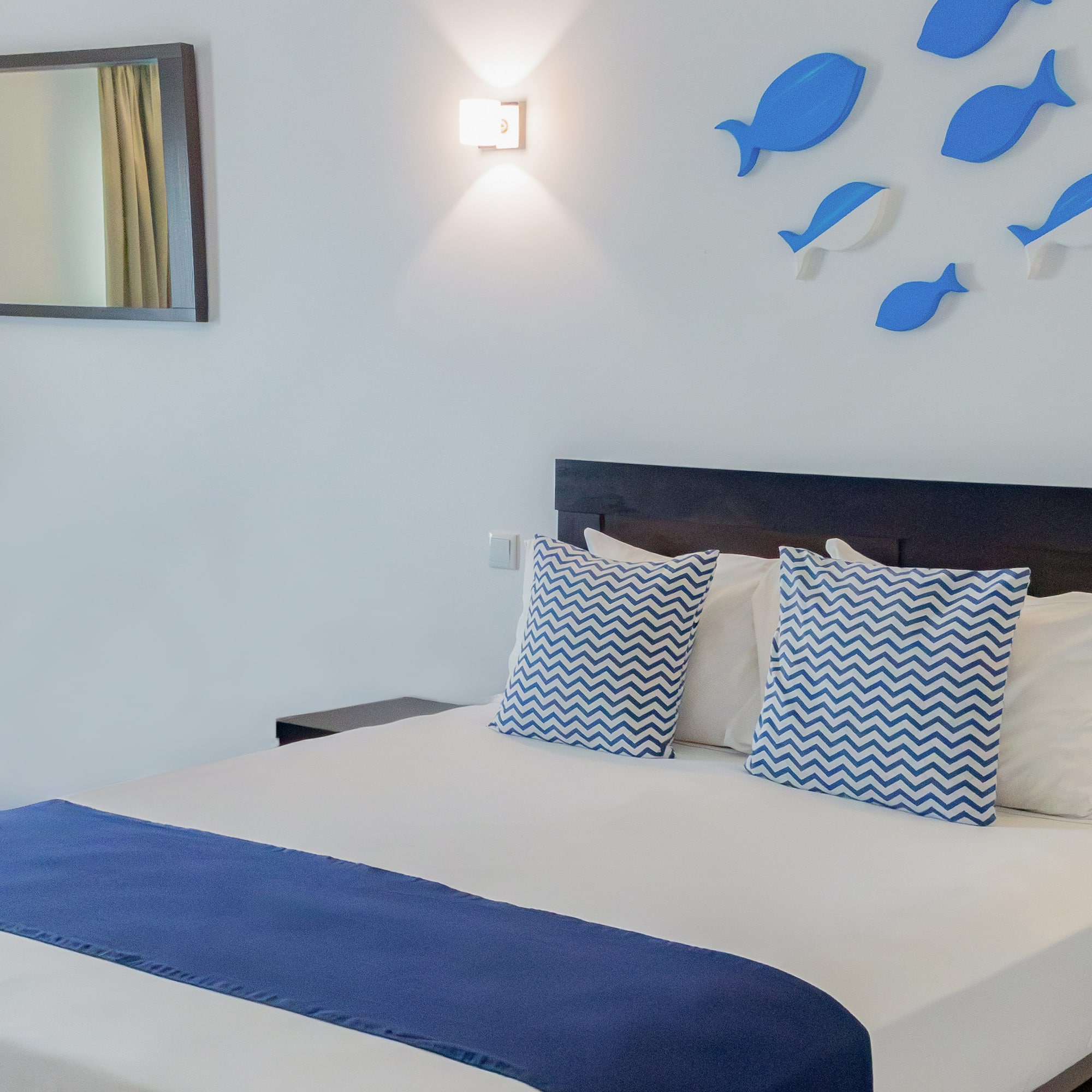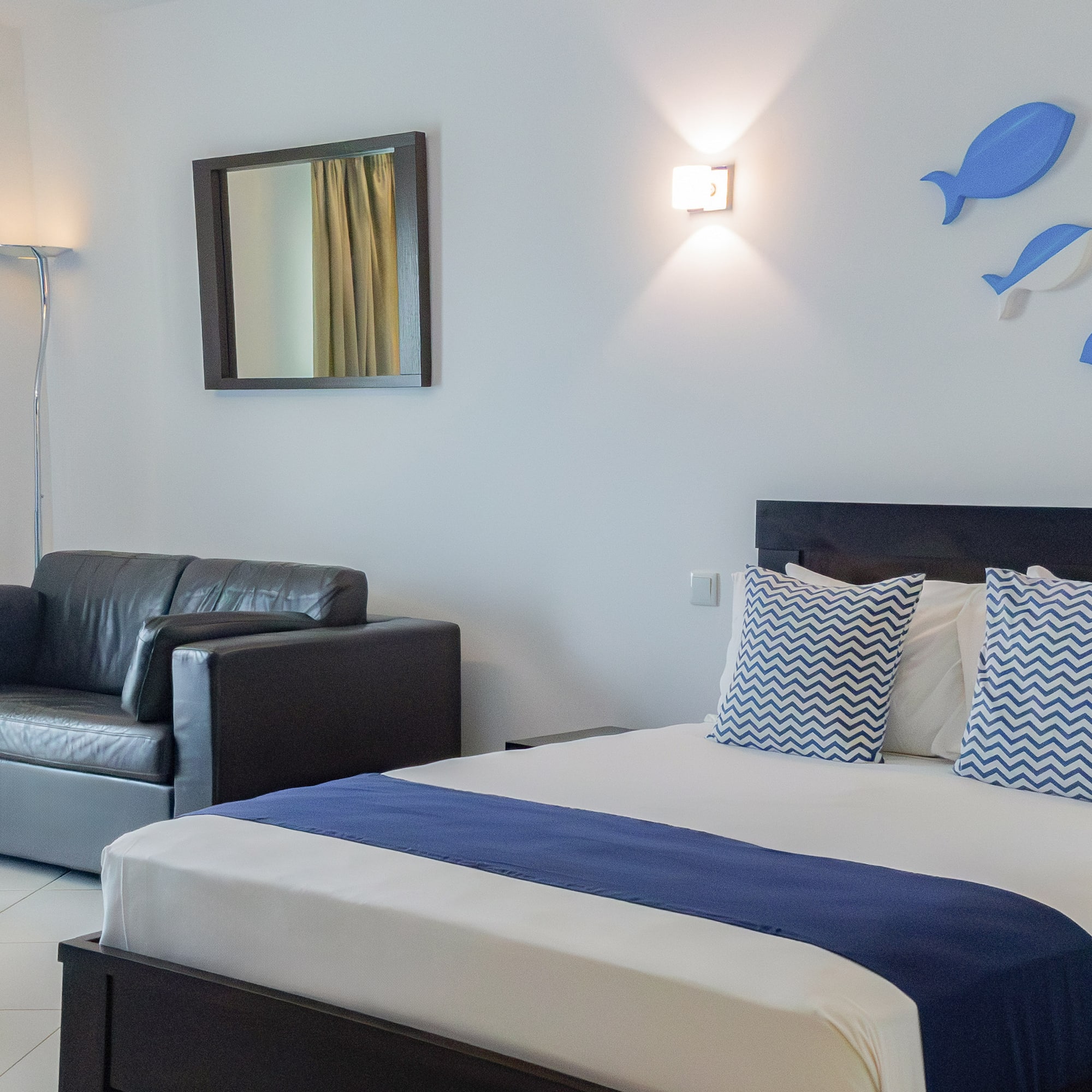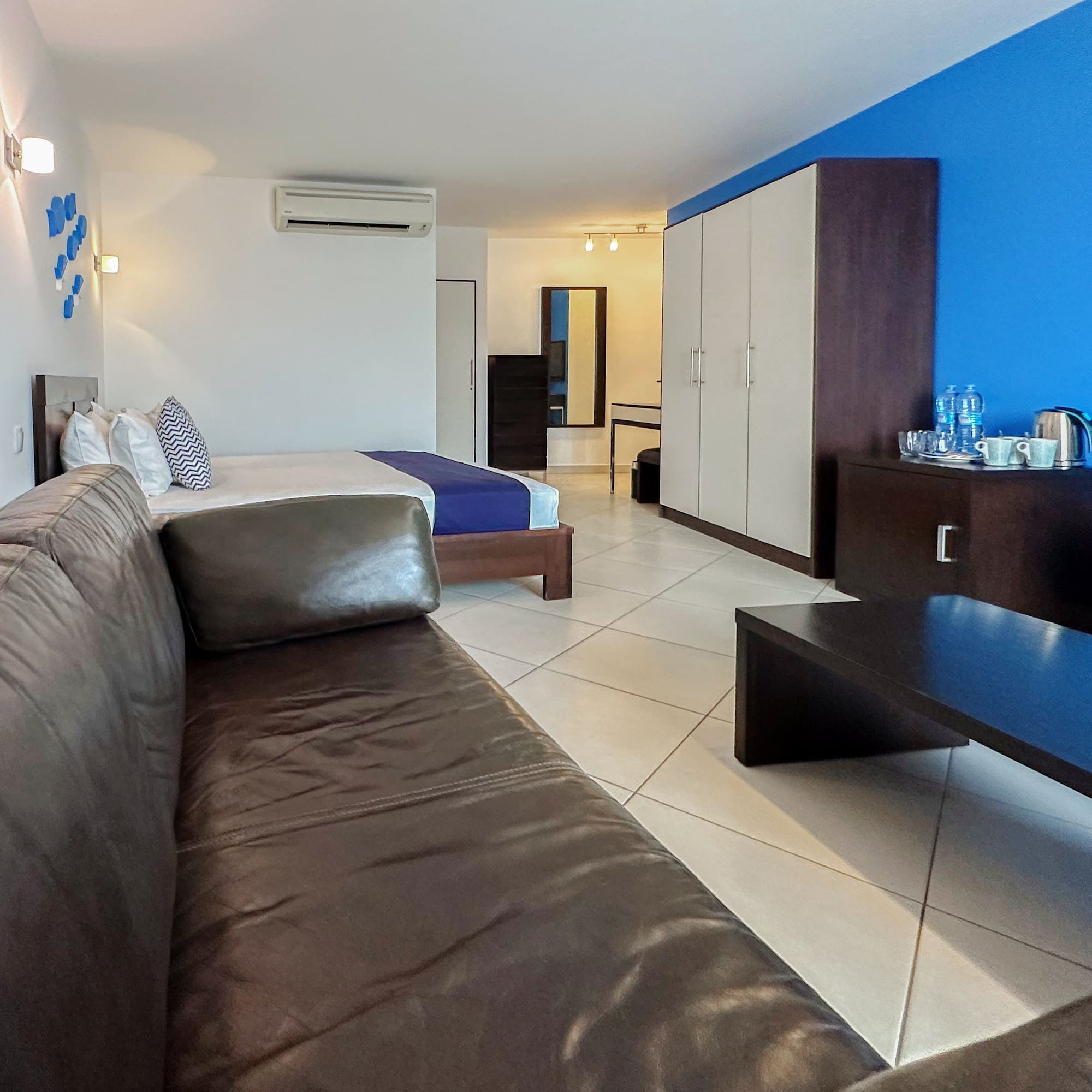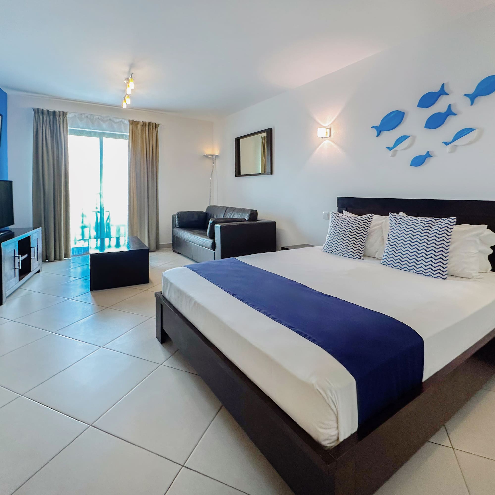 O seu refúgio na Isla de Sal começa aqui: com um design moderno que combina frescura e conforto, uma cama de casal que convida ao descanso, ar condicionado para o acompanhar a qualquer momento e uma televisão de 42 polegadas para fazer uma pausa.