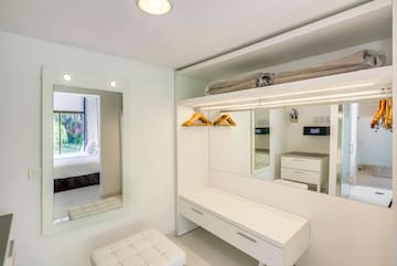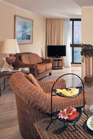 À beira-mar, este quarto oferece uma vista espetacular do mar. Descanse confortavelmente com uma bebida do seu frigobar na sacada ou na pequena sala de estar com sofá.
