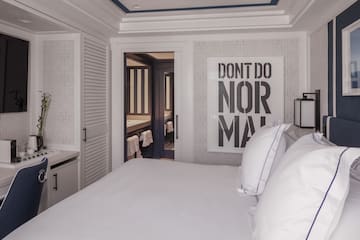Um enorme terraço de 23m2 coroa os quartos com vista para o Mediterrâneo. Espaçoso e luminoso, tem uma cama king-size e um salão com sofá. Detalhes náuticos com detalhes em branco e azul adicionam um acabamento único.